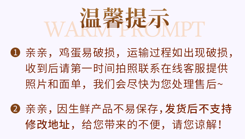 ④到货后,先签收,请在24小时内把快递单和坏鸡蛋放一起拍照,如果损坏超过1/2,我们将按照“付款价格÷个数×损坏数量=赔付的金额”标准进行赔付