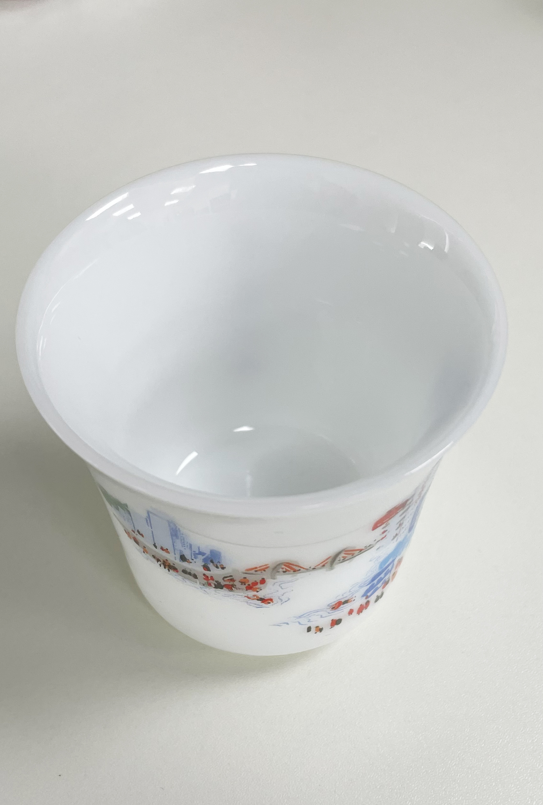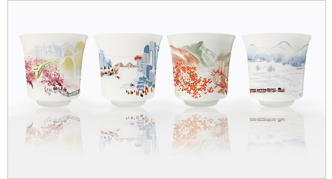 《山城四季品茗杯》是一款以重庆四季美景为主题的陶瓷品茗杯系列。该系列产品通过精心的设计,将春天的列车、夏日的江畔、秋天的红叶和冬日的雪景巧妙地融入到每一款茶杯之中。
