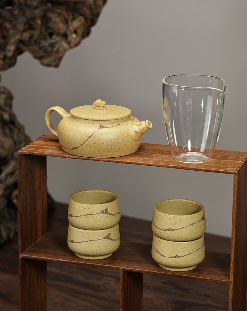 与壶配套的紫砂杯和玻璃公道杯不仅美观实用,还能让你每一次倒茶都如行云流水,每一次品饮都沉醉于那细腻的口感。