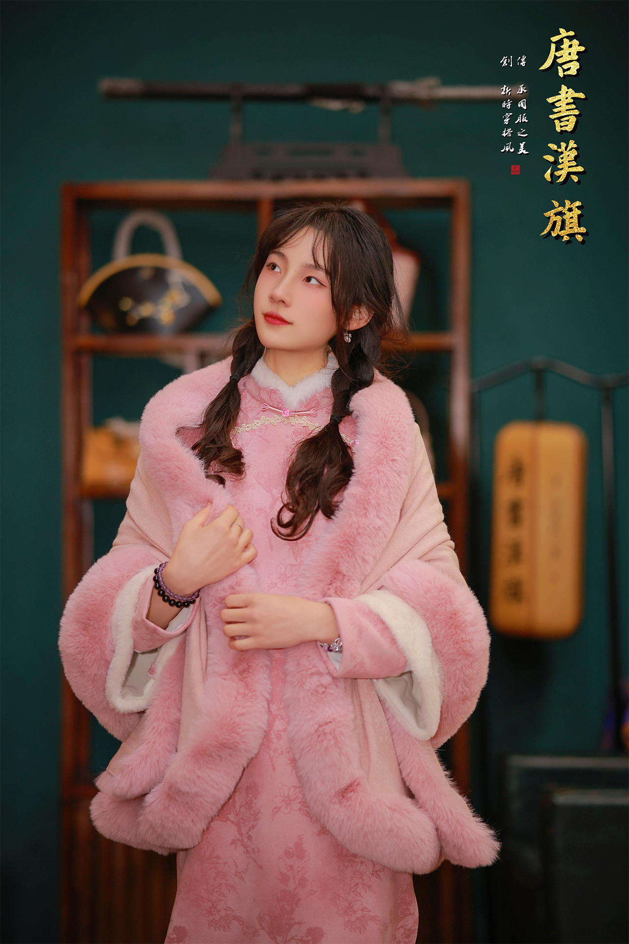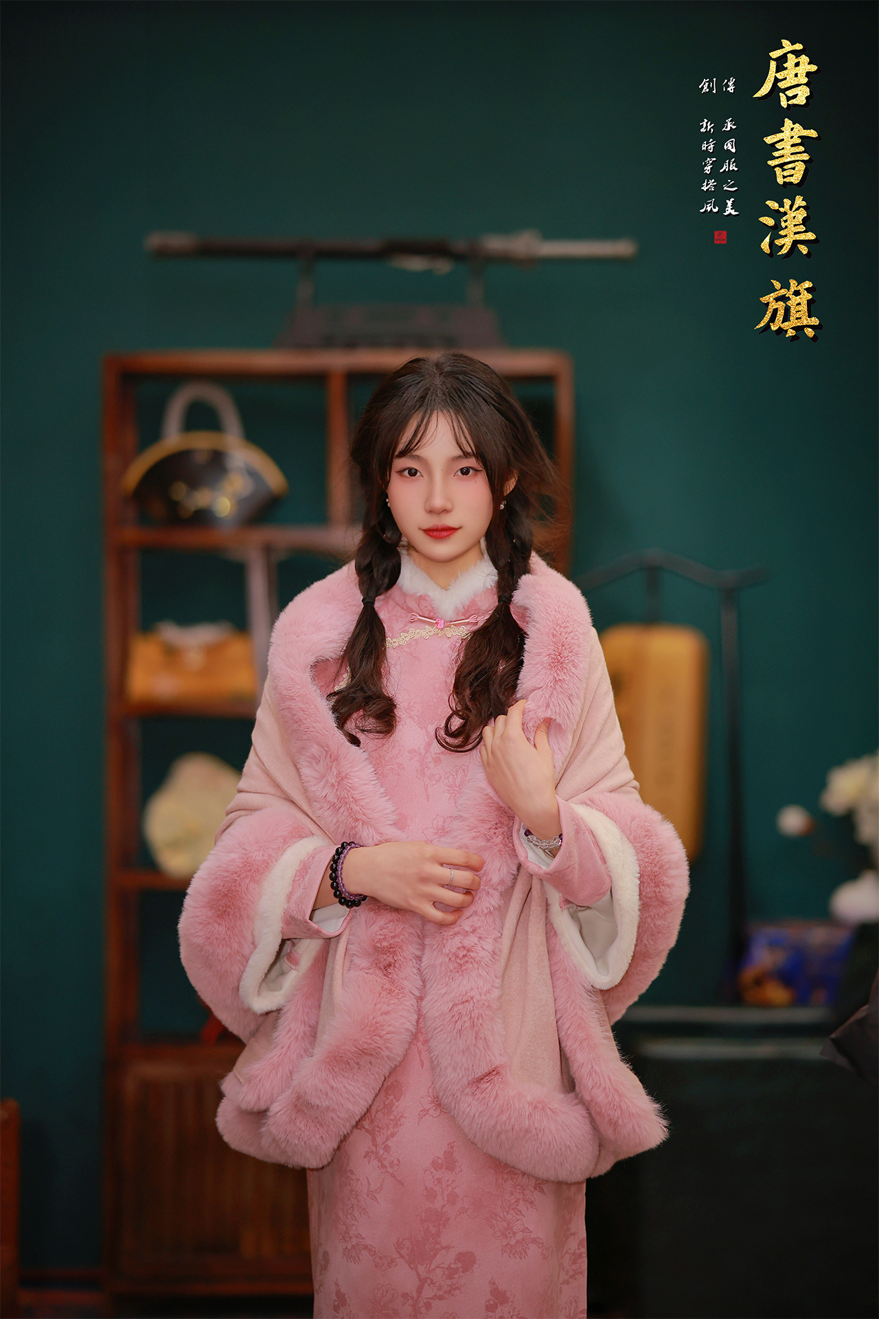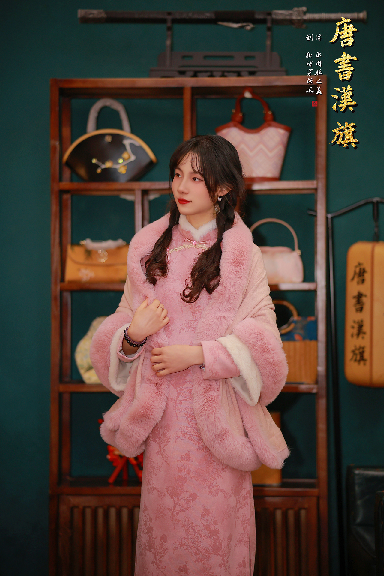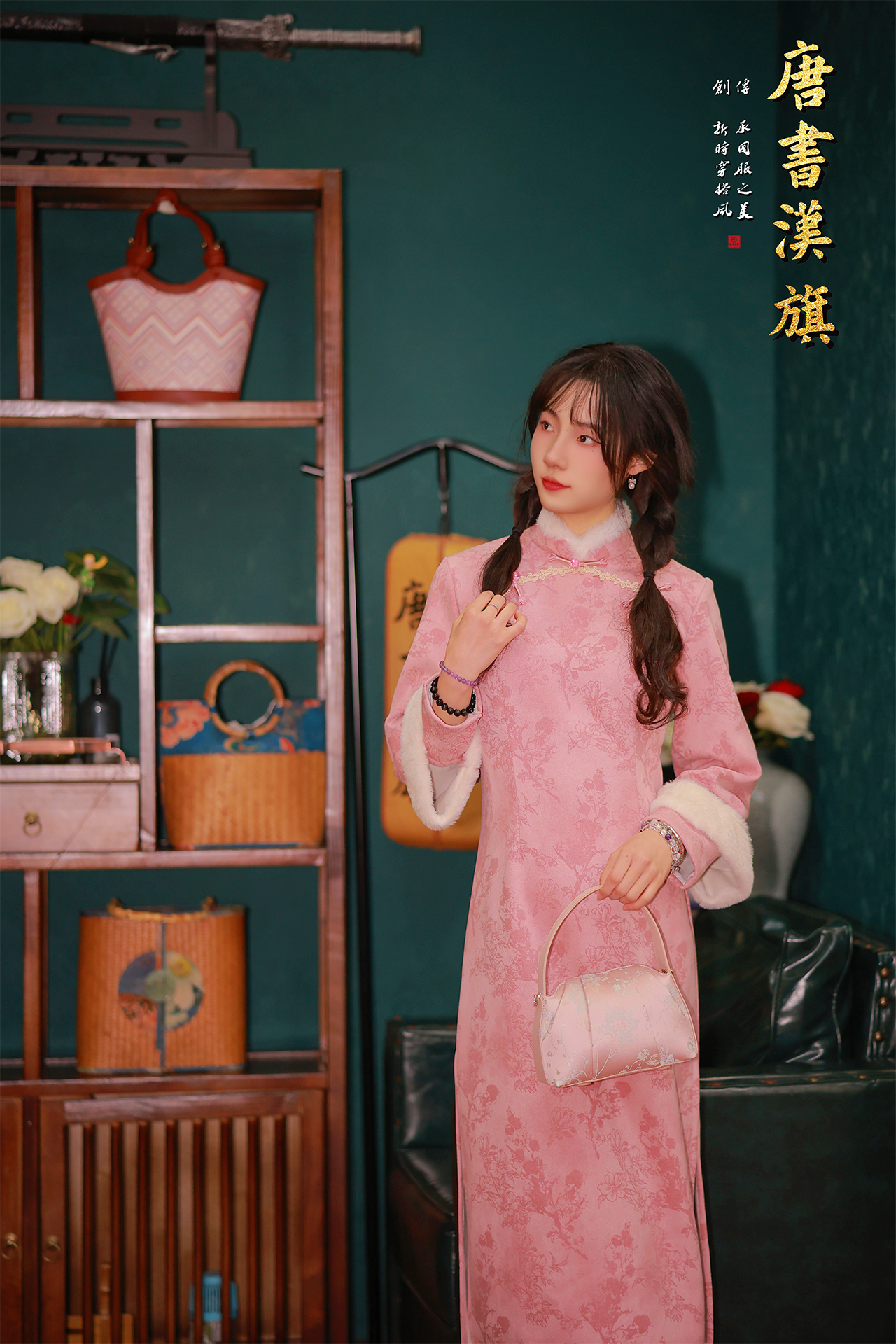 【粉梅绒】柔粉绒边改良旗袍,领口+袖口拼接加绒,内里加绒锁温,清冷天气里裹满温柔,淡粉底暗纹提花,斜襟盘扣+绣花点缀,自带江南闺秀的婉约气质,