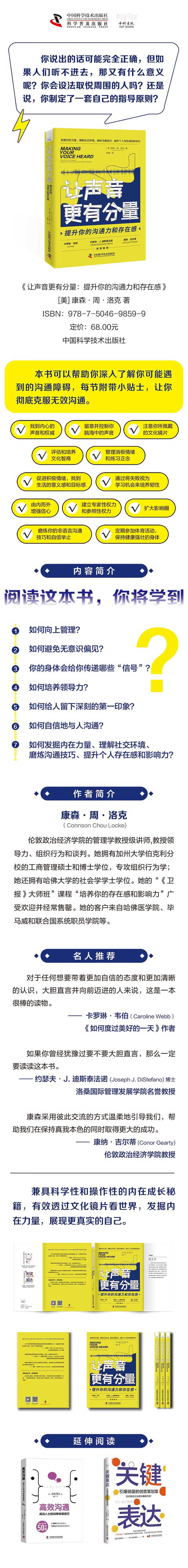 本书的目标读者是那些声音没有分量或者不确定该如何把话说出来的人。世界正变得越来越复杂、越来越难以驾驭。我们不能抱着旧方法不放,并指望它们在瞬息万变的新世界中有效发挥作用。现在,我们比以往任何时候都更需要听到多元化的声音和意见不同的观点。本书借鉴了社会心理学、认知心理学和社会学的研究成果,阐述我们应该如何沟通、为什么容易出现沟通不畅,以及应该如何克服这些障碍等。
