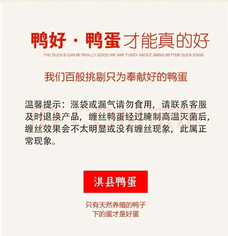 温馨提示: 胀袋或漏气,请勿食用,请联系客服及时退换产品。缠丝鸭蛋经腌制高温灭菌后,缠丝效果会不太明显或没有缠丝现象,此属正常现象,不作为售后理由。