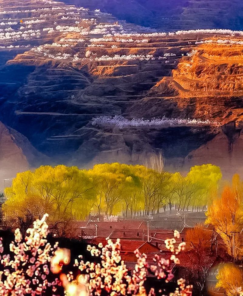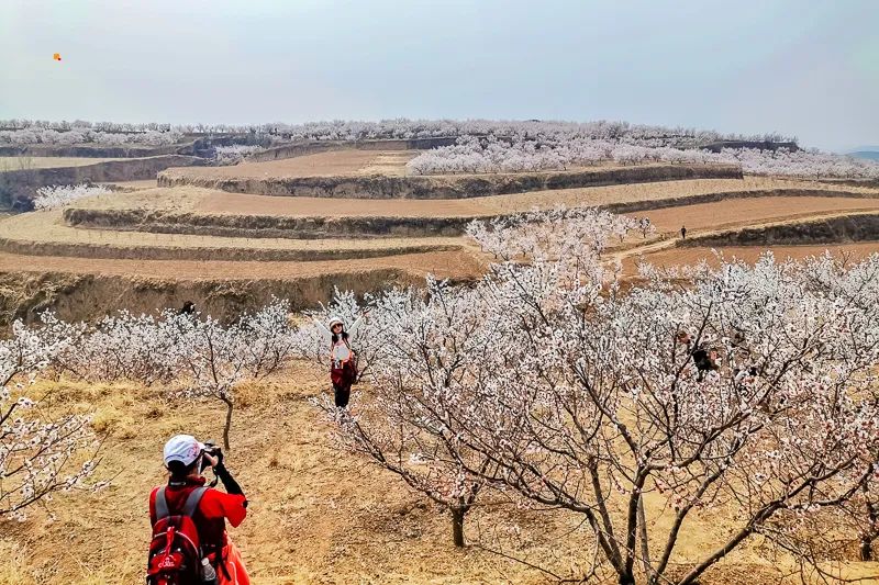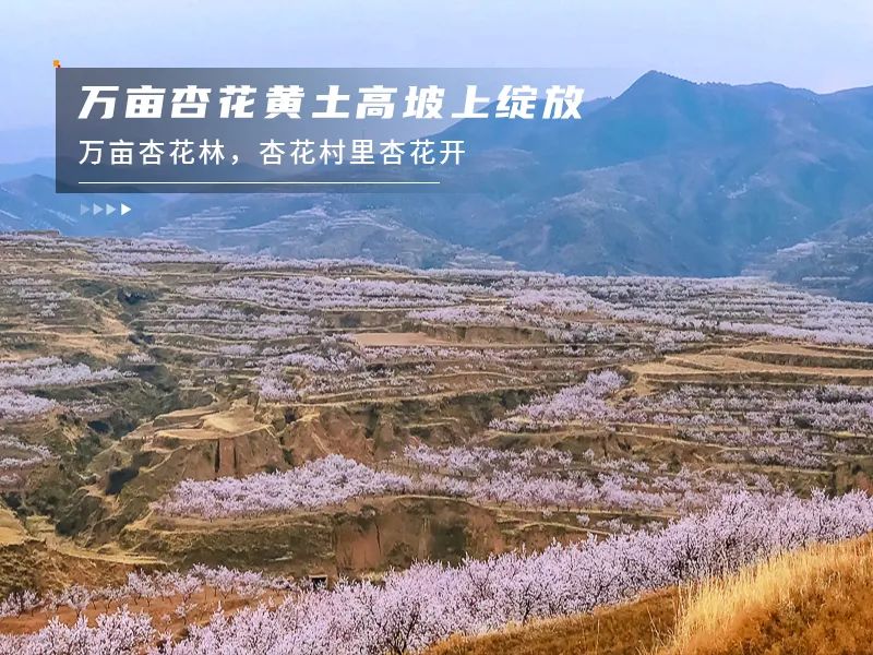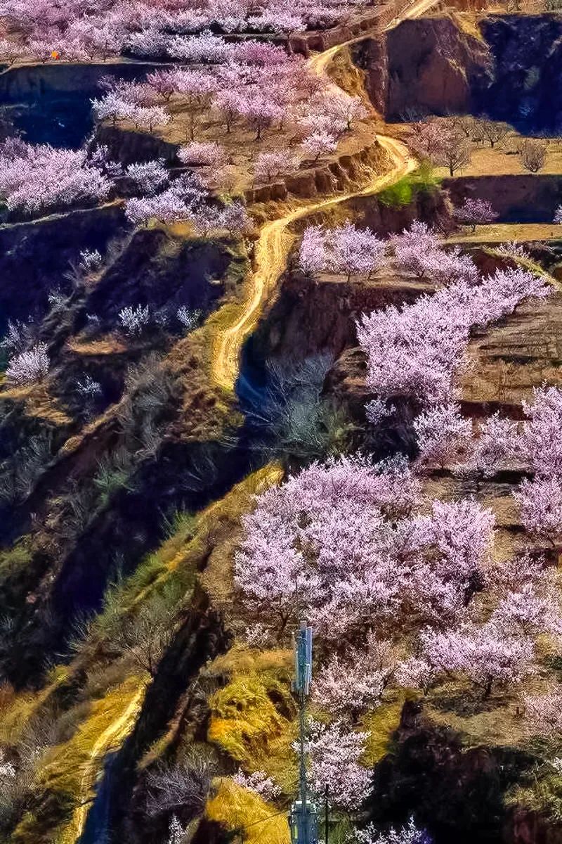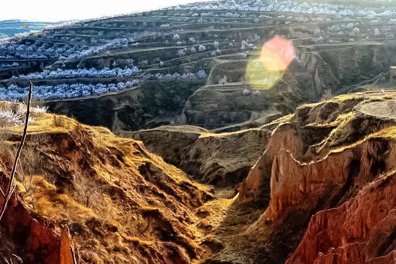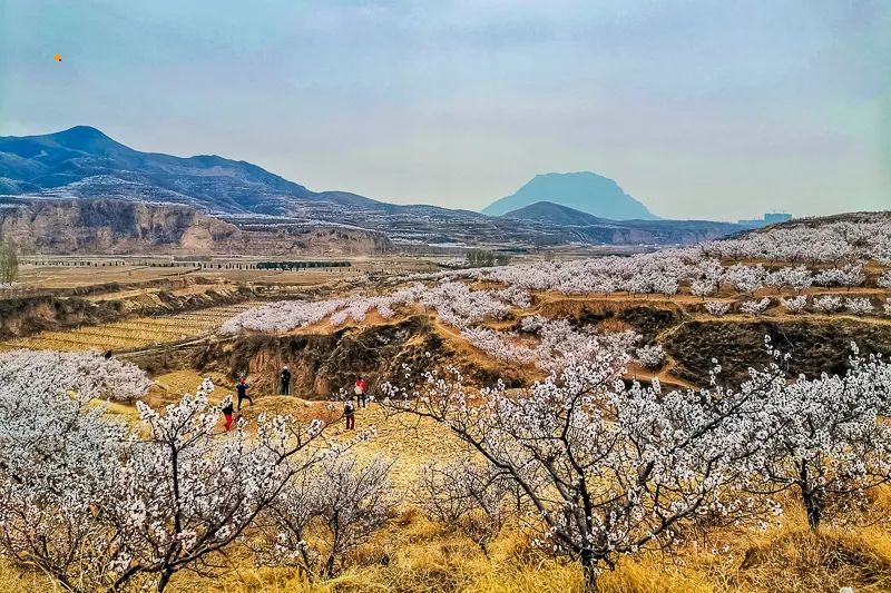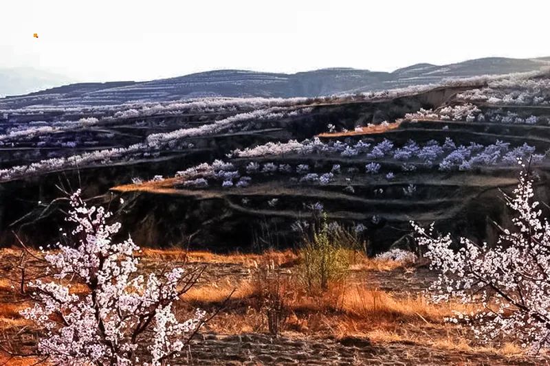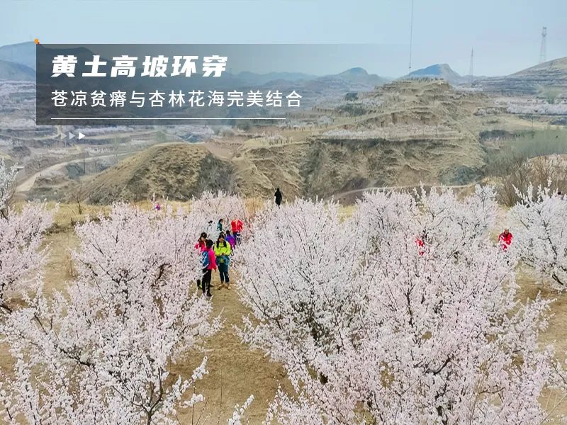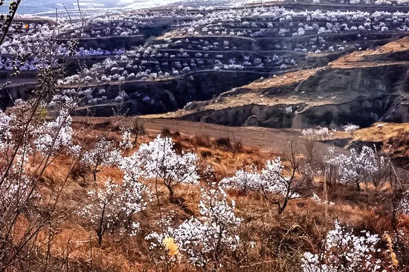 这片黄土面积占到近70%的黄土地历经千年沧桑,在雨水冲刷侵蚀下,造就了今天这种沟壑纵横、雄奇、苍凉而贫瘠的独特风景线,每逢四月,万亩杏花林竞相开放,犹为壮观。
