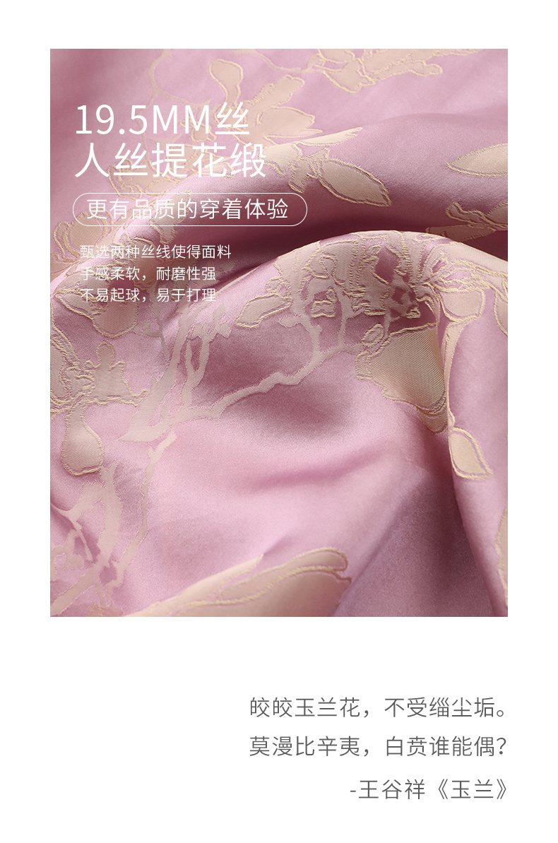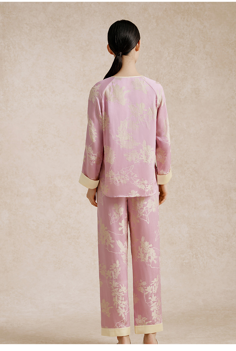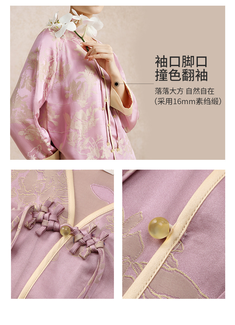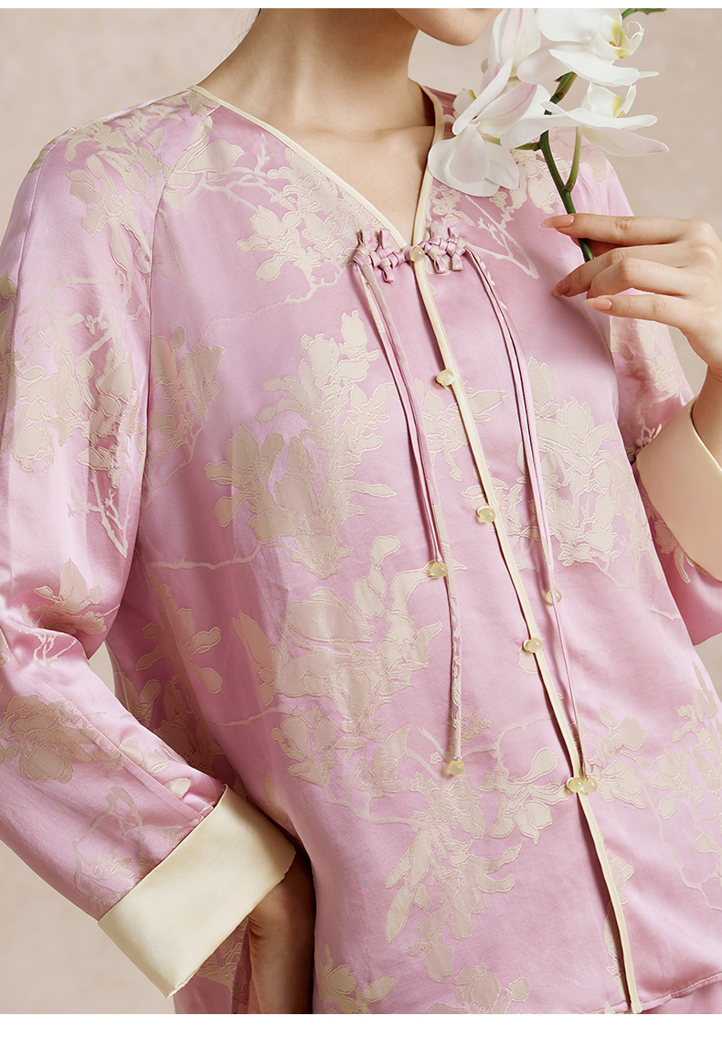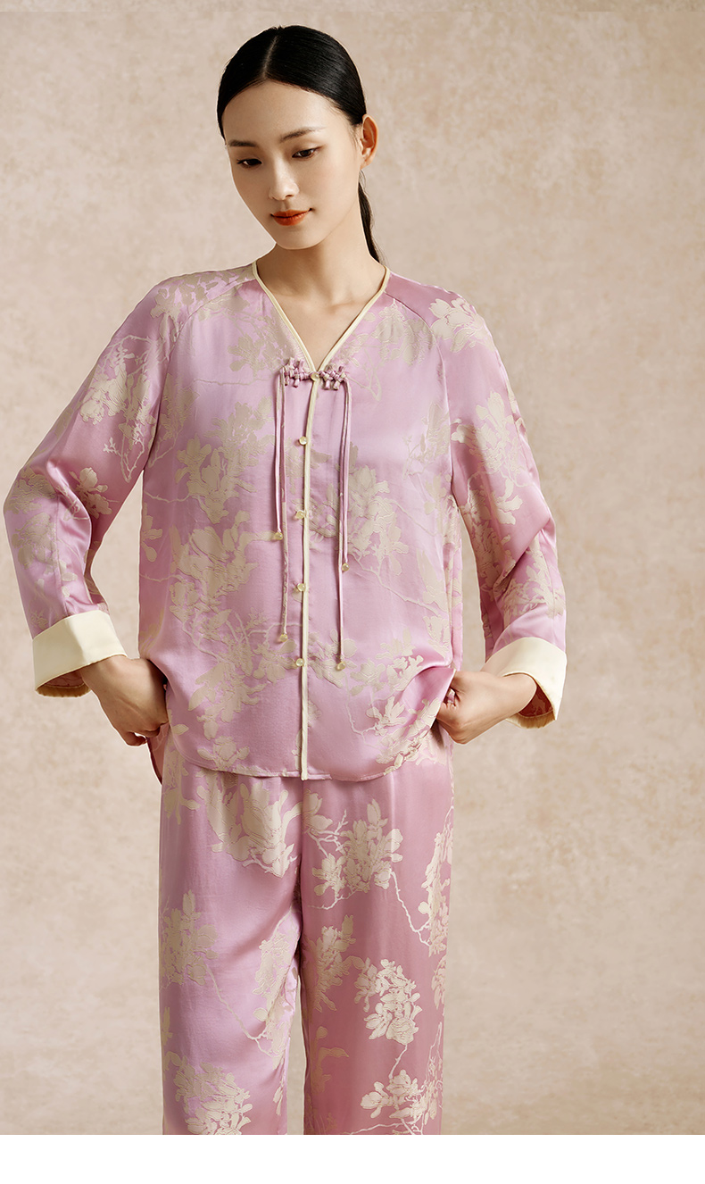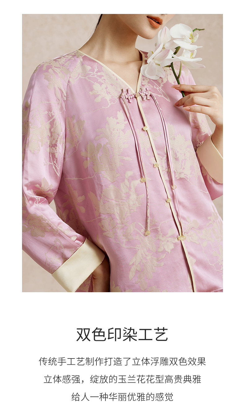 【桑蚕丝双色提花缎】玉兰印花真丝睡衣女新中式长袖衣裤套家居服金三塔 YSFEC209