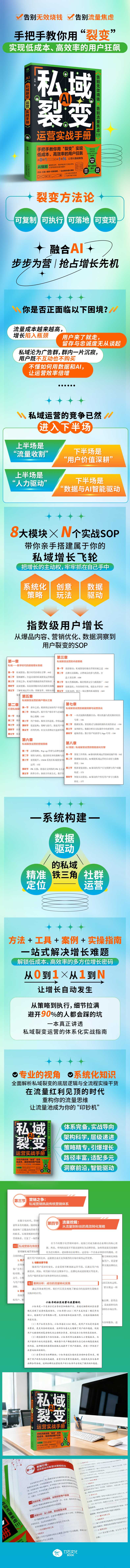 《私域裂变运营实战手册》是一部集指导性与操作性于一体的私域流量裂变营销工具书。全书分为8章,基于私域裂变运营的底层逻辑,结合实战案例,深入剖析私域裂变运营中的各个环节及关键战术。本书适合希望深耕私域裂变运营的企业与营销人员,亦能为想通过私域流量实现用户增长和品牌影响力提升的创业者提供实用建议。通过本书,读者将掌握私域流量裂变的操作方法,抓住数字时代的全新商业机遇。