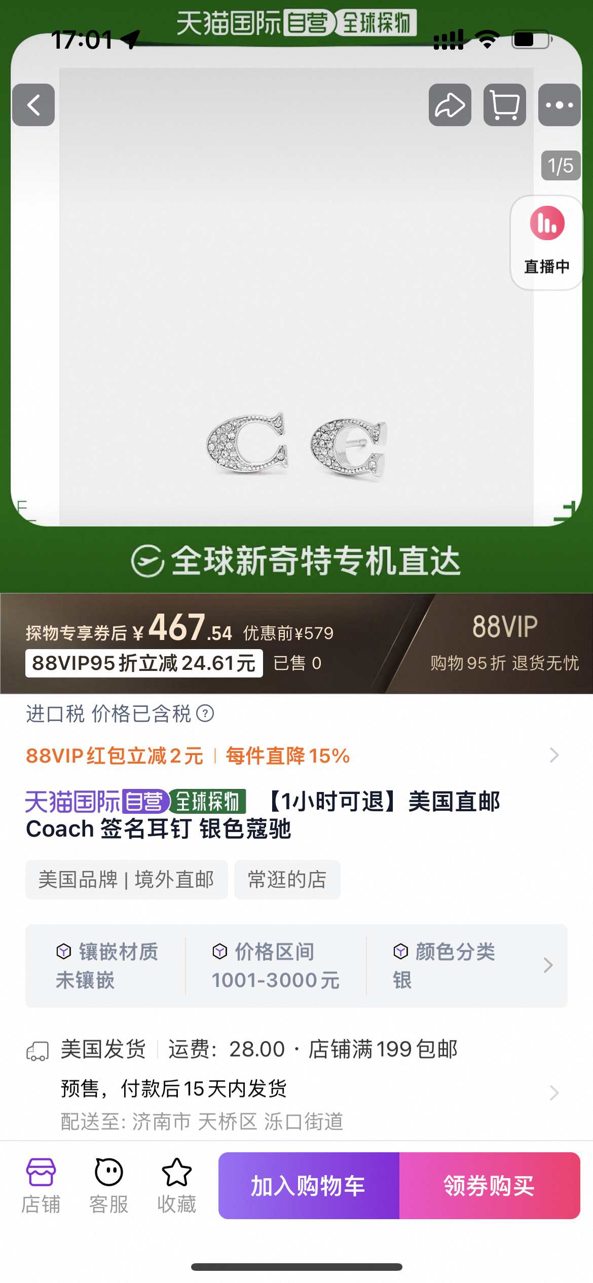 正品订单!25年新款 代购500左右 !蔻驰C字母标志满钻耳钉