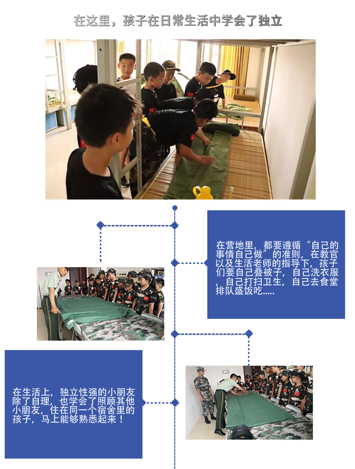 1、学员必须严格遵守营地规章、纪律和作息时间,以保证每天有充沛的精力参加军事训练和其它各项训练;2、学员在辅导员的督促下自己动手洗衣服和整理内务,并且每天晚上辅导学员暑期作业;3、学员要保护环境,爱护公物及营地设施设备。