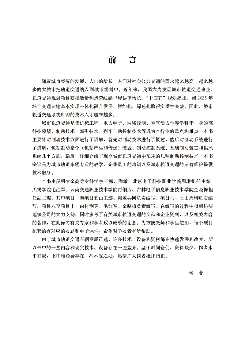 本书 主要针对制动技术方面进行了讲解,首先对制动技术进行了概述,然后对制动系统进行 了讲解,包括制动指令 (包括产生和传送)装置、制动控制系统、基础制动装置和供风 系统几个方面;最后,详细介绍了现今城市轨道交通中采用的几种制动控制技术。本书 宗旨是为城市轨道车辆专业的教学、企业员工的培训以及城市轨道交通的运营维护提供 技术服务。