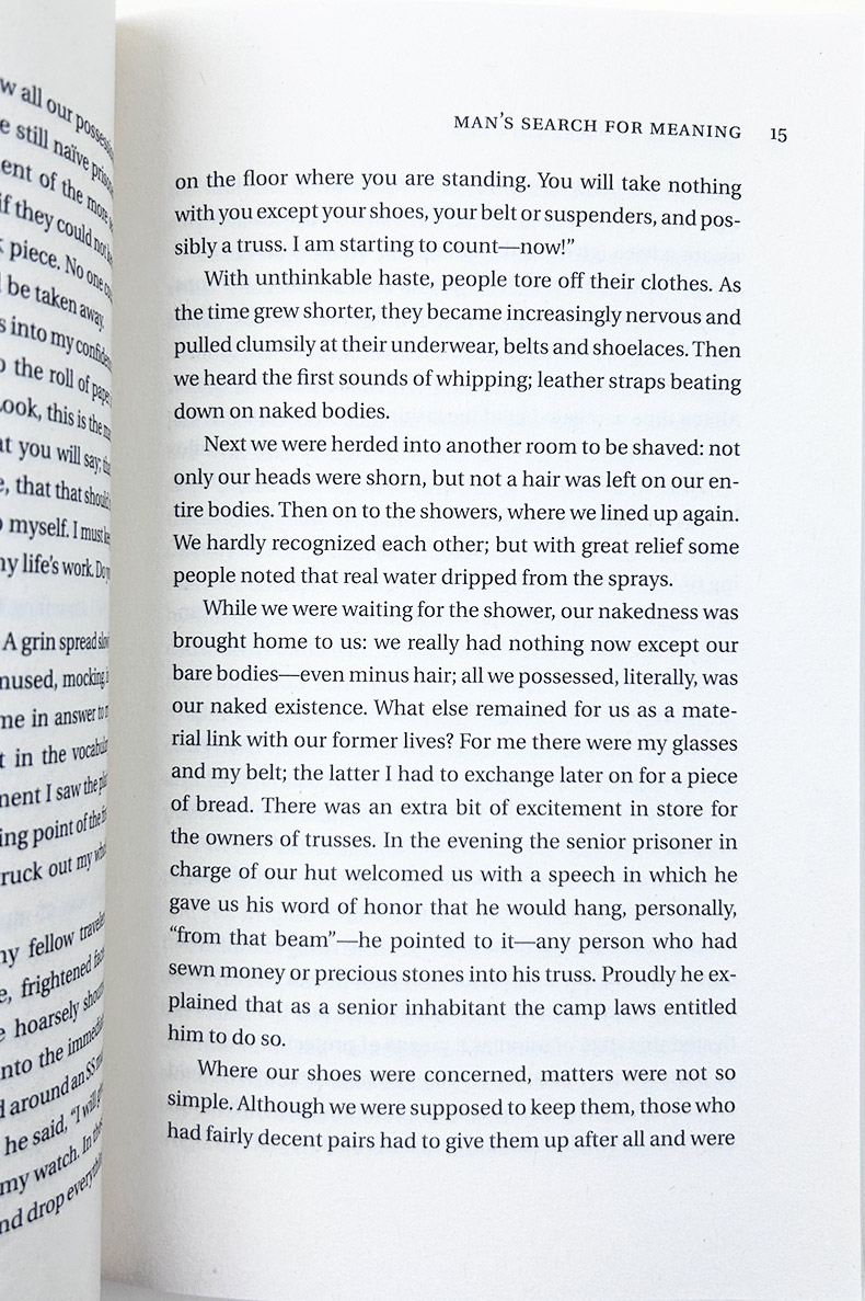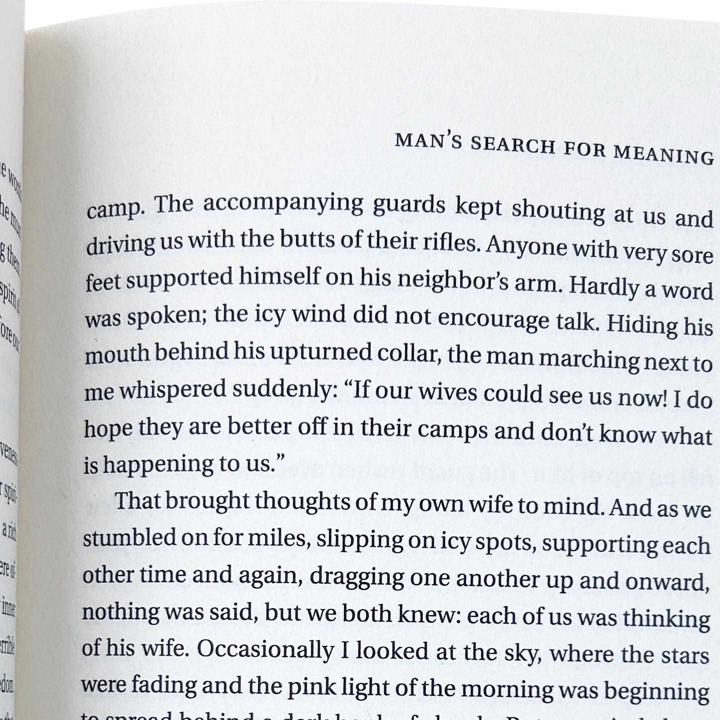 一名在战役中失去双腿的年轻士兵,他陷入抑郁而企图自杀。有一天,他的朋友注意到他变了,他的面容从沮丧变得庄严而神气。士兵就是因为阅读了Man’s Search for Meaning《活出生命的意义》一书才发生如此巨大的转变。