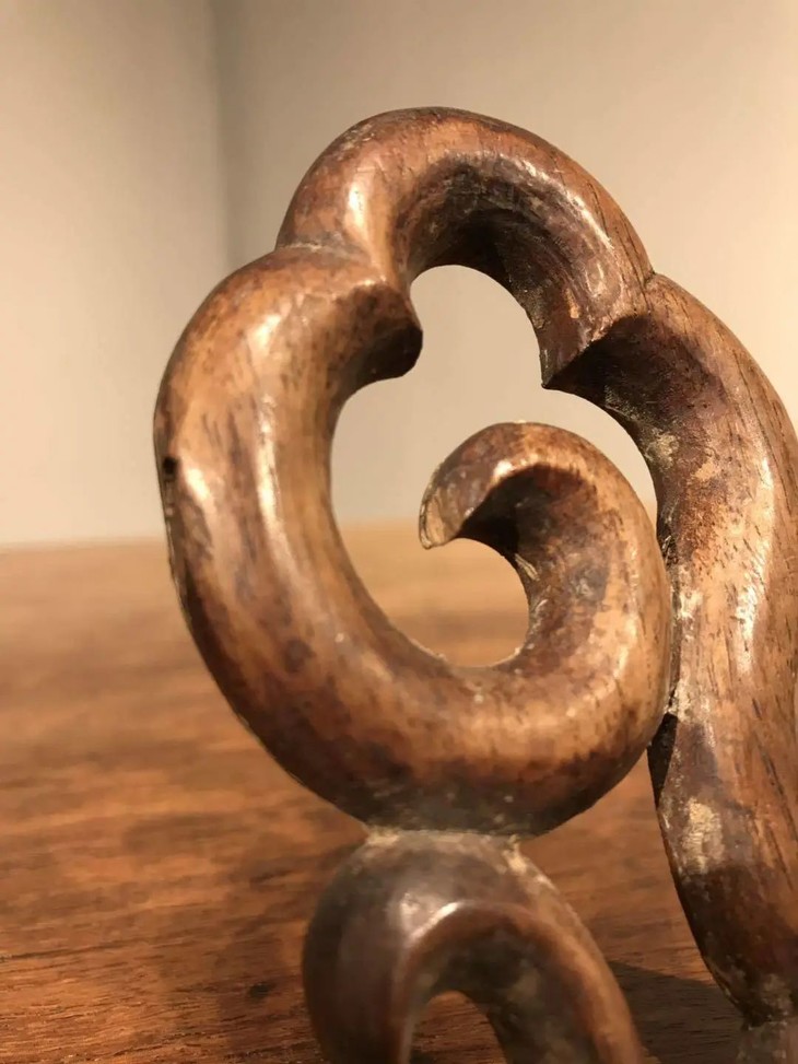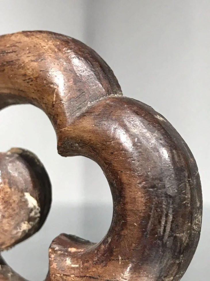 此对透雕黄花梨如意纹花结表面细微磨损与刮痕以及一处小磕碰伤(如图所示),上方原钻两配件连结孔,除此以外,保存完好,表面包浆皮壳渾厚细腻。