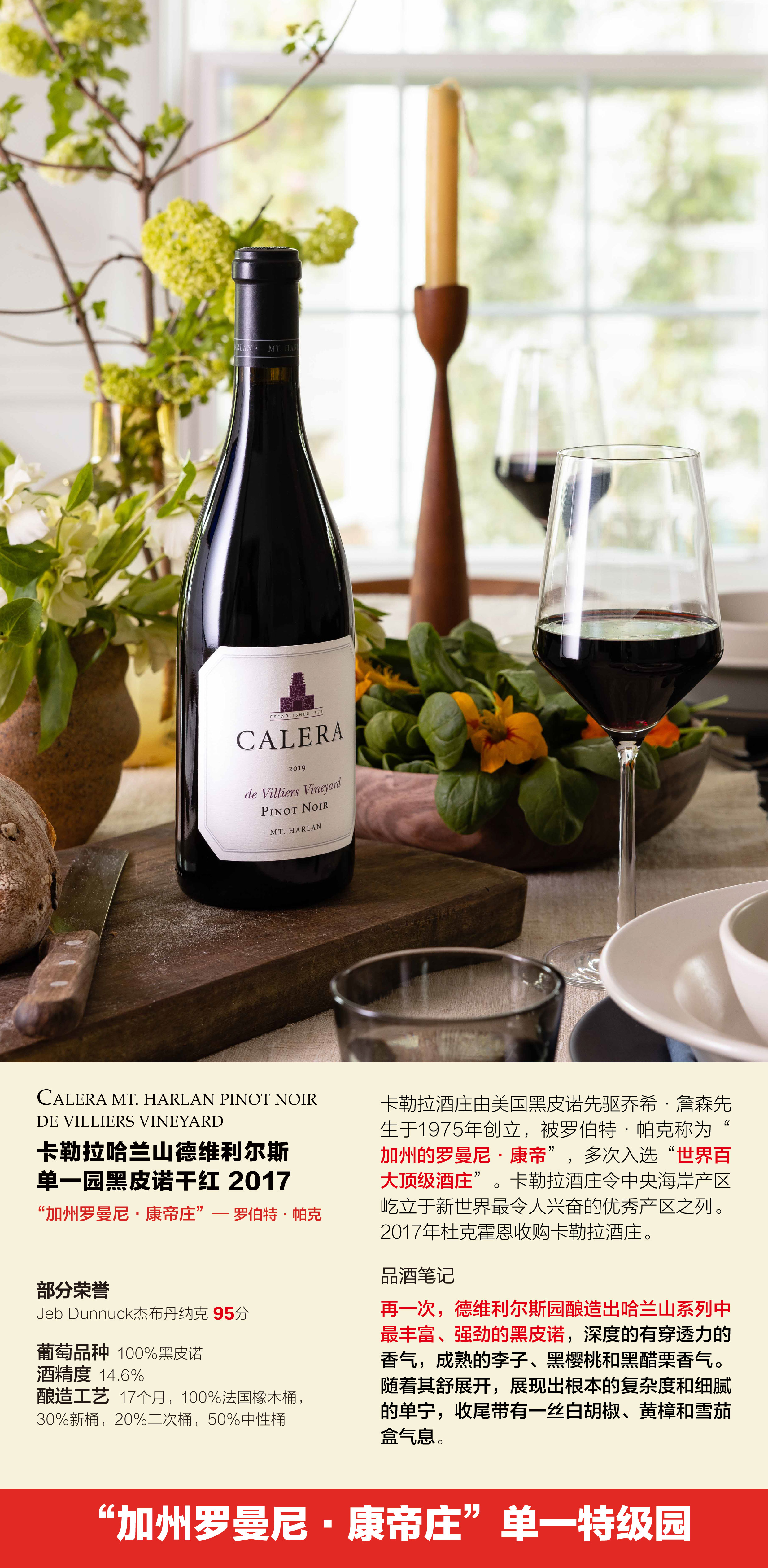 卡勒拉哈兰山德维利尔斯单一园黑皮诺干红2017 Calera Mt. Harlan Pinot Noir de Villiers Vineyard