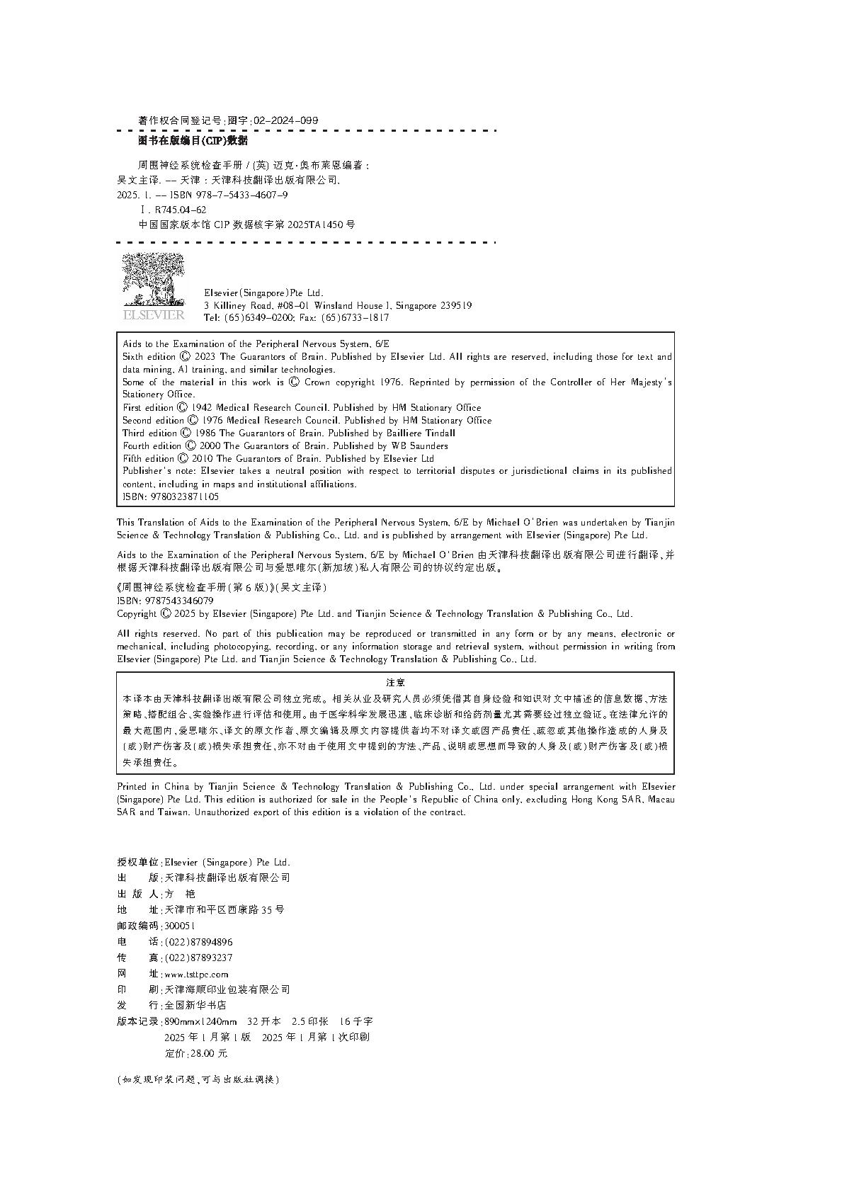 《周围神经系统检查手册》(第6版),32开,平装,90g铜版纸印刷,80页,28元,2025年1月出版。