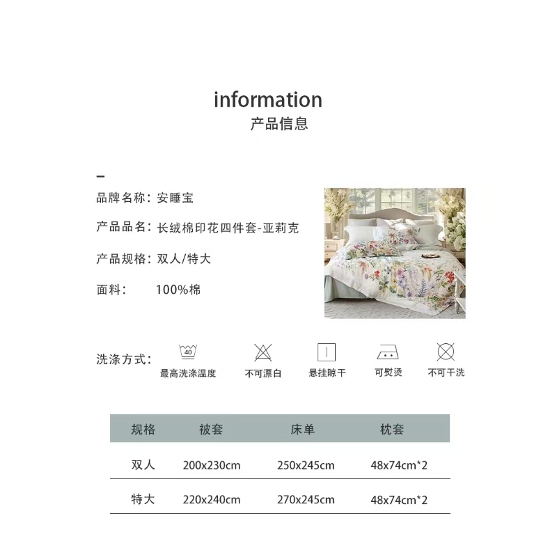 10楼 安睡宝 长绒棉印花四件套-亚莉克 吊牌价3599~3799元 活动价899~999元