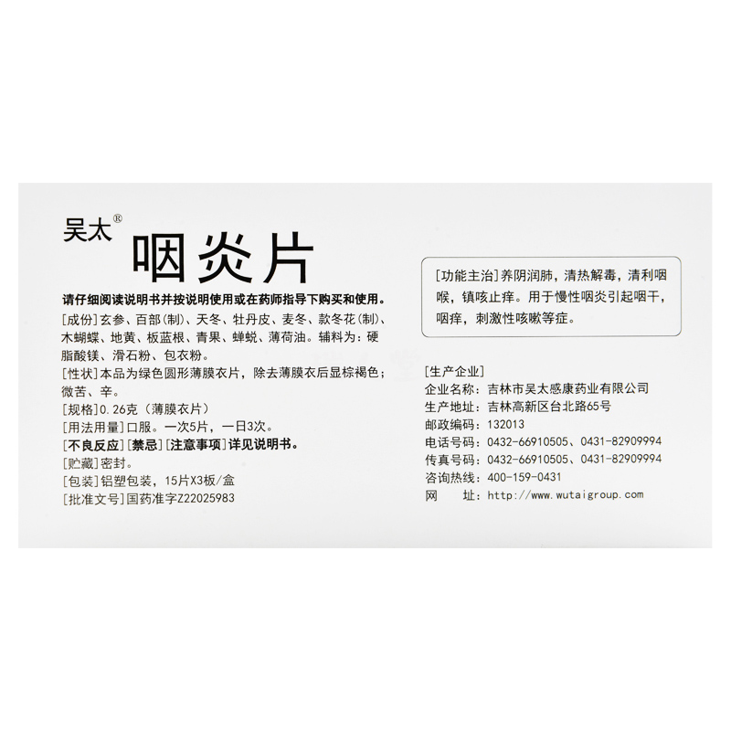 吴太 咽炎片 0.26g*45片/盒 养阴润肺 清热解毒 清利咽炎镇咳止痒