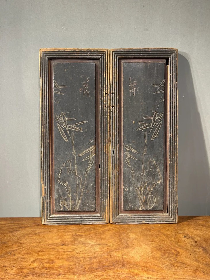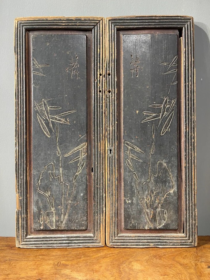 这是两块硬木雕花髹漆橱柜门板一对,以硬木雕琢的长方板,大面板,高近七十厘米,每块重逾一公斤,正面横阴刻奇石文竹图与行书体:“壬辰仲春作”,表面髹黑漆已自然斑驳,包浆浑厚,两块门板雕刻镜像图案,独具一格,保留原青铜扣环与起线长方框,表面斑驳大漆与温润老硬木皮壳,是橱柜的门板。