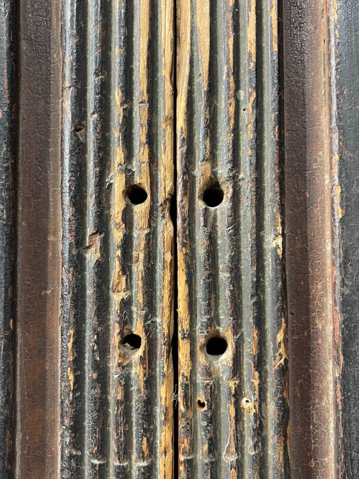 此硬木雕花髹漆橱柜门板一对,雕刻图案互为镜像,如图所示,除表面原漆斑驳磨痕与圆装配孔眼外,基本保存完好。此对面板尺寸碩大,雕刻图案典雅大方,整体气质非凡,可以為任何空间增添雅气,或可融入家具设计。