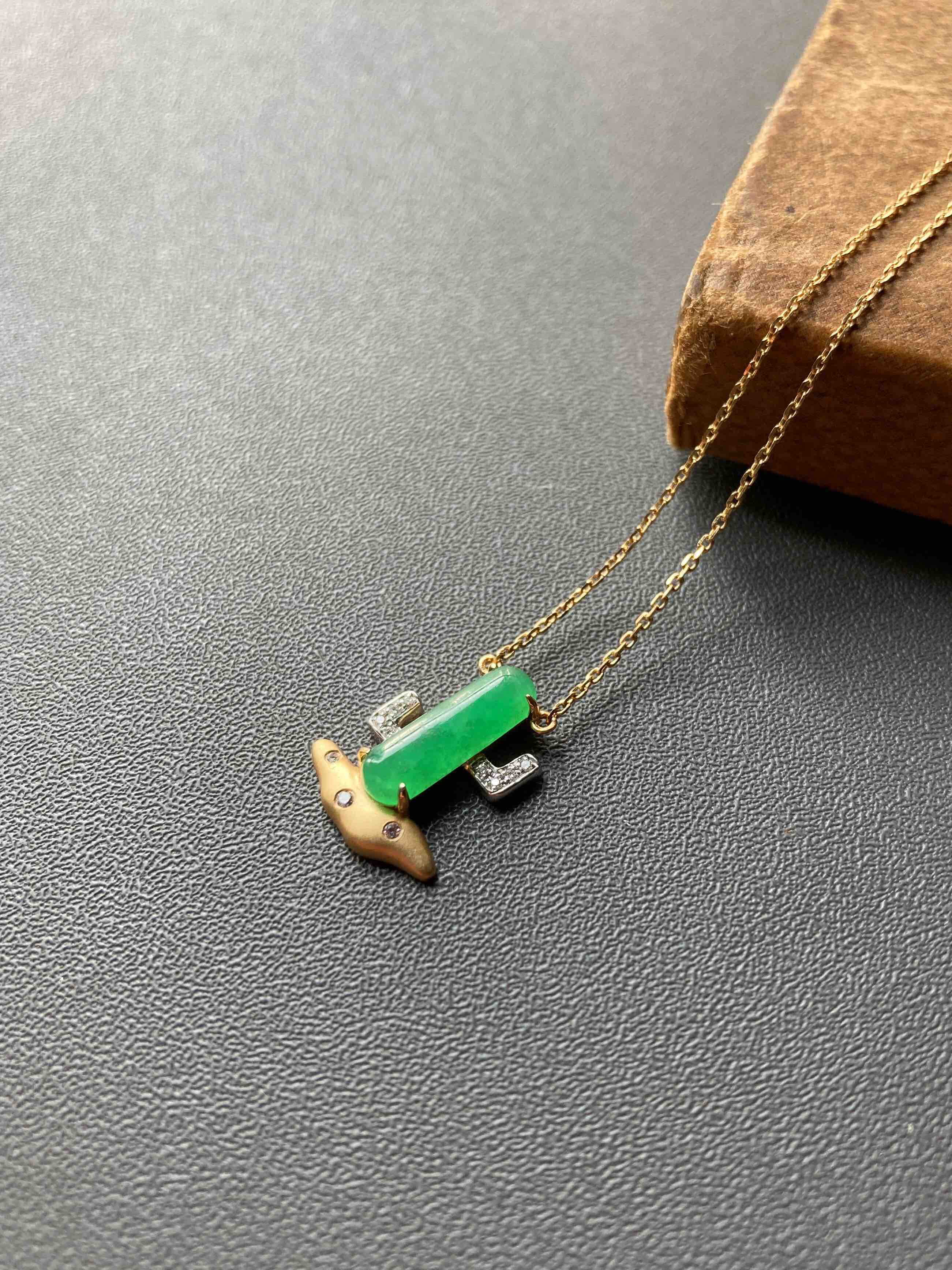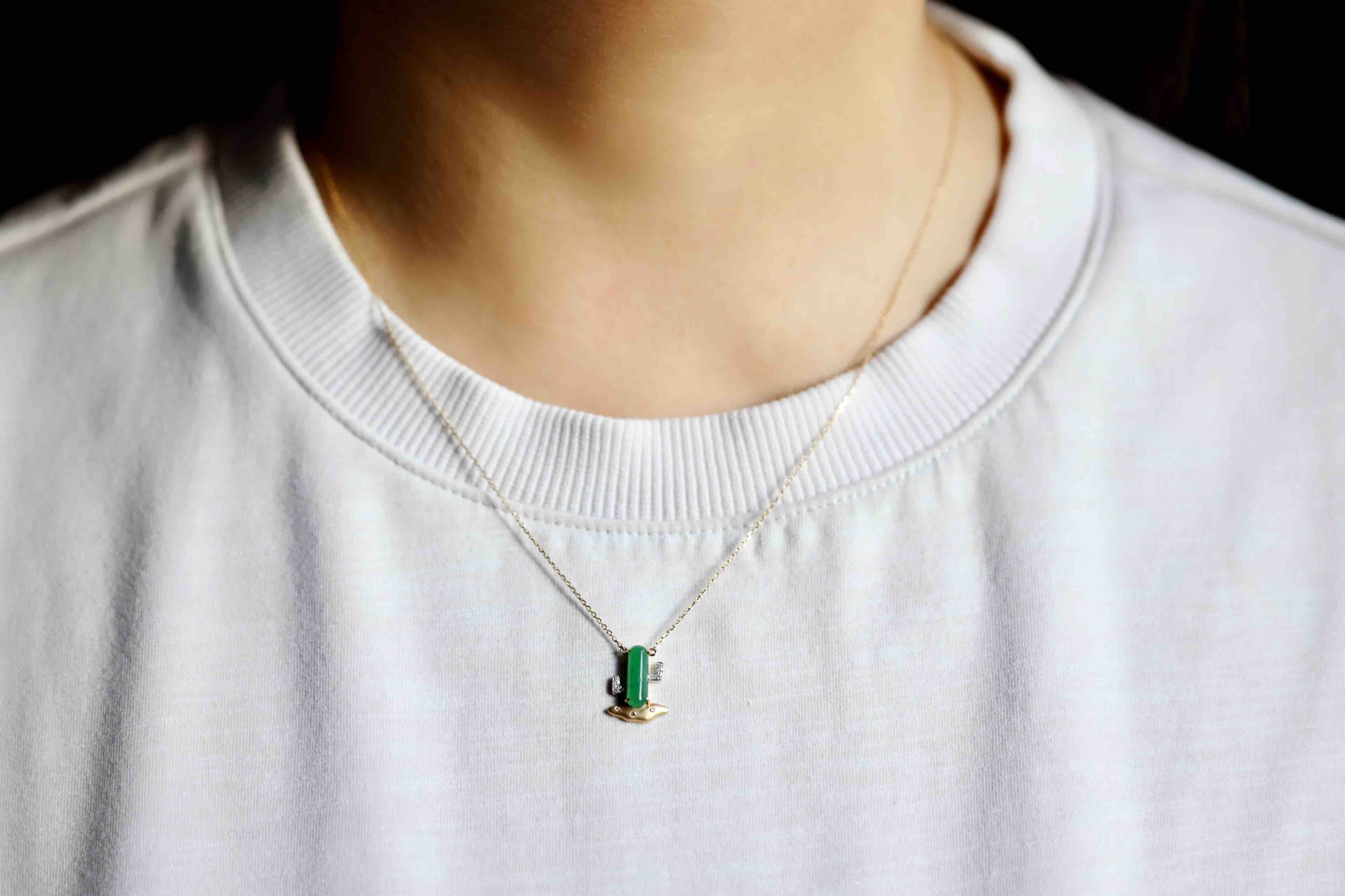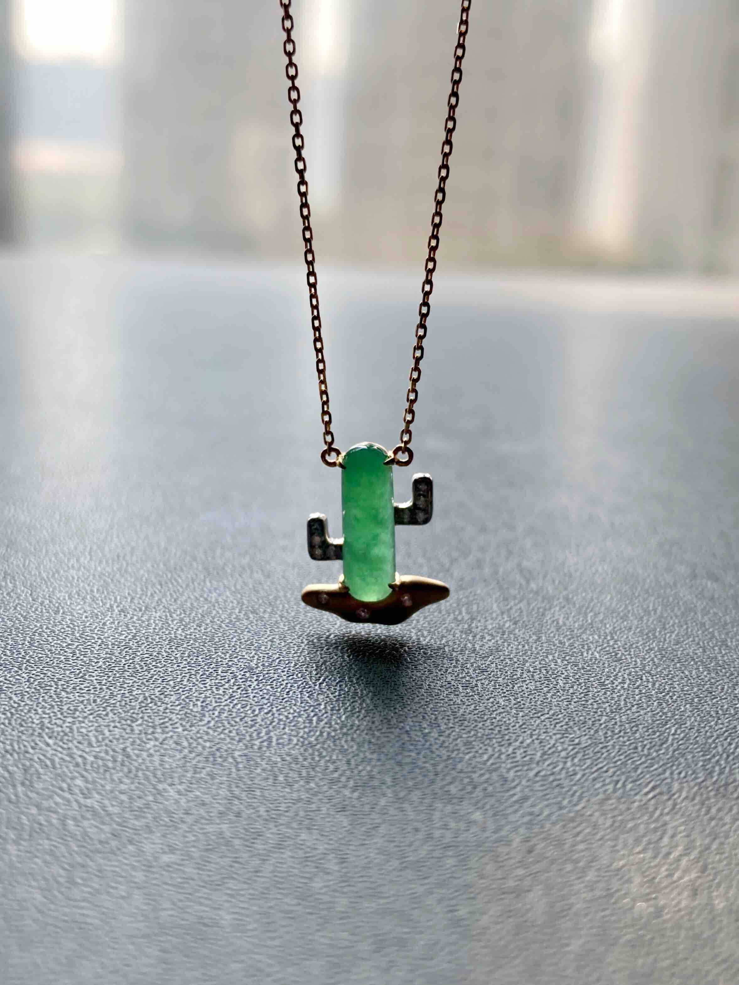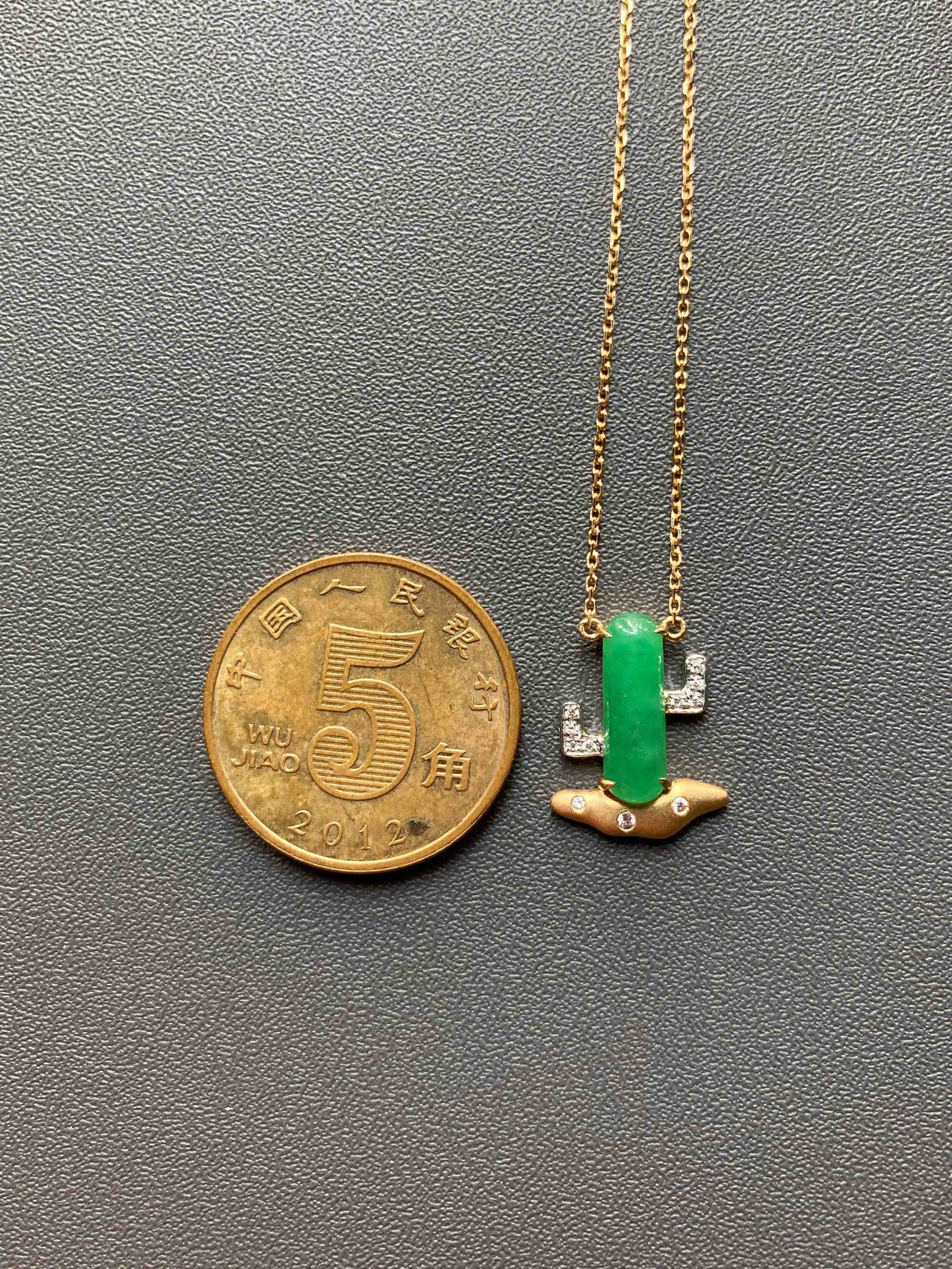 稀有的冰种阳绿翡翠灯管,立体饱满,阳绿艳丽,就像一个小胶囊,实在太特别,用它设计的宝贝当然要与众不同,一颗沙漠里的仙人掌,镶嵌后14.3×11.3×3.8mm,链长40cm加5cm延长链。象征着青春与蓬勃生机,翡翠禄来原创系列锁骨链,18k黄金白金钻石镶嵌,只要小四价位你就可以拥有一件独立设计师作品,花同样的钱,不一样的享受。这就是禄来想要带给你的