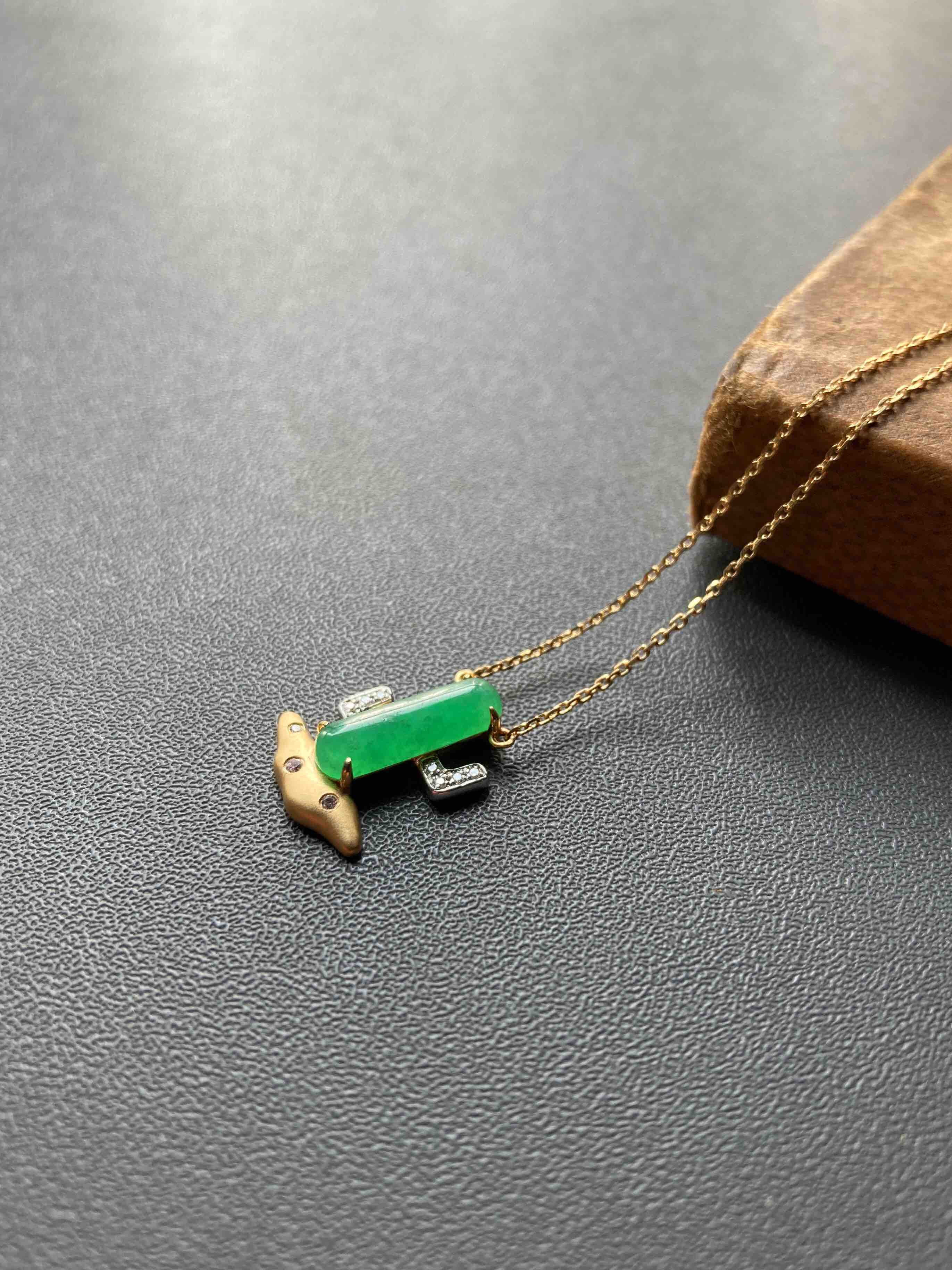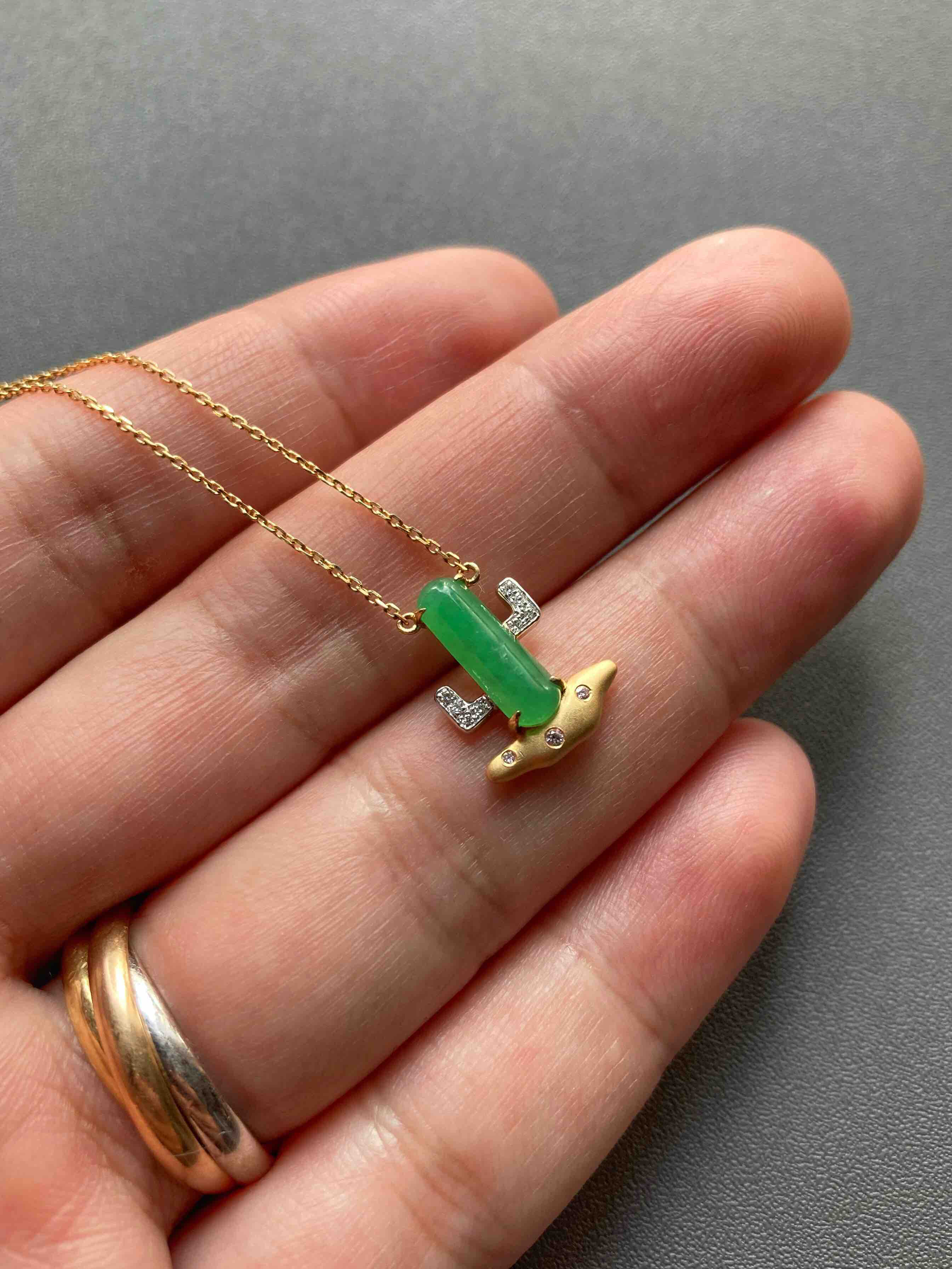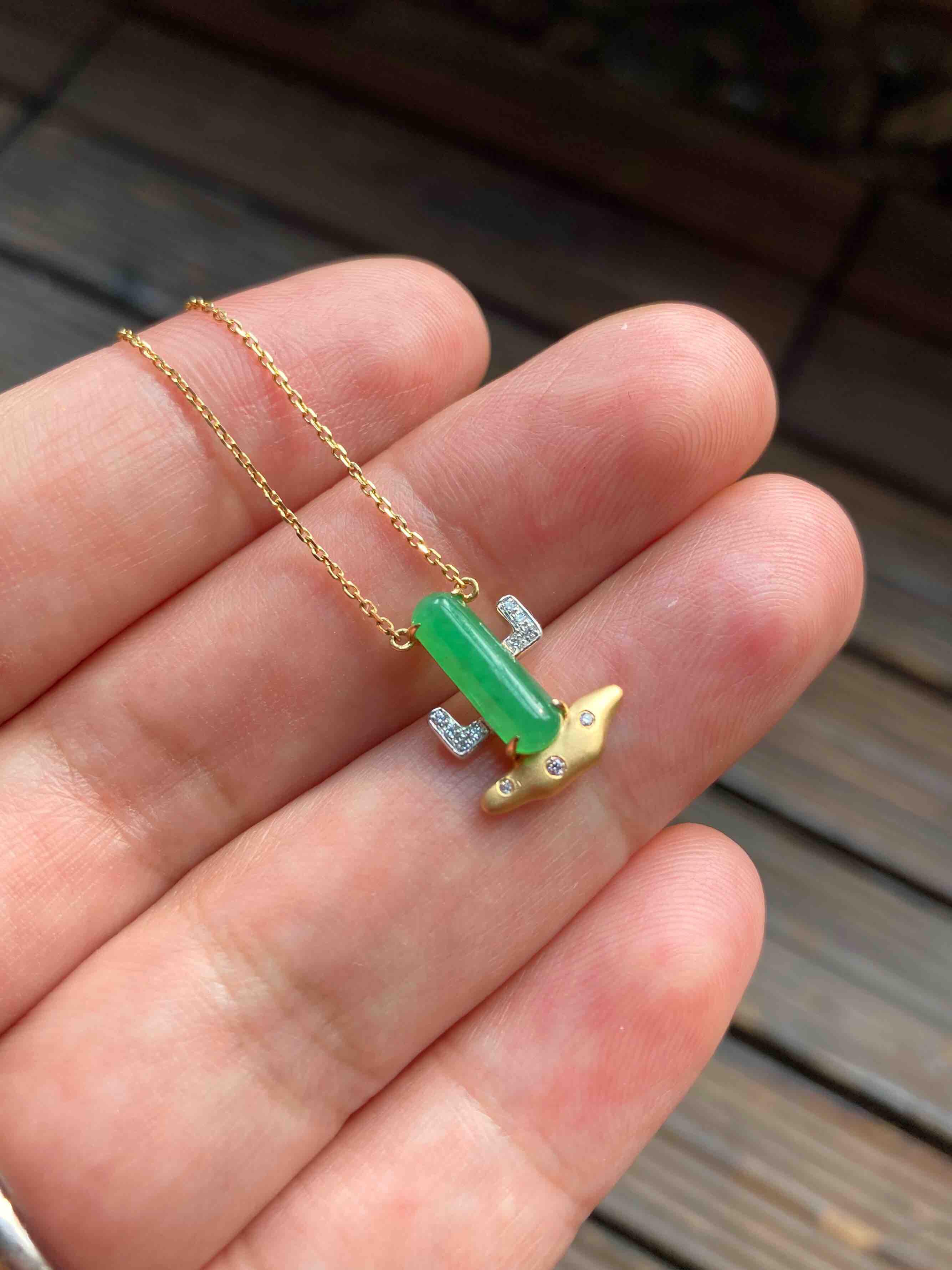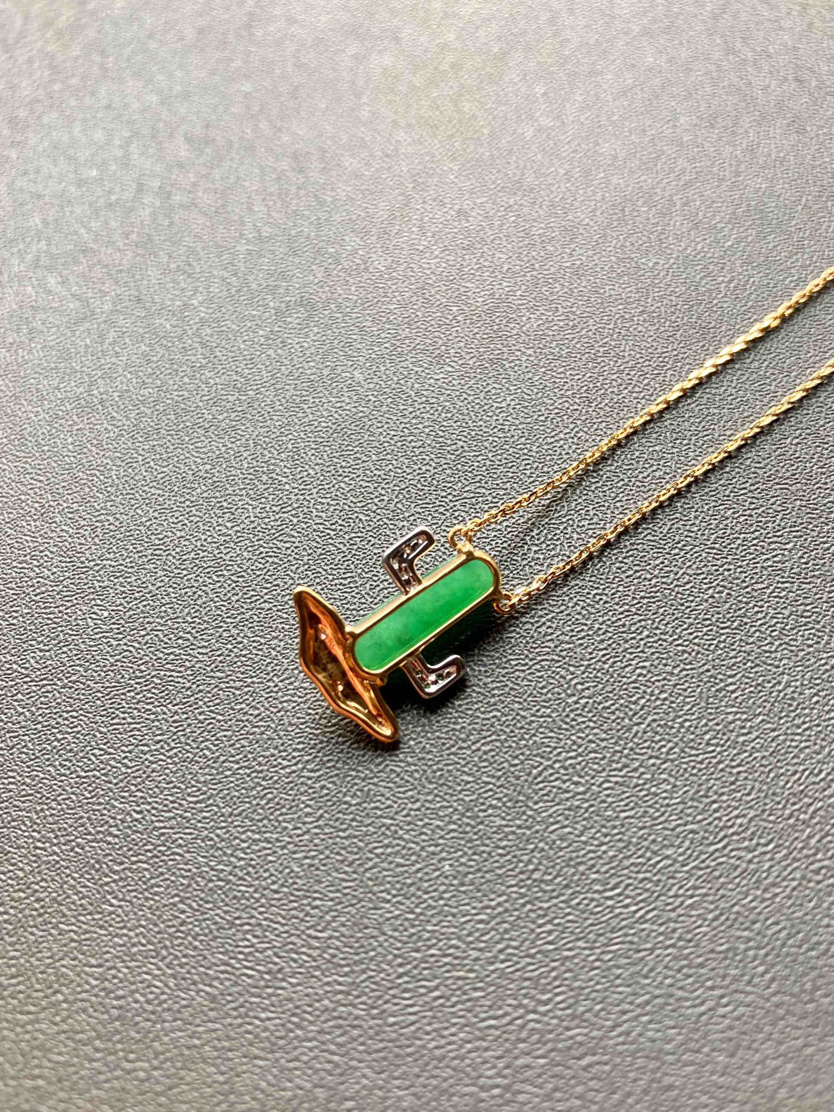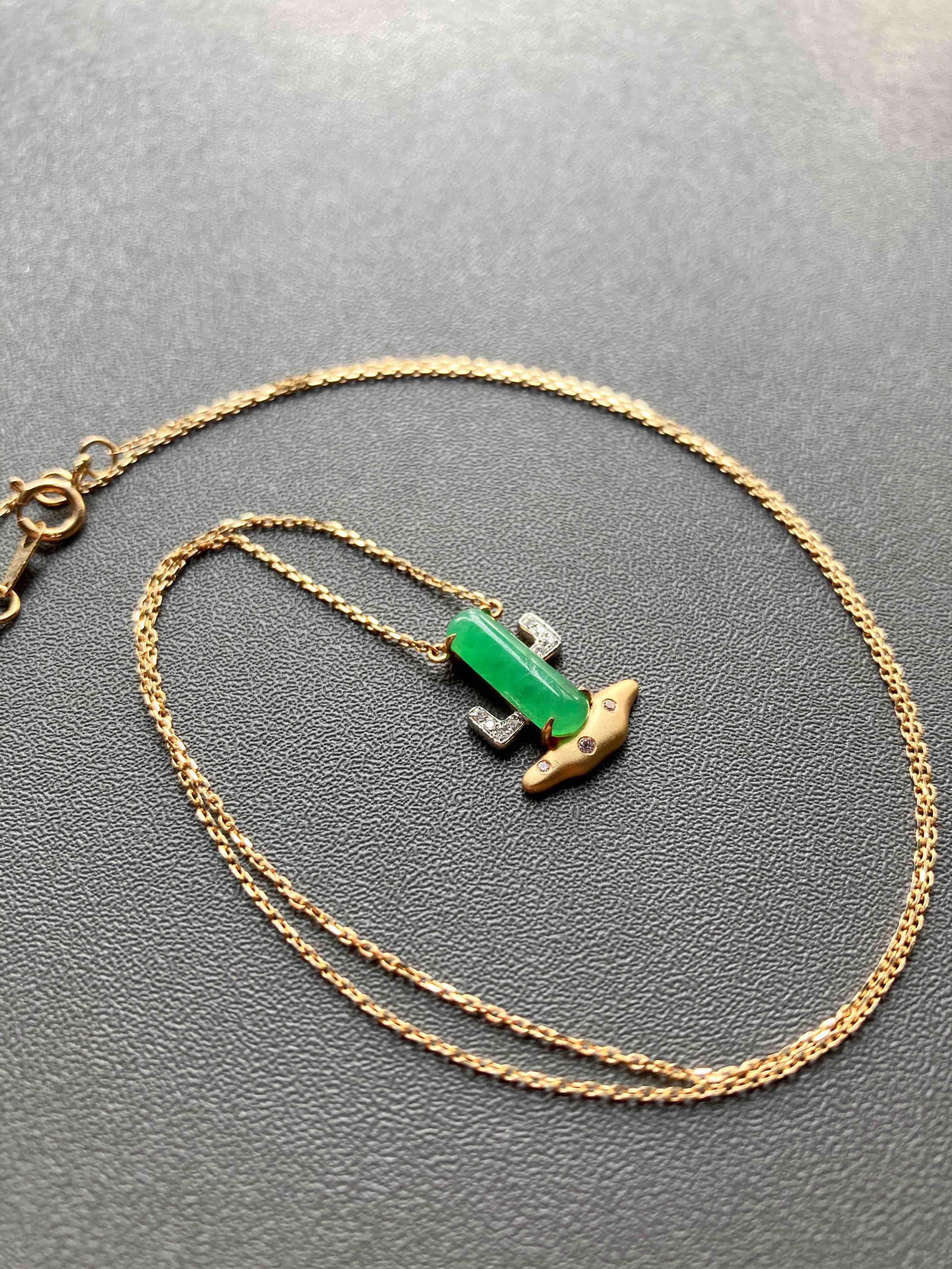 稀有的冰种阳绿翡翠灯管,立体饱满,阳绿艳丽,就像一个小胶囊,实在太特别,用它设计的宝贝当然要与众不同,一颗沙漠里的仙人掌,镶嵌后14.3×11.3×3.8mm,链长40cm加5cm延长链。象征着青春与蓬勃生机,翡翠禄来原创系列锁骨链,18k黄金白金钻石镶嵌,只要小四价位你就可以拥有一件独立设计师作品,花同样的钱,不一样的享受。这就是禄来想要带给你的