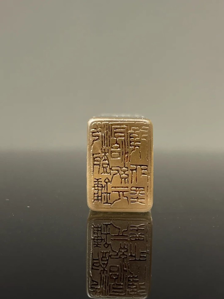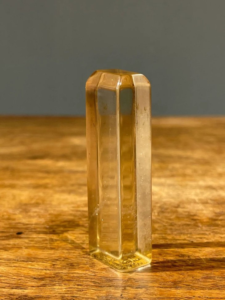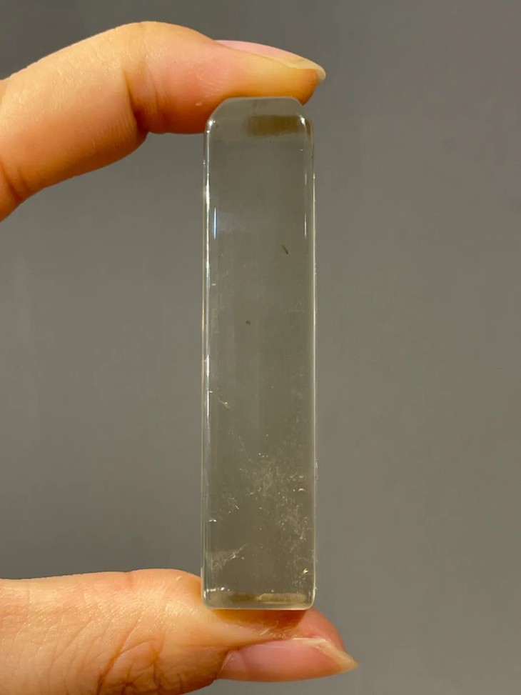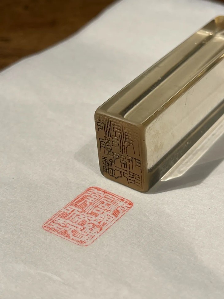 这是一件天然透明白水晶雕刻而成的高长方形文人闲章,此件水晶高长方章,以质地纯净通透偶具天然石纹的透明白水晶雕琢而成,高长方形式简约气质高雅,琢磨精致细腻,晶莹剔透的白水晶内部典型龟裂石纹生动流畅,长方印面刻篆体白文:《沈樹鏞同治紀元後所得》,篆刻刀法刚劲挺拔、端正典雅,一丝不苟、无懈可击,水晶是硬度极高的印石,通常篆刻家不愿意轻易挑战。此一水晶高长方文人闲章,印文中人名“沈樹鏞”,所指的是清代后期藏书家、金石学家沈樹鏞,字均初,一字韵初,号郑斋,川沙城厢(今浦东新区川沙镇)人。咸丰九年(1859年)中举,官至内阁中书。生平收藏书画、秘籍、金石甚丰。尤对碑帖,考订精辟。此一印文是沈氏的藏书章,时常出现在沈氏的藏书内,据说是当时的篆刻名家趙之謙的作品。此水晶高长方文人闲章雕工精湛,形式简约高雅,篆刻精湛刚劲,非名家不可为之,印材质地坚硬,晶莹剔透,除天然晶体结构外纯净无瑕、表面坚硬明亮、柔美雅緻,印文篆刻严谨细致,依其雕刻工艺与风格判断,应是清末名藏书家的收藏印。此水晶印除内部晶体纹理外,保存完好无损。尺寸:章面尺寸:1.9 X 1.4厘米,整体尺寸:高:6.35厘米,长:1.9厘米,宽:1.4厘米。重量:45.3克