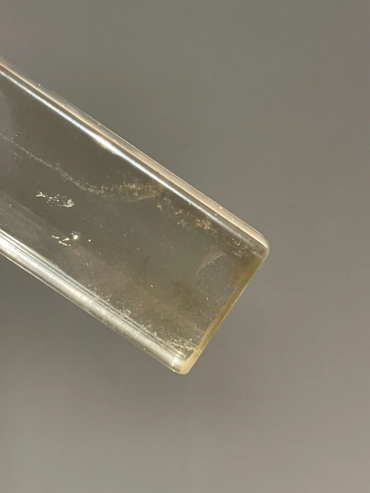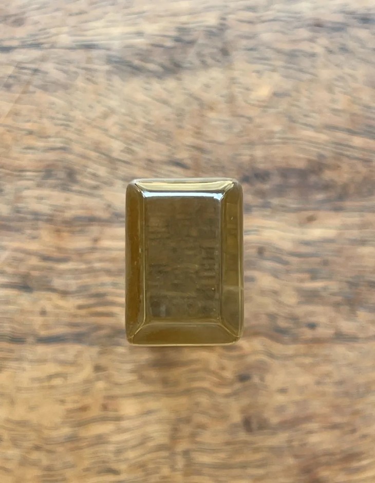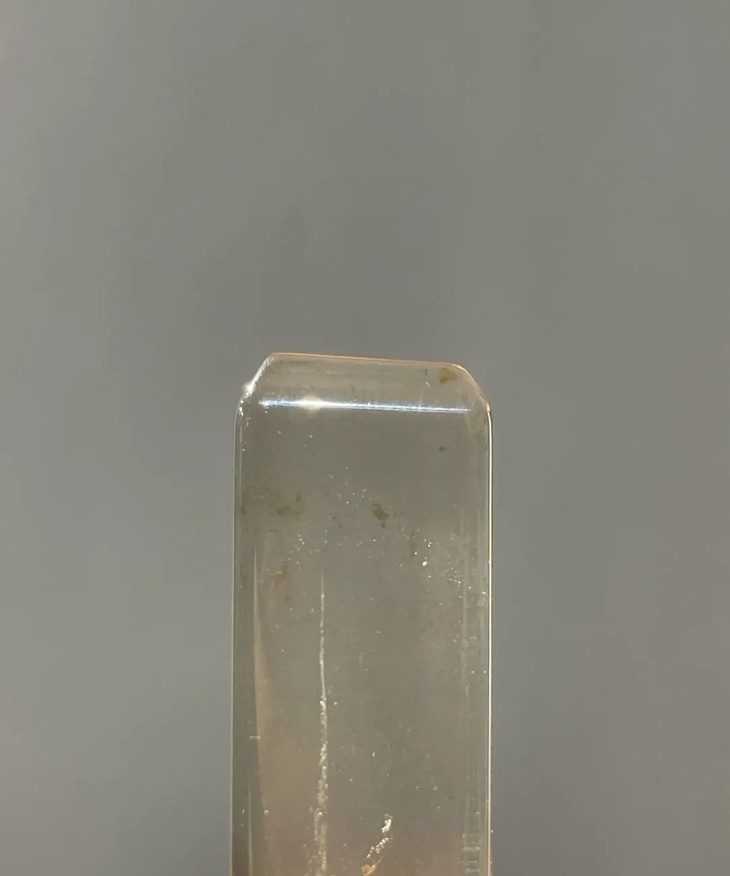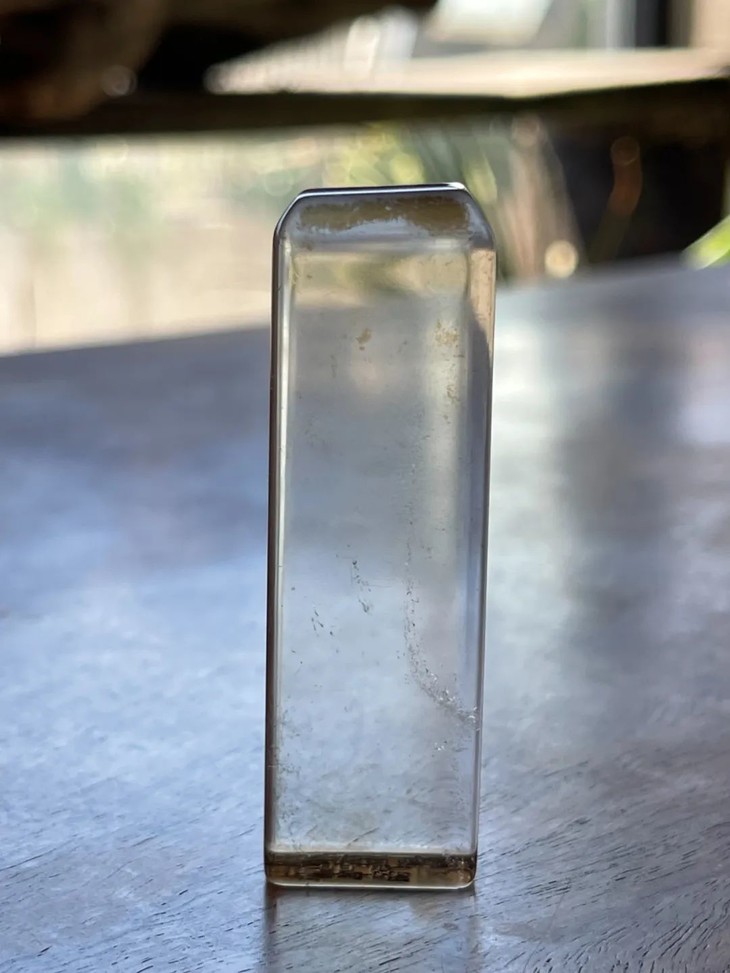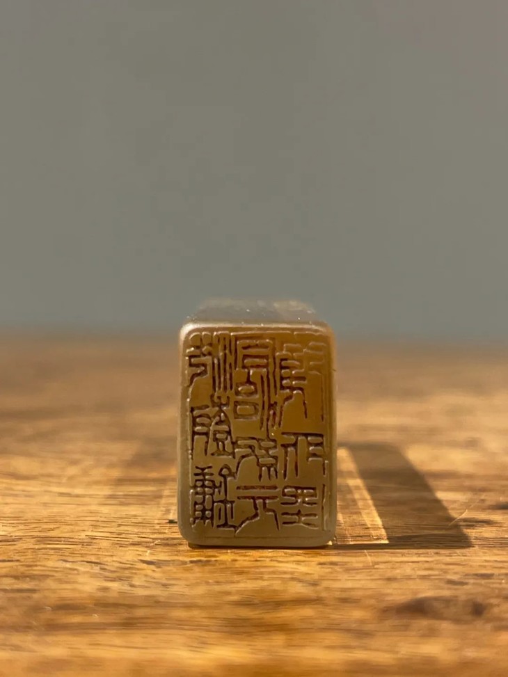 这是一件天然透明白水晶雕刻而成的高长方形文人闲章,此件水晶高长方章,以质地纯净通透偶具天然石纹的透明白水晶雕琢而成,高长方形式简约气质高雅,琢磨精致细腻,晶莹剔透的白水晶内部典型龟裂石纹生动流畅,长方印面刻篆体白文:《沈樹鏞同治紀元後所得》,篆刻刀法刚劲挺拔、端正典雅,一丝不苟、无懈可击,水晶是硬度极高的印石,通常篆刻家不愿意轻易挑战。此一水晶高长方文人闲章,印文中人名“沈樹鏞”,所指的是清代后期藏书家、金石学家沈樹鏞,字均初,一字韵初,号郑斋,川沙城厢(今浦东新区川沙镇)人。咸丰九年(1859年)中举,官至内阁中书。生平收藏书画、秘籍、金石甚丰。尤对碑帖,考订精辟。此一印文是沈氏的藏书章,时常出现在沈氏的藏书内,据说是当时的篆刻名家趙之謙的作品。此水晶高长方文人闲章雕工精湛,形式简约高雅,篆刻精湛刚劲,非名家不可为之,印材质地坚硬,晶莹剔透,除天然晶体结构外纯净无瑕、表面坚硬明亮、柔美雅緻,印文篆刻严谨细致,依其雕刻工艺与风格判断,应是清末名藏书家的收藏印。此水晶印除内部晶体纹理外,保存完好无损。尺寸:章面尺寸:1.9 X 1.4厘米,整体尺寸:高:6.35厘米,长:1.9厘米,宽:1.4厘米。重量:45.3克