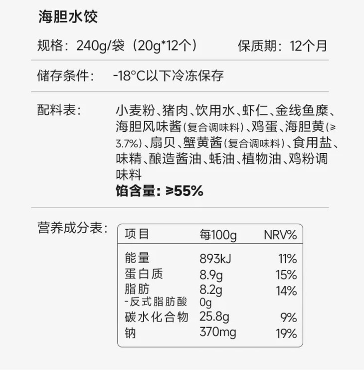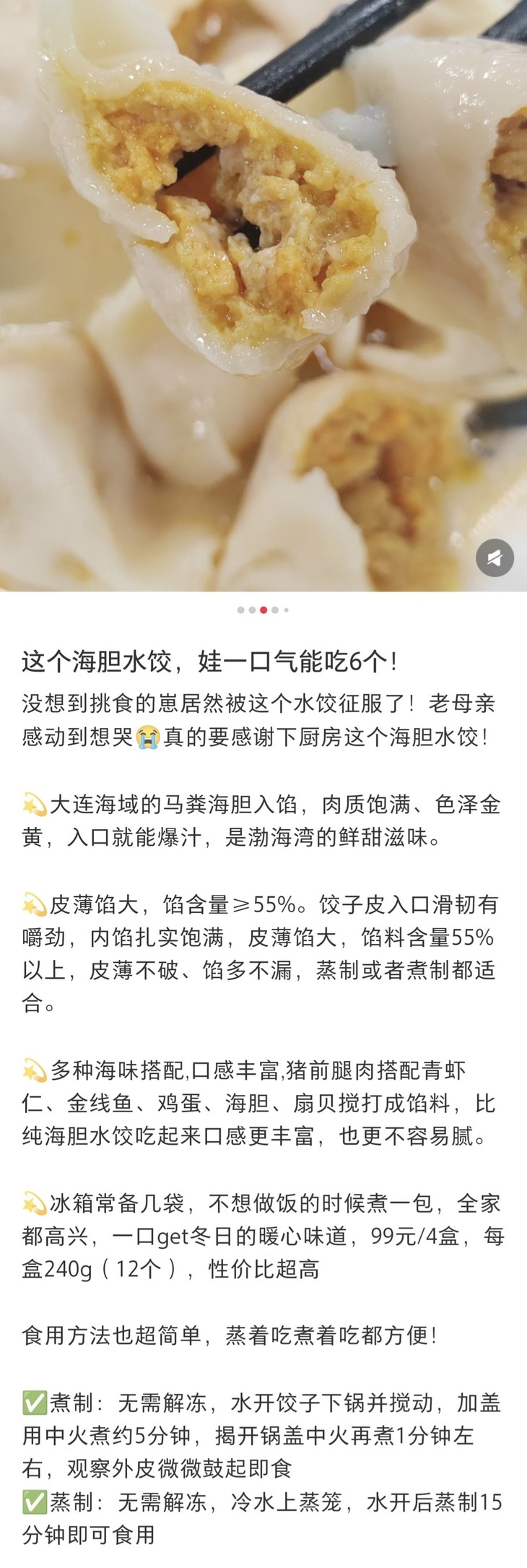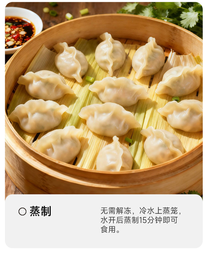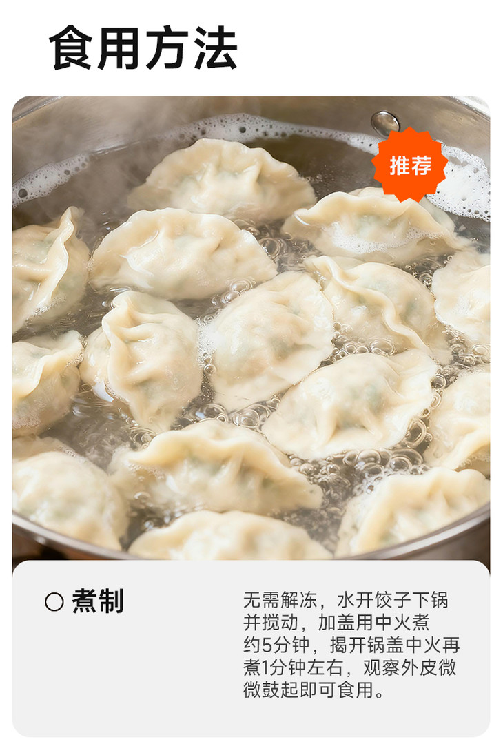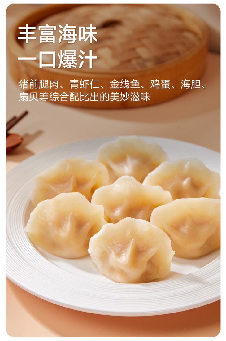 简装,每袋内含12枚,饱满的饺子刚好够1-2人享用。无需解冻,水烧开后下锅煮5分钟,再焖1分钟就能出锅,干捞也很美味;或者冷水上锅蒸 15 分钟,也能解锁热腾腾的鲜美。牙齿轻咬的瞬间,丰盈的汁水率先溢满口腔,紧接着是海胆的鲜甜、虾仁的弹牙、扇贝的嫩滑,还有猪肉的醇香交织在一起,口感层次超丰富,每一口都让人直呼过瘾。直接吃就能品味到海胆最纯粹的鲜,要是蘸上自己喜爱的酱料,风味更是加倍!