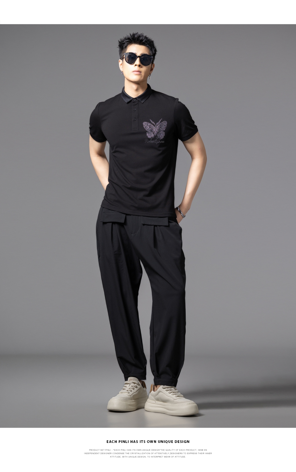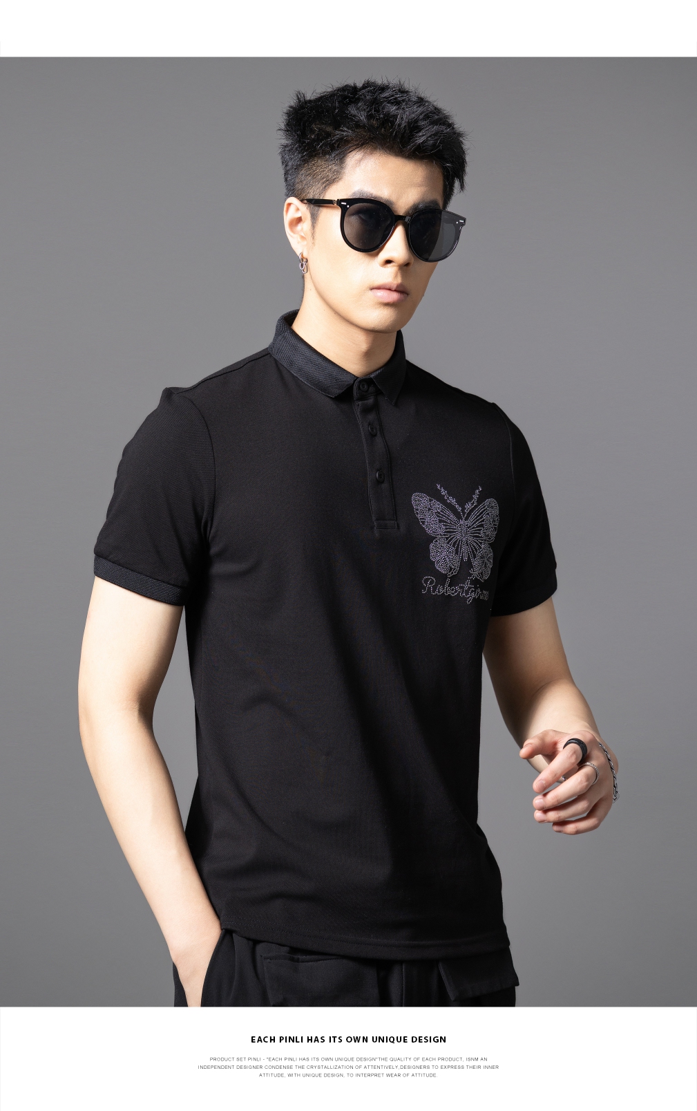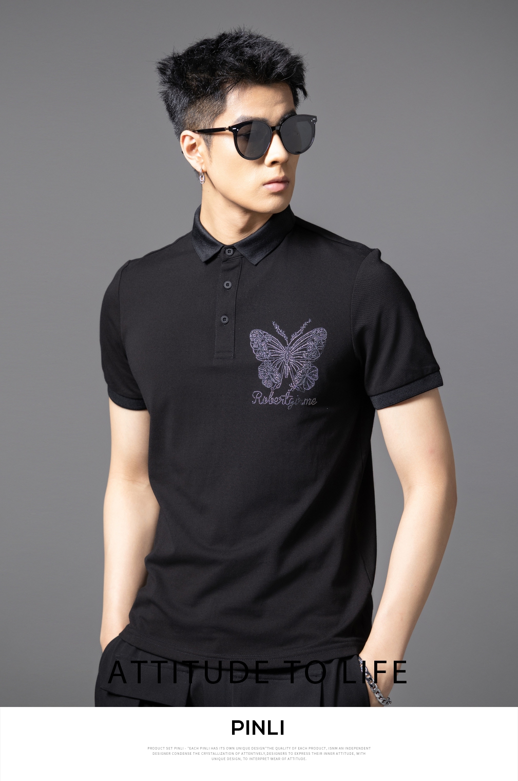 PINLI品立2025夏季新款蝴蝶烫钻修身POLO衫男士商务休闲短袖上衣BG252112090