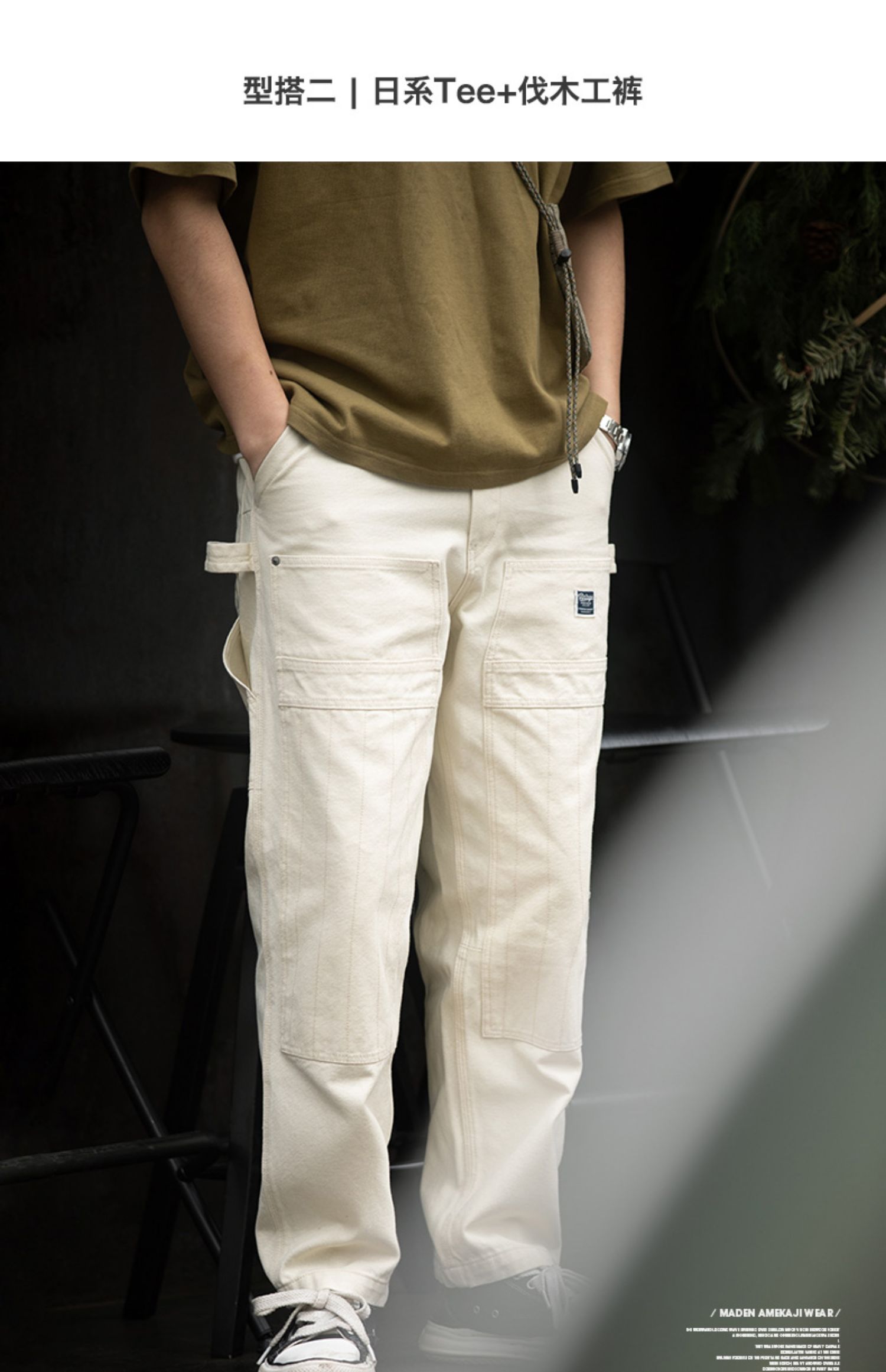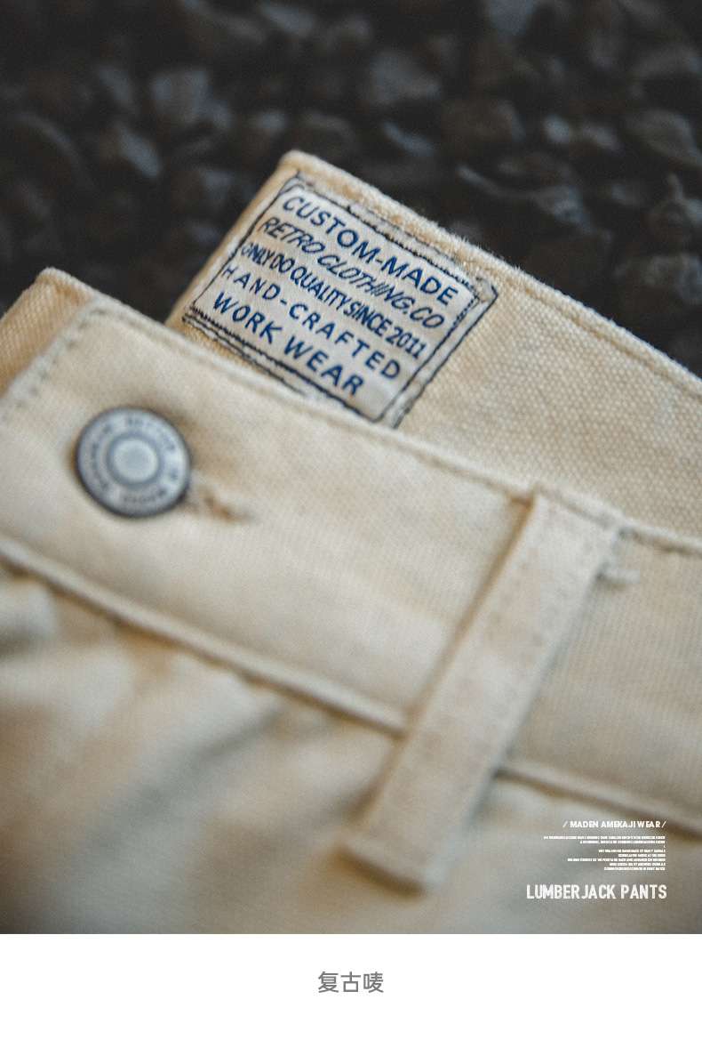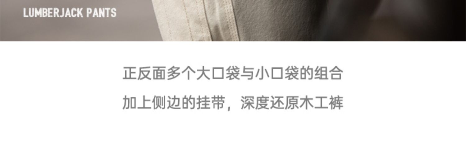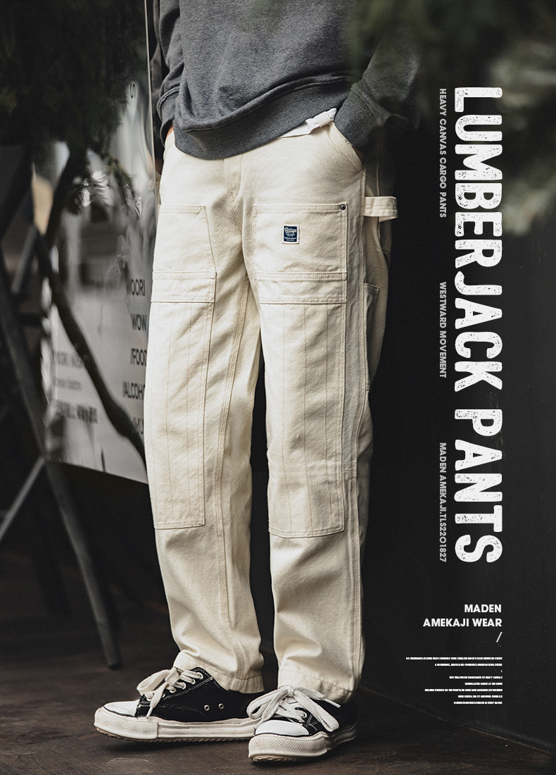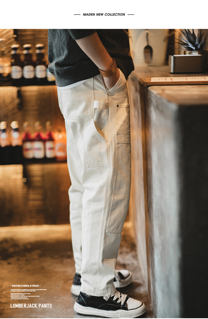工装优选 日系复古做旧宽松米白色牛仔裤水洗直筒多口袋伐木工裤男
