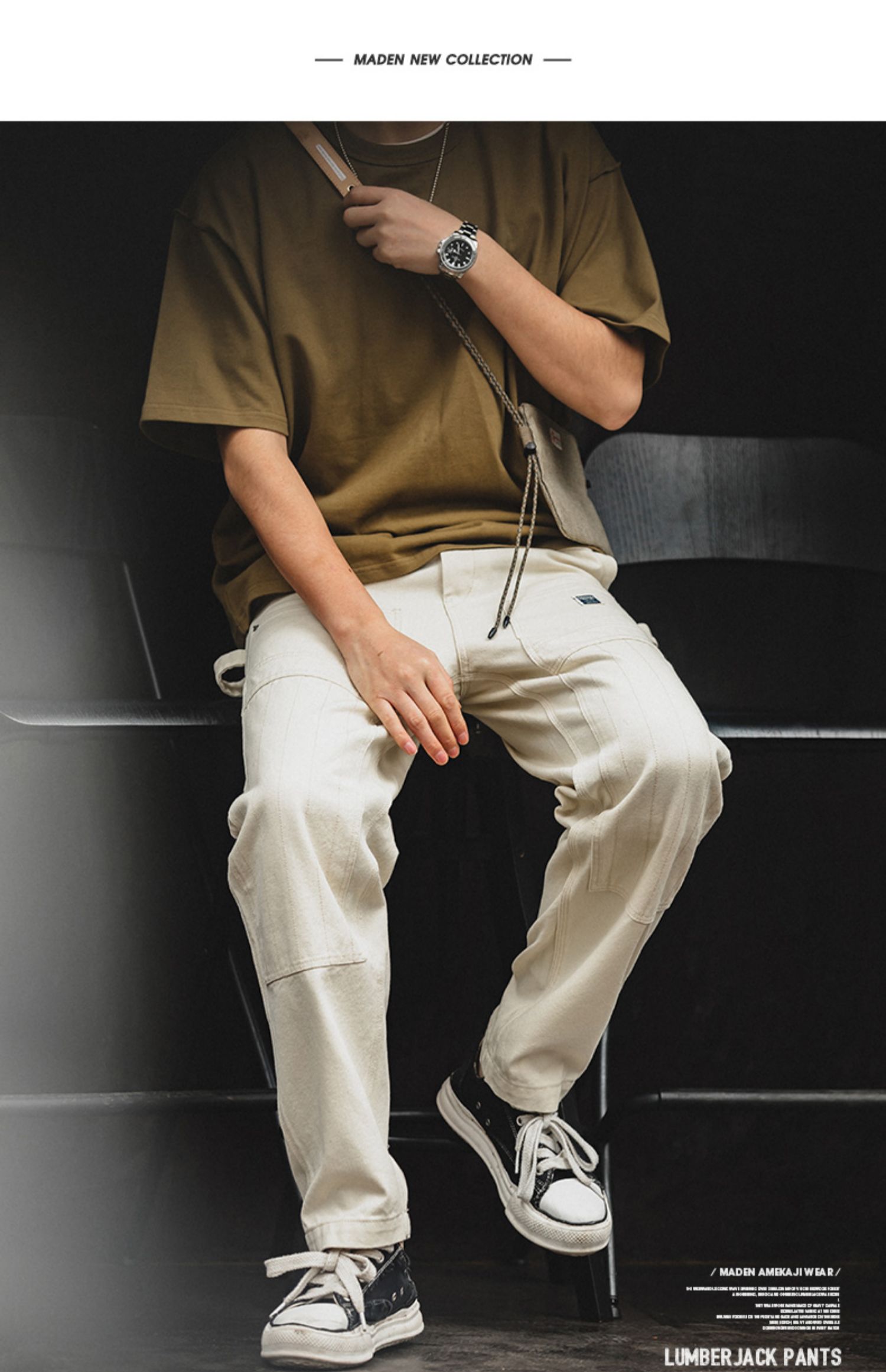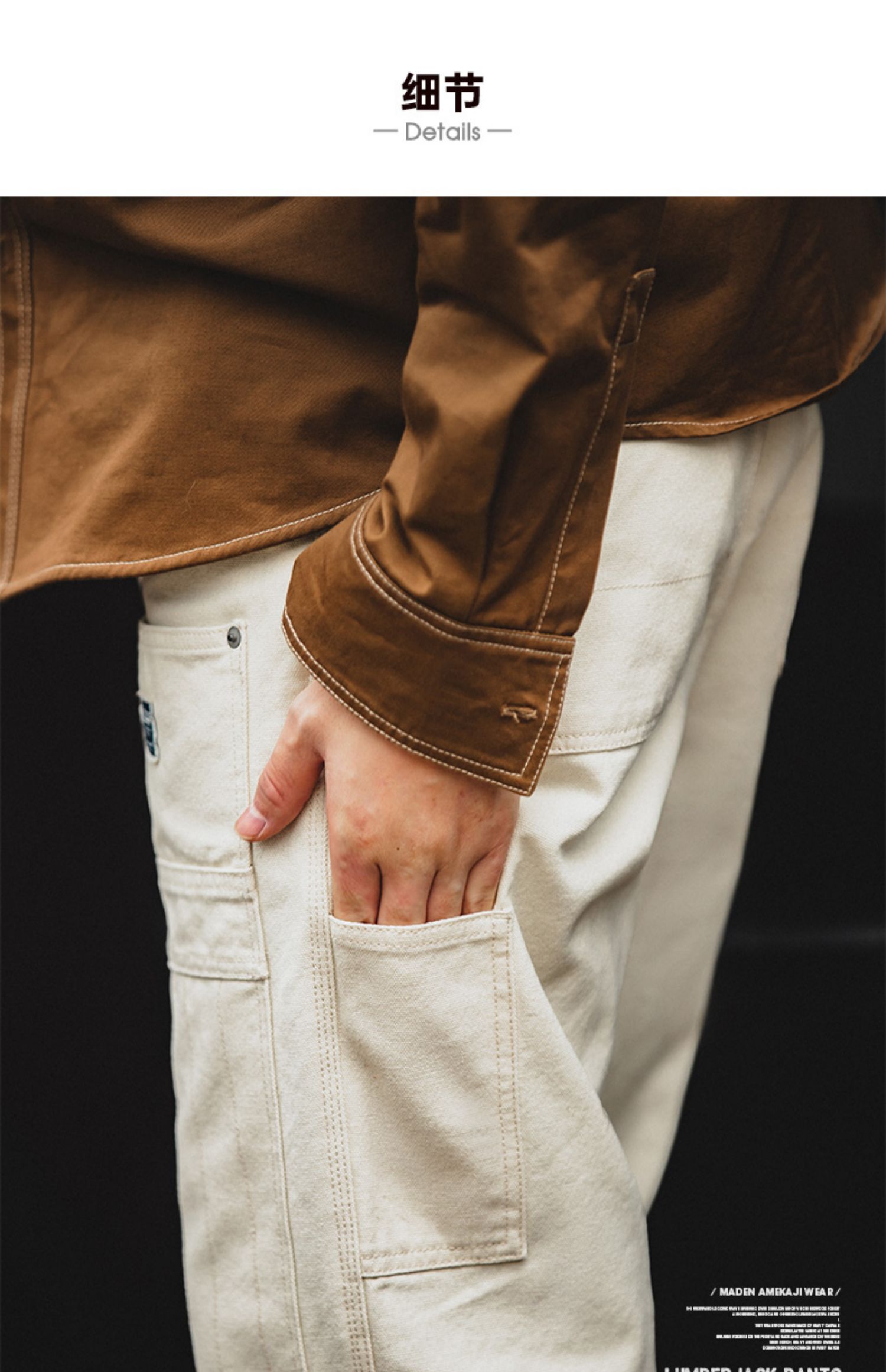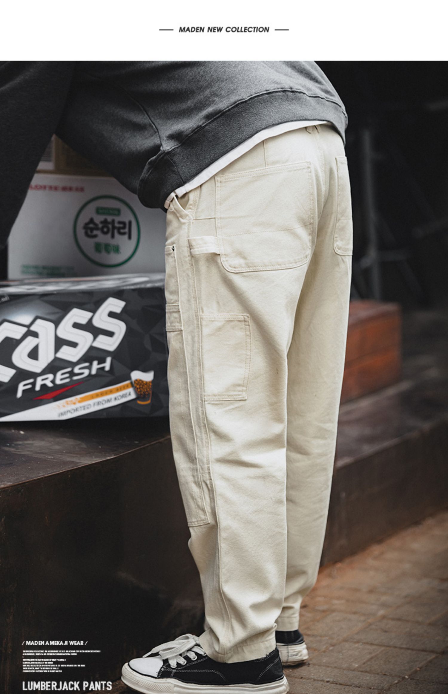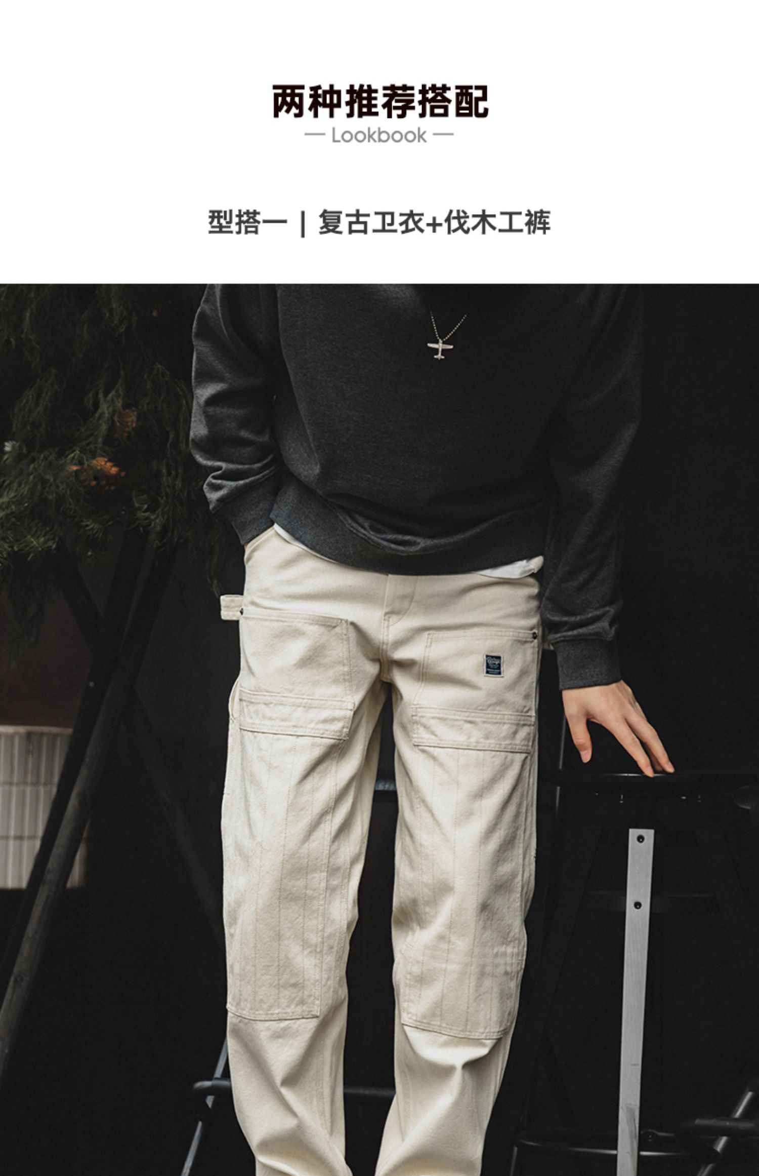 工装优选 日系复古做旧宽松米白色牛仔裤水洗直筒多口袋伐木工裤男