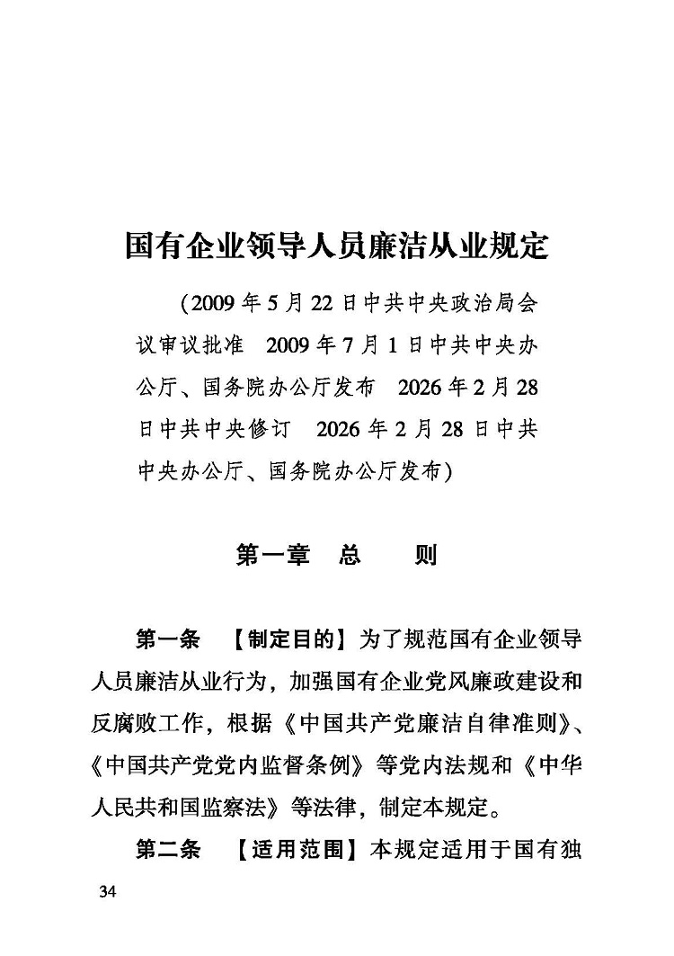 2026年2月28日修订发布、自发布之日起施行的《国有企业领导人员廉洁从业规定》