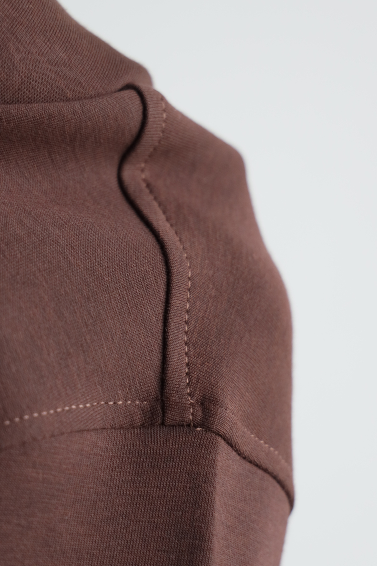 高克重深棕色双面厚实面料,丝光质感,有弹性,版型微宽松
