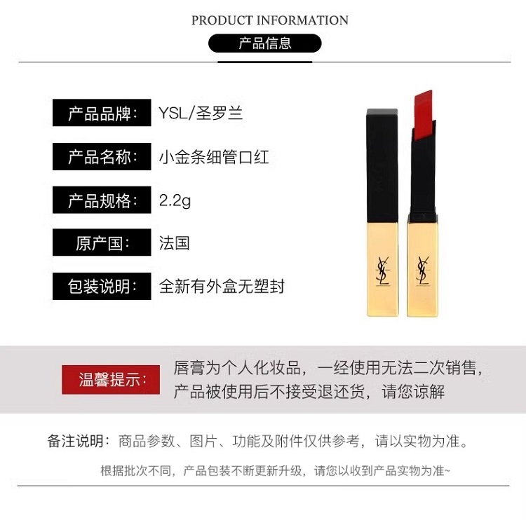 【保税仓美妆】YSL圣罗兰小金条细管纯口红2.2g【福州保税仓直发】