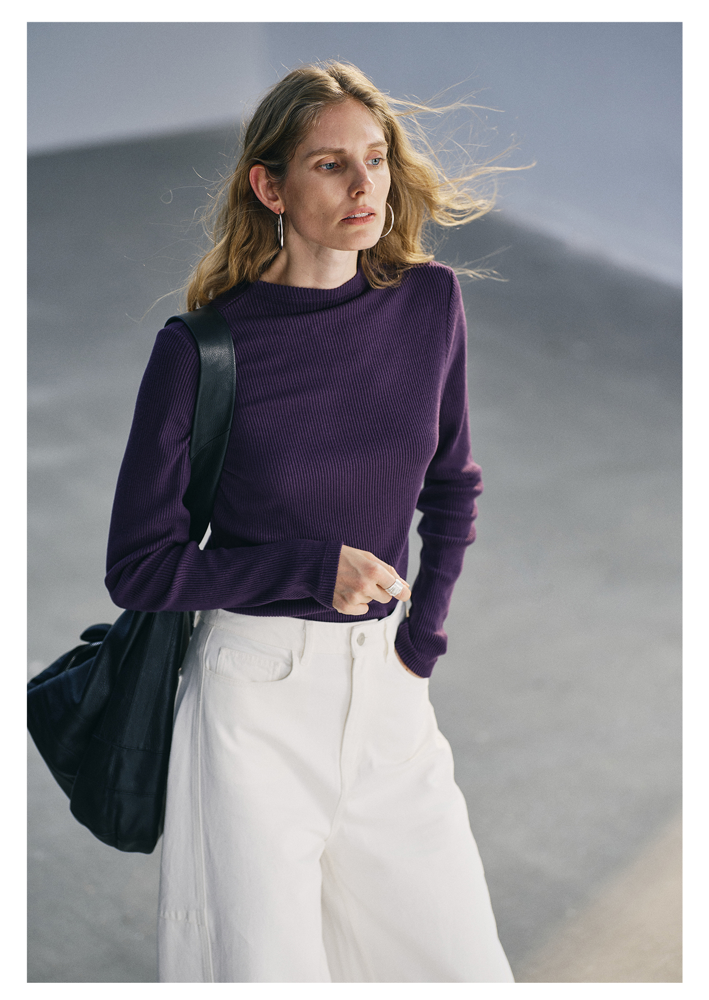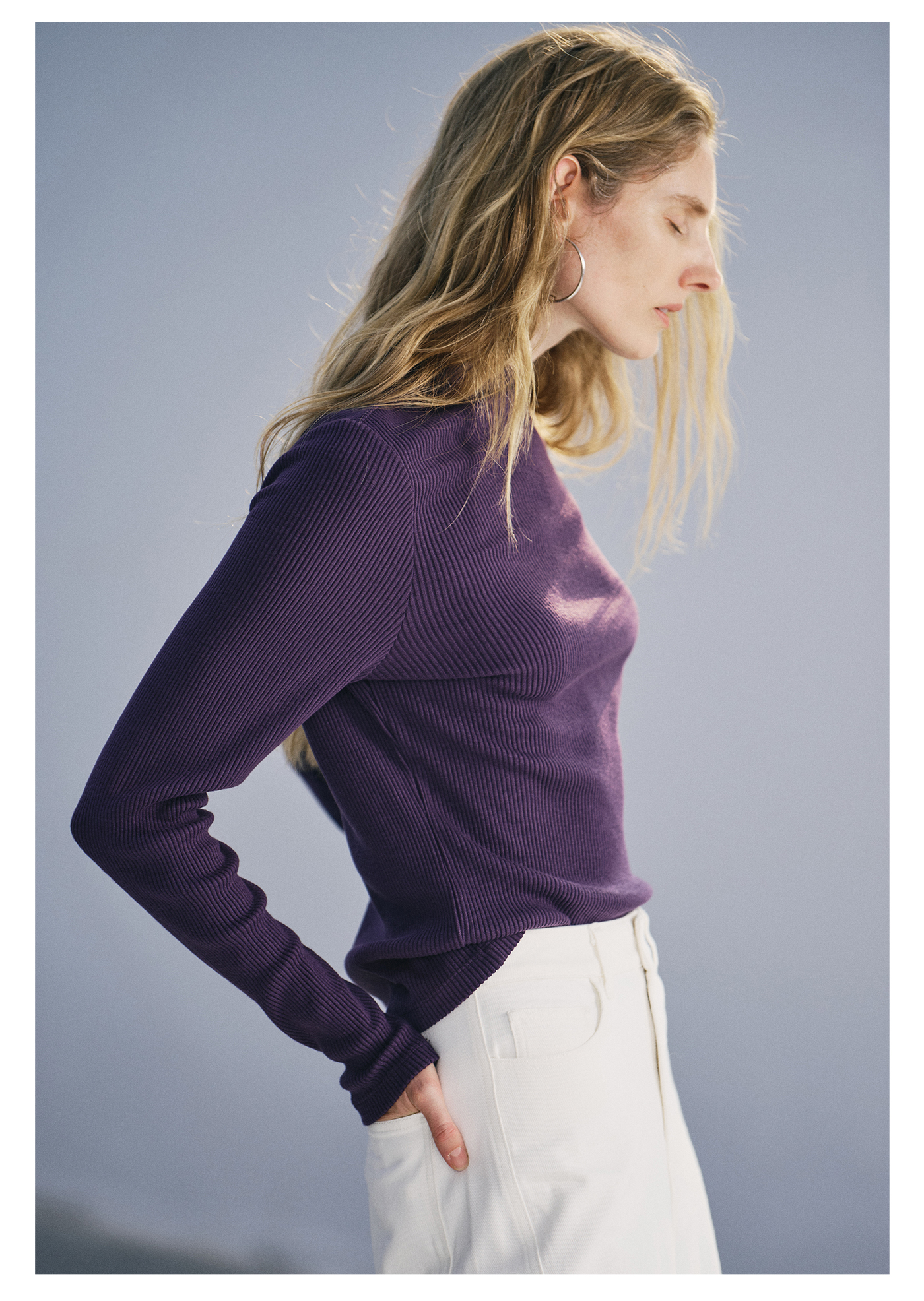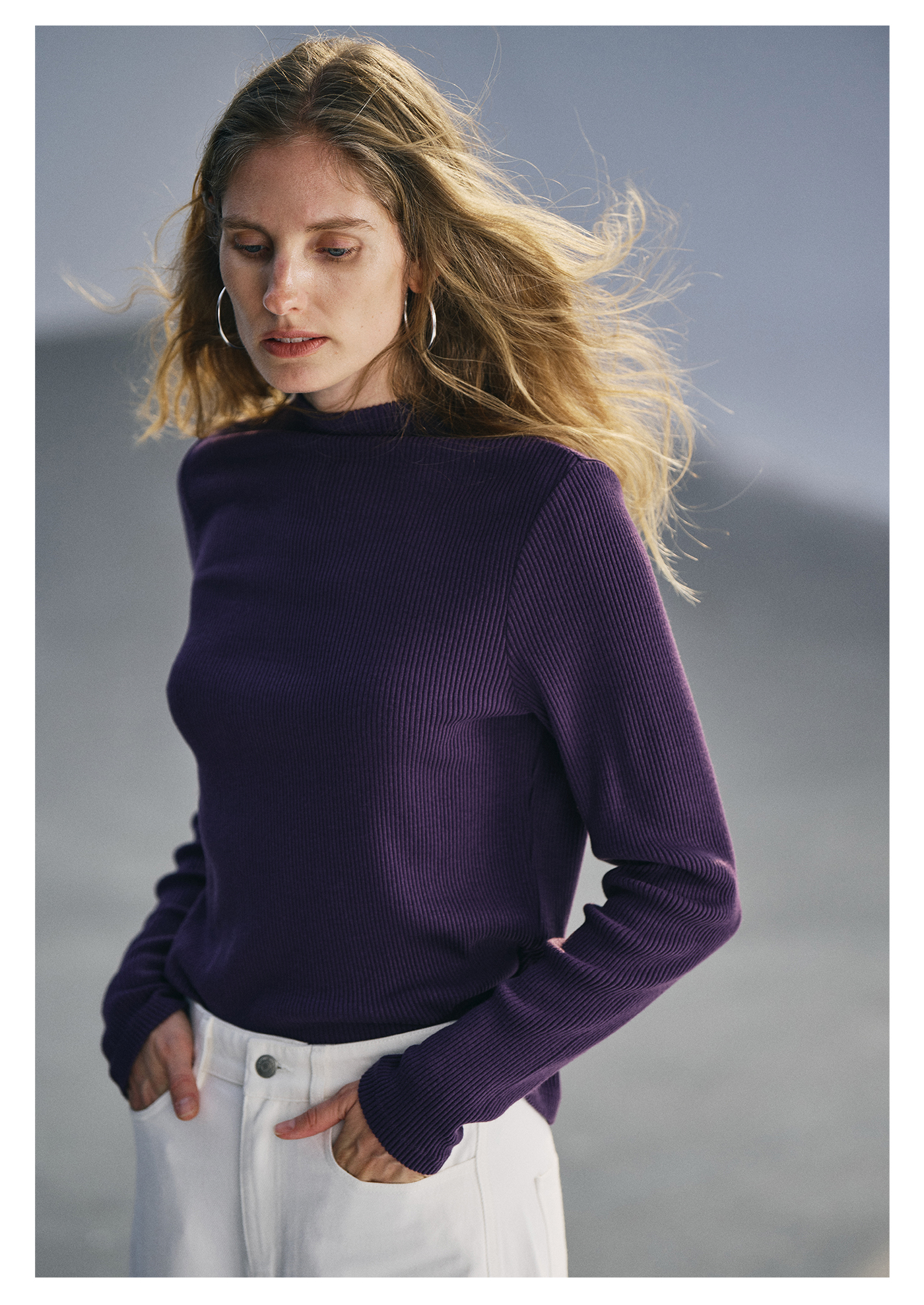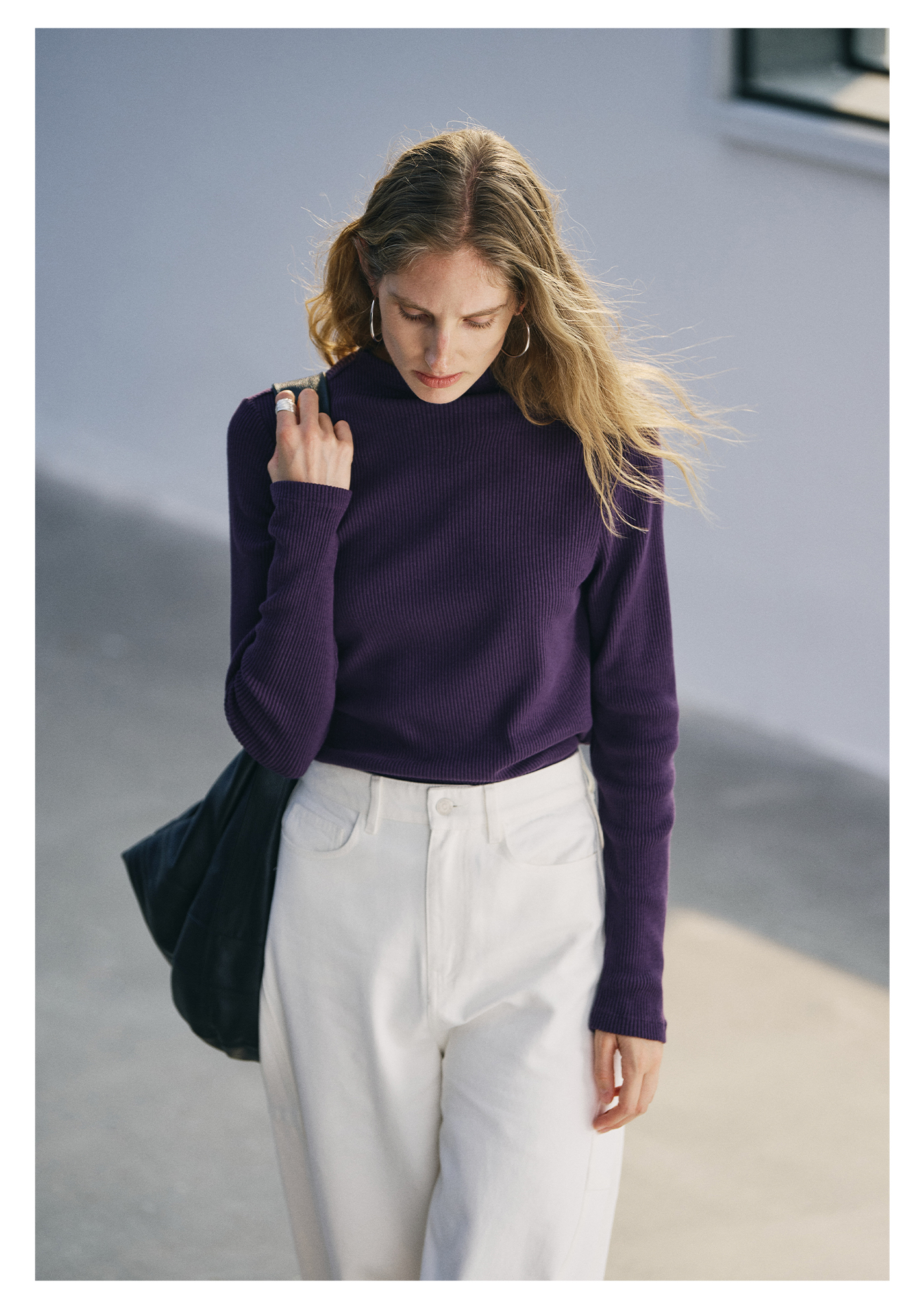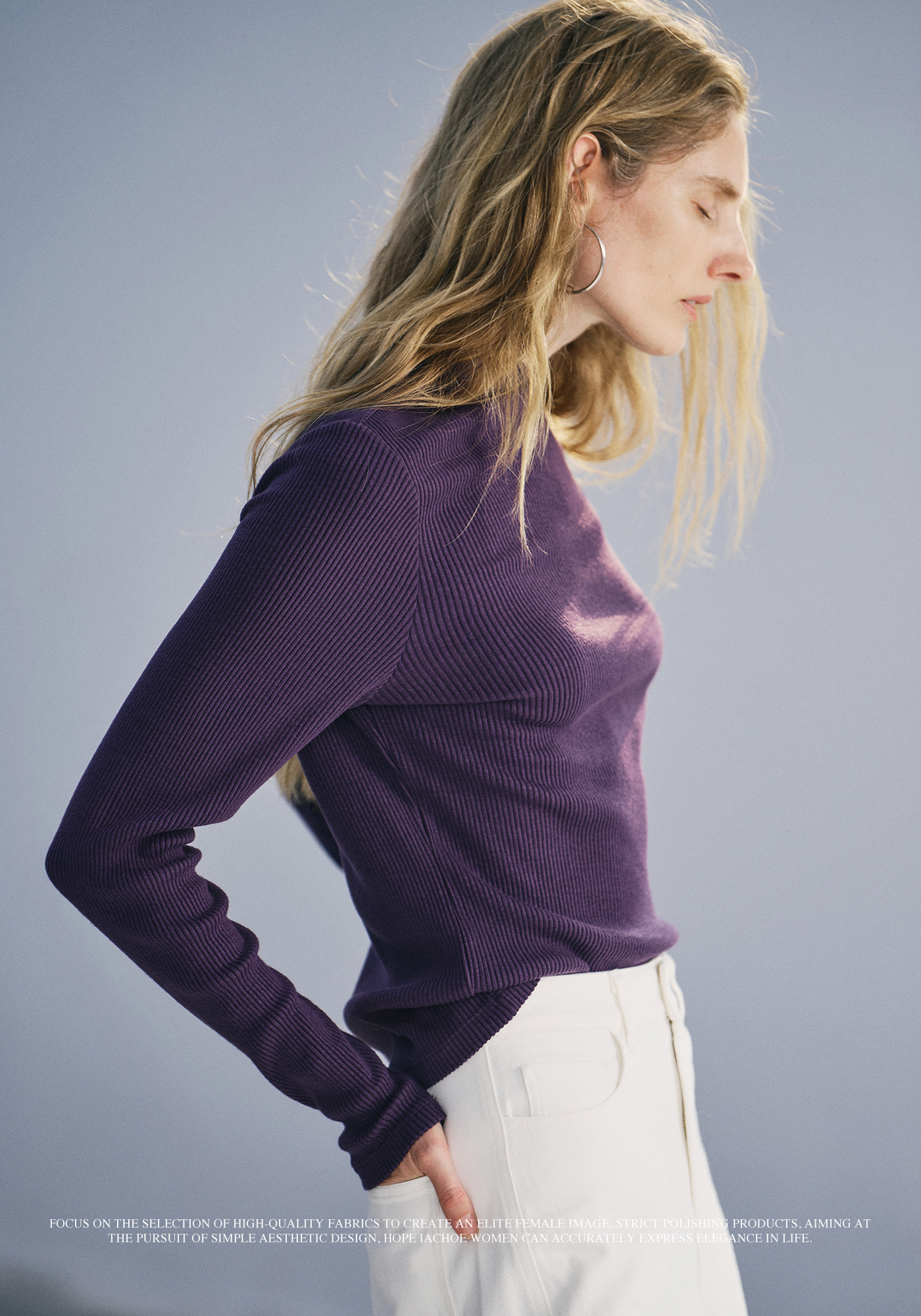 棉仓3661501012-半高领坑条打底衫女 25秋冬紫色修身长袖T恤内搭