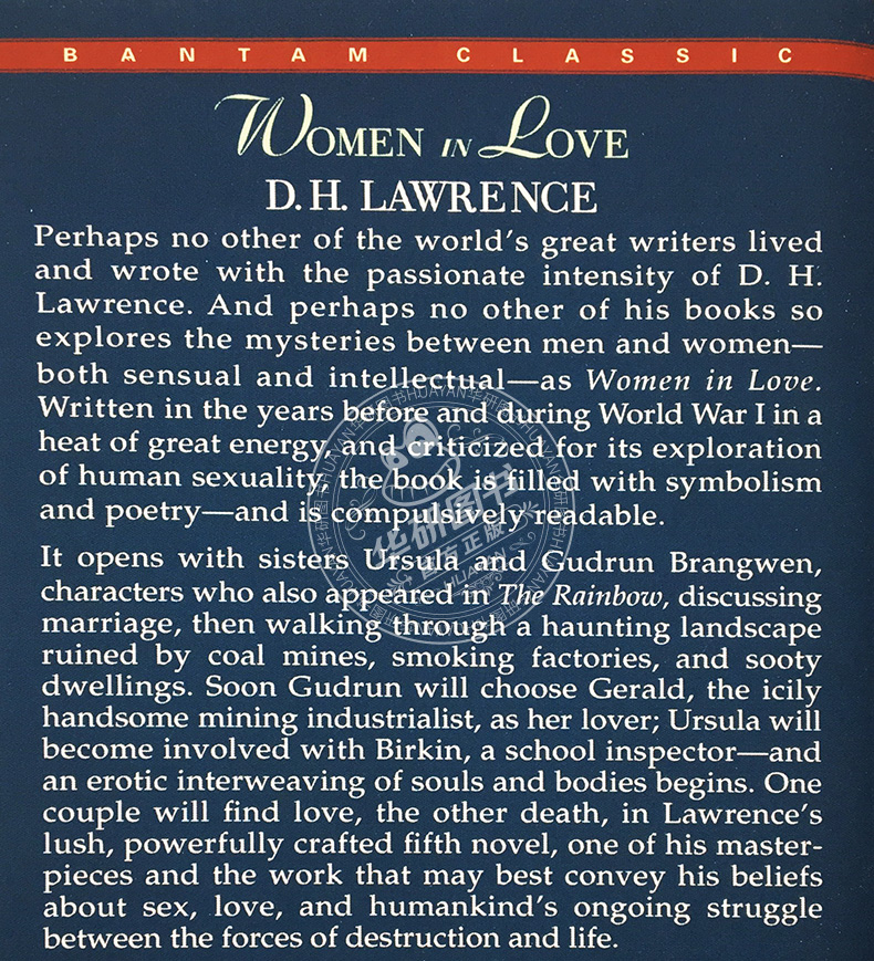 Women in Love《恋爱中的女人》是The Rainbow《虹》之姊妹篇,代表了劳伦斯小说创作的高成就。出版伊始,它曾因为情爱描写而饱受抨击;但随着时间的流逝,成为一部启示录般的作品。劳伦斯认为,它“揭示了生命之隐秘的地带”。