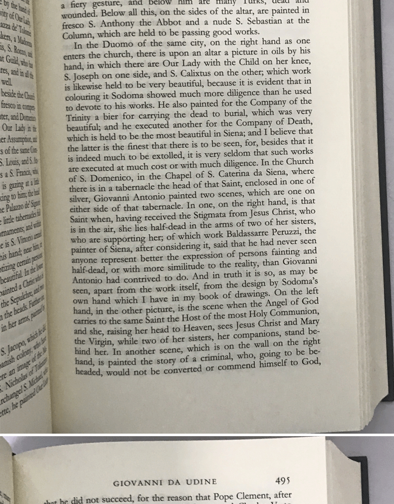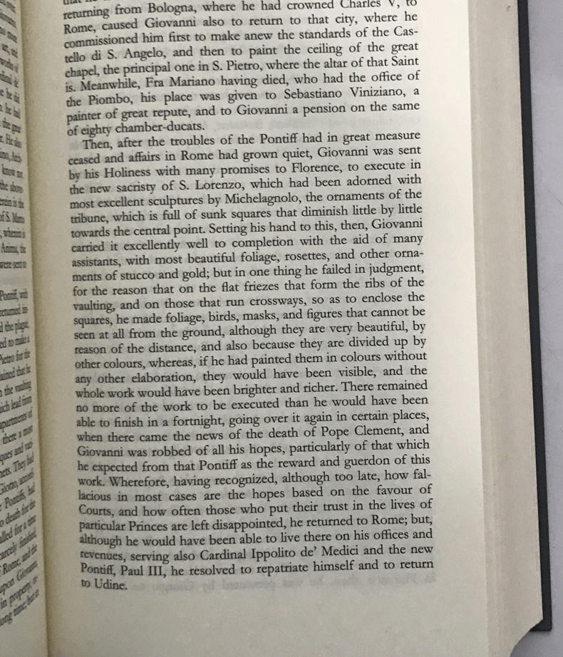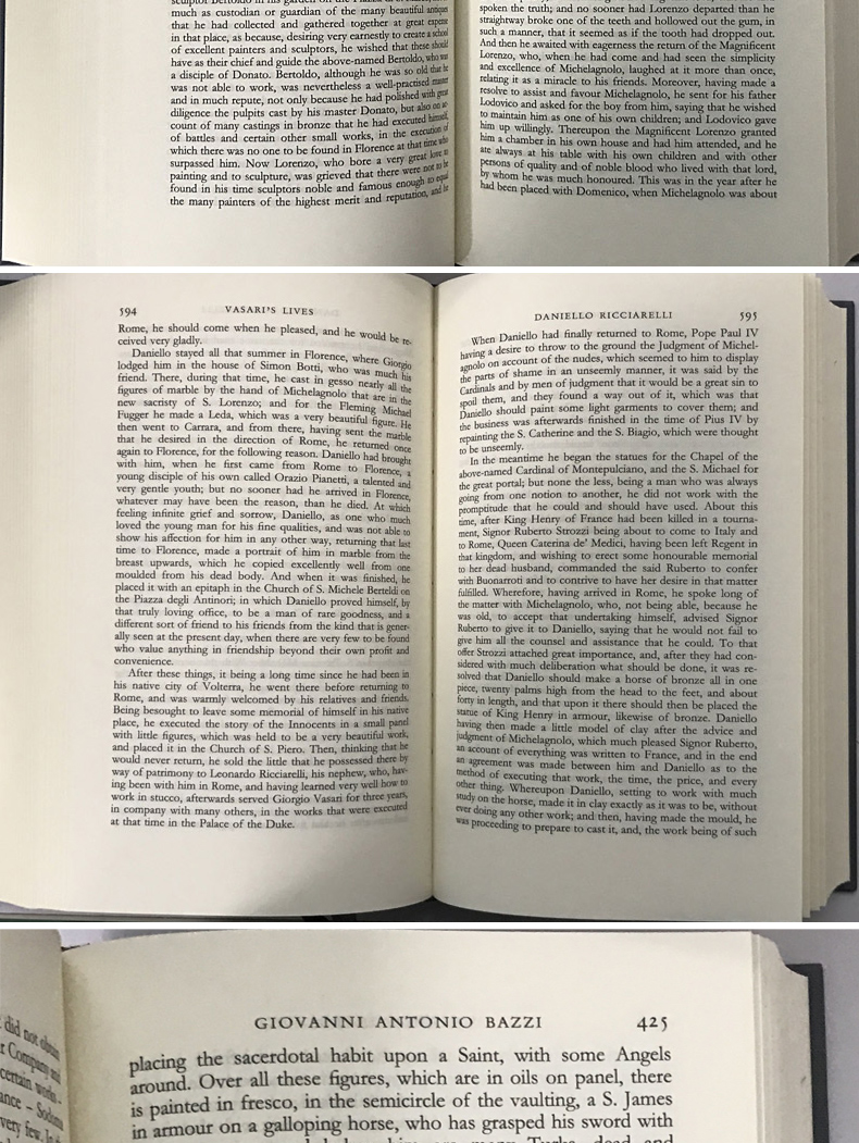 Giorgio Vasari was born in 1511 at Arezzo in Tuscany. While still a boy he was introduced to Cardinal Silvio Passerini who put him to study in Florence with Michelangelo — who later became a close friend — then with Andrea del Sarto. He left Florence when his patron, Duke Alessandro, was assassinated, and wandered round Italy filling his notebooks with sketches; it was during this period that he conceived the idea of the Lives. By now, in his thirties, Vasari was a highly successful painter and when his Lives were published they were received enthusiastically. He returned to Florence in 1555 to serve Duke Cosimo who appointed him architect of the Palazzo Vecchio. After a grand tour of Italian towns he published the revised and enlarged edition of his Lives in 1568. Vasari spent the rest of his life in a glow of self-satisfaction and public recognition, and in 1971 he was knighted by Pope Pius V. He died in 1574.