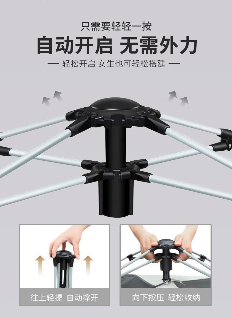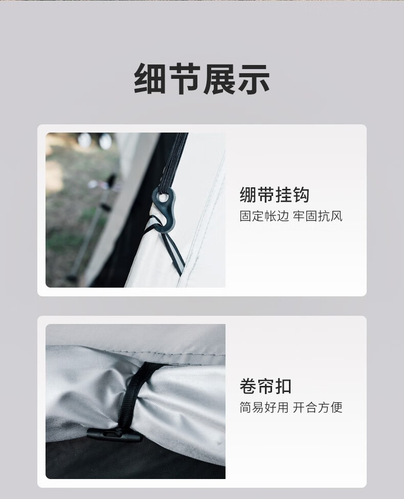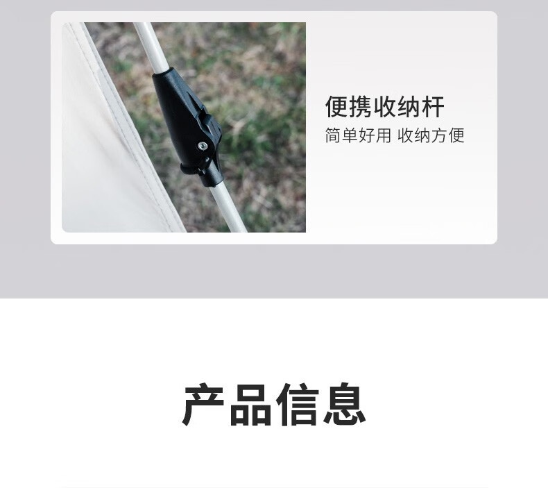 商品配件:外包装袋+地钉*10+调节扣*6+防风绳*6+防雨布*1+支撑杆*6节2根