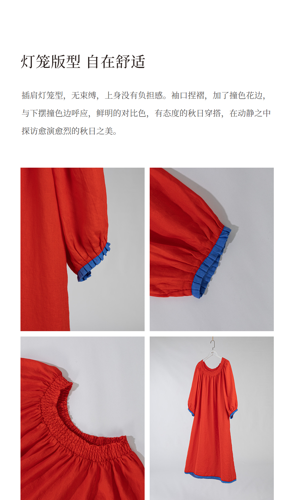 * 绽放602朵/法国进口双支亚麻花边领灯笼版型重磅拼色度假连衣裙