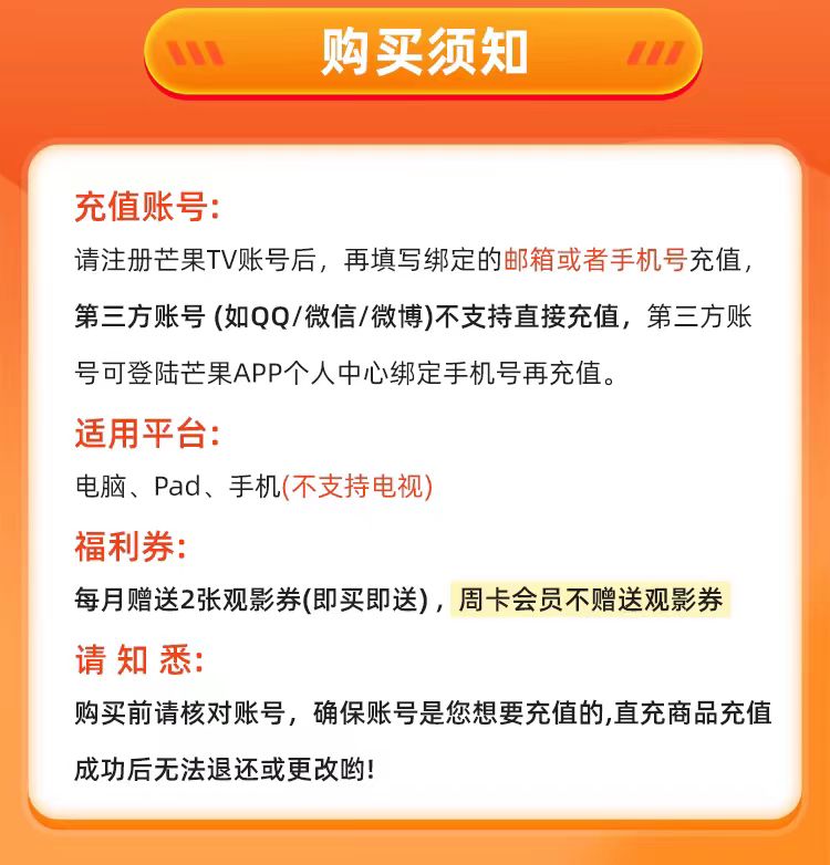 | 购买须知: ★ 下单前请您务必仔细阅读产品中各项说明,然后在下单订购 ★ 下单购买后,则视为您已仔细阅读本产品中的各项说明,并认同此声明以及产品规则,否则责任自负,不在售后服务之内 产品说明: 支持端口:手机、Pad、电脑【不支持电视端】 充值账号:请填写芒果TV登录绑定的手机号,不支持在备注填写充值号码,仅支持下单默认的充值手机号,请不要填错 充值时间:本产品为快速直充,下单后3-30分钟左右到账 购买限制:每笔订单限购1单,多次购买请分开下单 到账核实:下单后30分钟未到账,请先登录自己的账号查看,退出重新登录查看,如确实未到账,请及时联系客服 开票说明:本产品价格不包含发票,如需发票请联系客服咨询具体情况 注意事项: 顾客下单后自动充值,发货状态并不会立刻变成已发货,已经充值成功无法退换 虚拟充值产品不适用于七日无理由退货条款,一经购买,不退不改 因个人原因造成充值错误,责任自负,不予退款 如遇市场断货问题,平台将无条件为客户进行退款 |