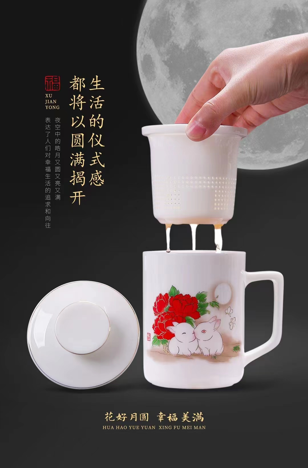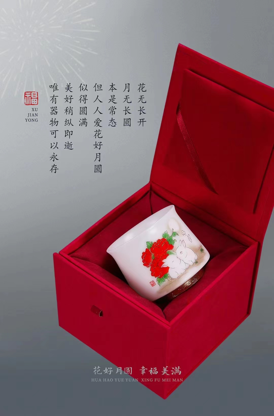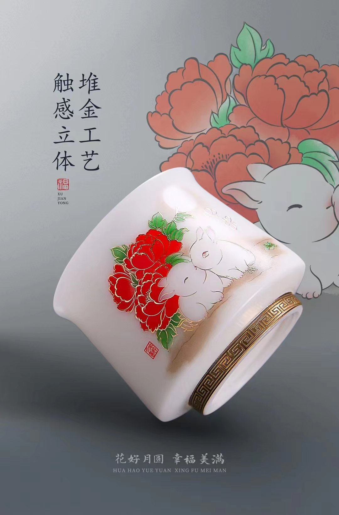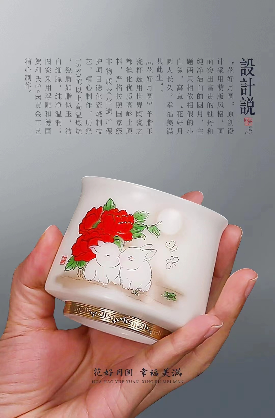 【花好月圆人长久 幸福美满共此生】花好月圆禅定杯、铃铛杯、水杯三件套,徐建勇老师签章,瓷质温润如玉 迎光透亮,浮雕堆金工艺 触感立体,珍藏品鉴 送礼臻品 商品图8