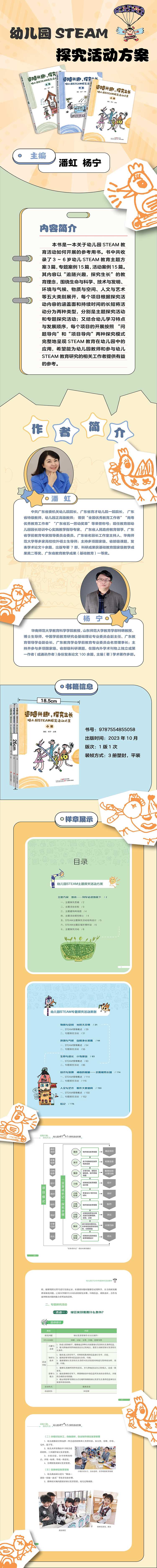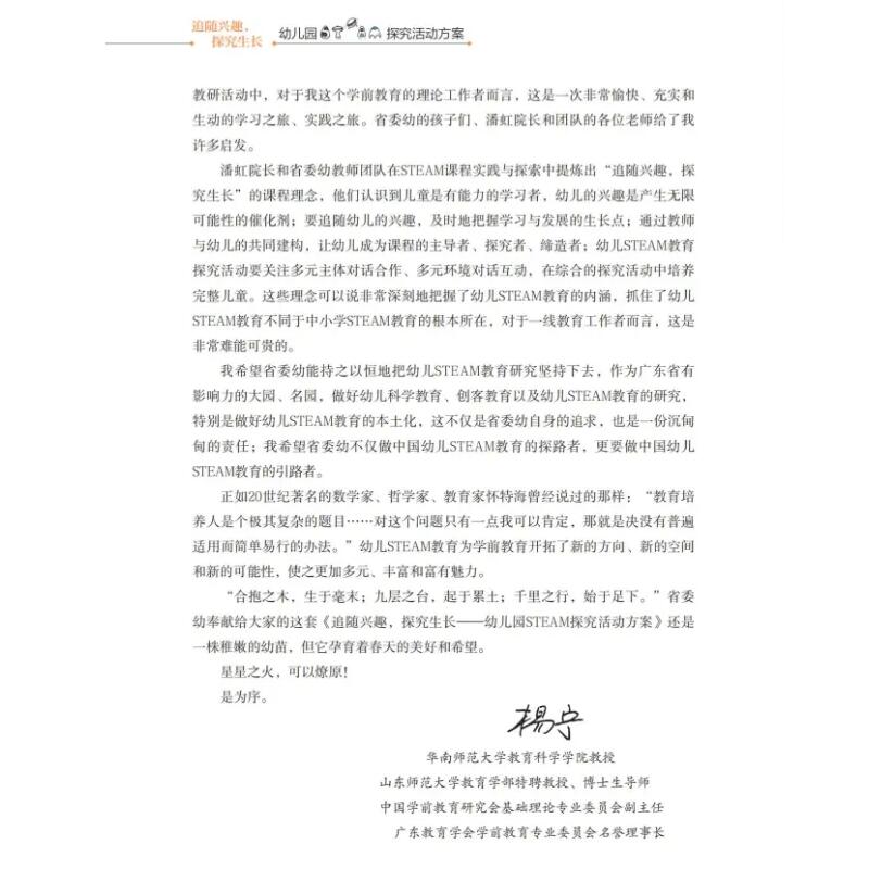 潘虹:中共广东省委机关幼儿院院长、广东省育才幼儿院一院院长, 广东省特级教师,幼儿园正高级教师; 曾获;全国优秀教育工作者;南粤优秀教育工作者;广东省五一劳动奖章等荣誉称号;现任教育yu部幼儿园园长培训中心实践教学指导专家、 广东省人民政府教育督学、广东省学前教育专家指导委员会委员、广东省名园长工作室主持人、华南师范大学等多家高校校外硕士生导师;主持多项国家级、省部级课题,发表学术论文十余篇,出版专著 7 部,科研成果获基础教育国家级教学成果奖二等奖、广东省教育教学成果(基础教育)一等奖。 杨宁:华南师范大学教育科学学院教授,山东师范大学教育学部特聘教授、博士生导师,中国学前教育研究会基础理论专业委员会副主任、广东教育督导学会副会长、广东教育学会学前教育专业委员会名誉理事长;主持并参与多项国家级、省部级科研课题,在国内外学术刊物上独立或第一作者(或通讯作者)身份发表论文 100 余篇,主编(著)学术著作多部。