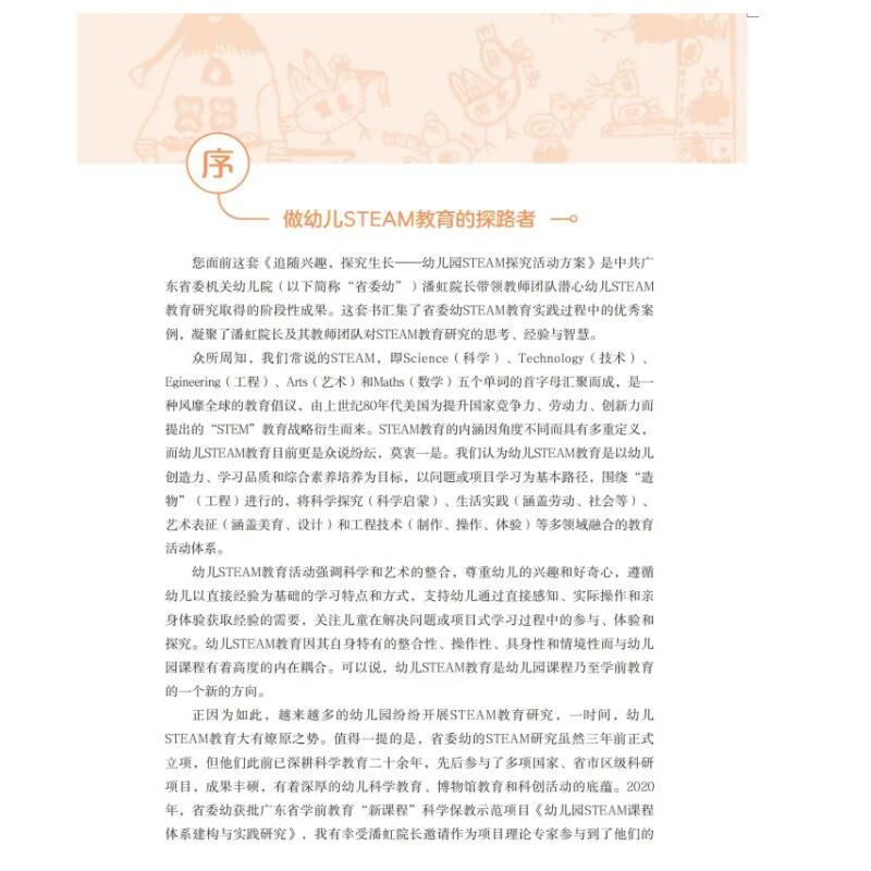 本书是一本关于幼儿园STEAM教育活动如何开展的参考用书。书中共收录了3~6岁幼儿STEAM教育主题方案3篇,专题案例15篇,活动案例15篇。其内容以;追随兴趣,探究生长的教育理念,围绕生命与科学、技术与发明、环境与气候、物质与空间、人文与艺术等五大类别展开,每个项目根据探究活动内容的涵盖面和持续时间的长短将活动分为两种类型,分别是主题探究活动和专题探究活动;又结合幼儿学习特点与发展顺序,每个项目的开展按照 ;问题导向和;项目导向两种探究模式完整地呈现STEAM教育在幼儿园中的应用,希望能为幼儿园教师和参与幼儿STEAM教育研究的相关工作者提供有益的参考。