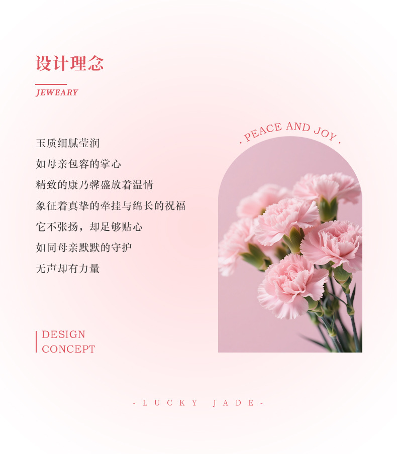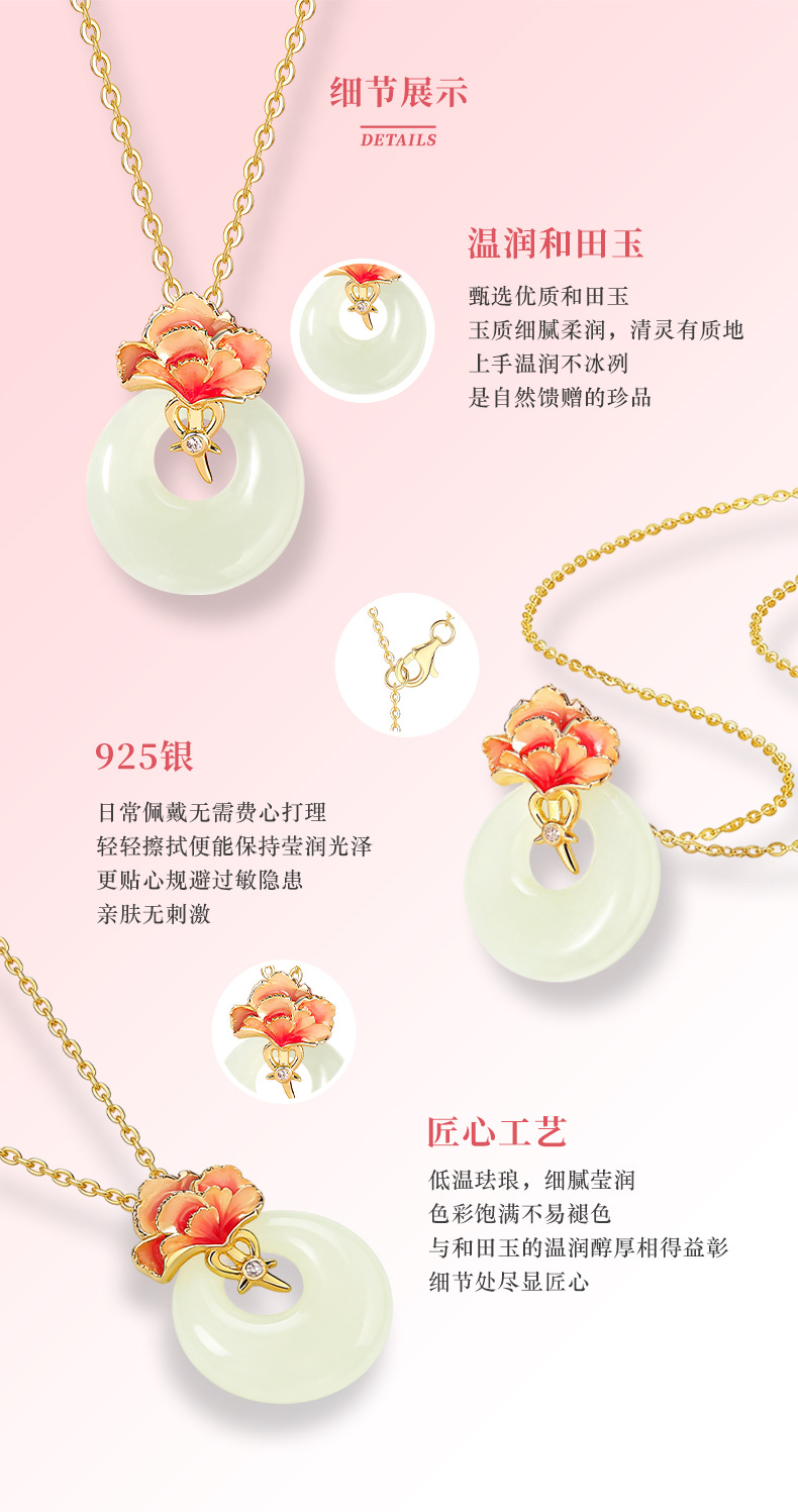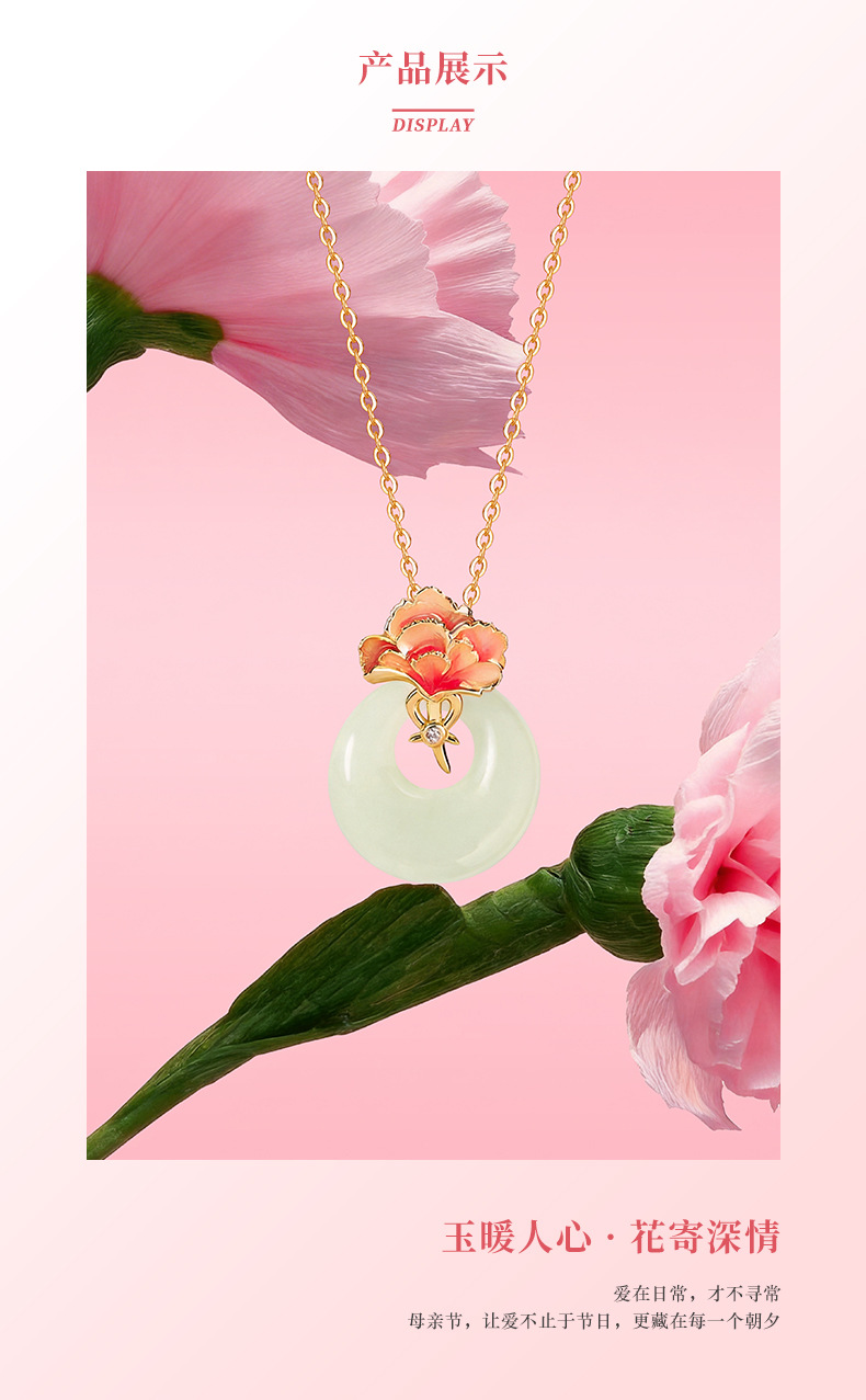 六鑫珠宝 新中式天然和田玉康乃馨吊坠 s925纯银 母亲节送妈妈礼物