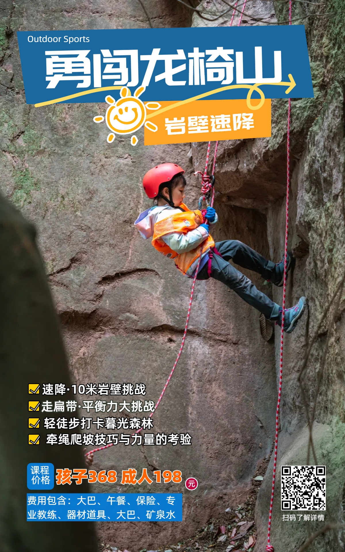 本期户外营之【勇闯龙椅山】 亲子户外挑战营为都市家庭打造专属的"勇气训练场"!当孩子习惯了电子屏幕和游乐设施,我们更想带他们体验——在安全绳索的保护下,用双手丈量岩壁的真实触感,在伙伴鼓励声中完成10米高空速降挑战!