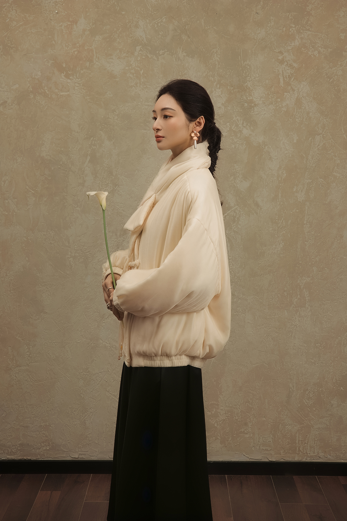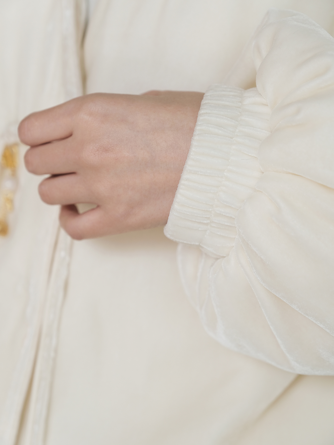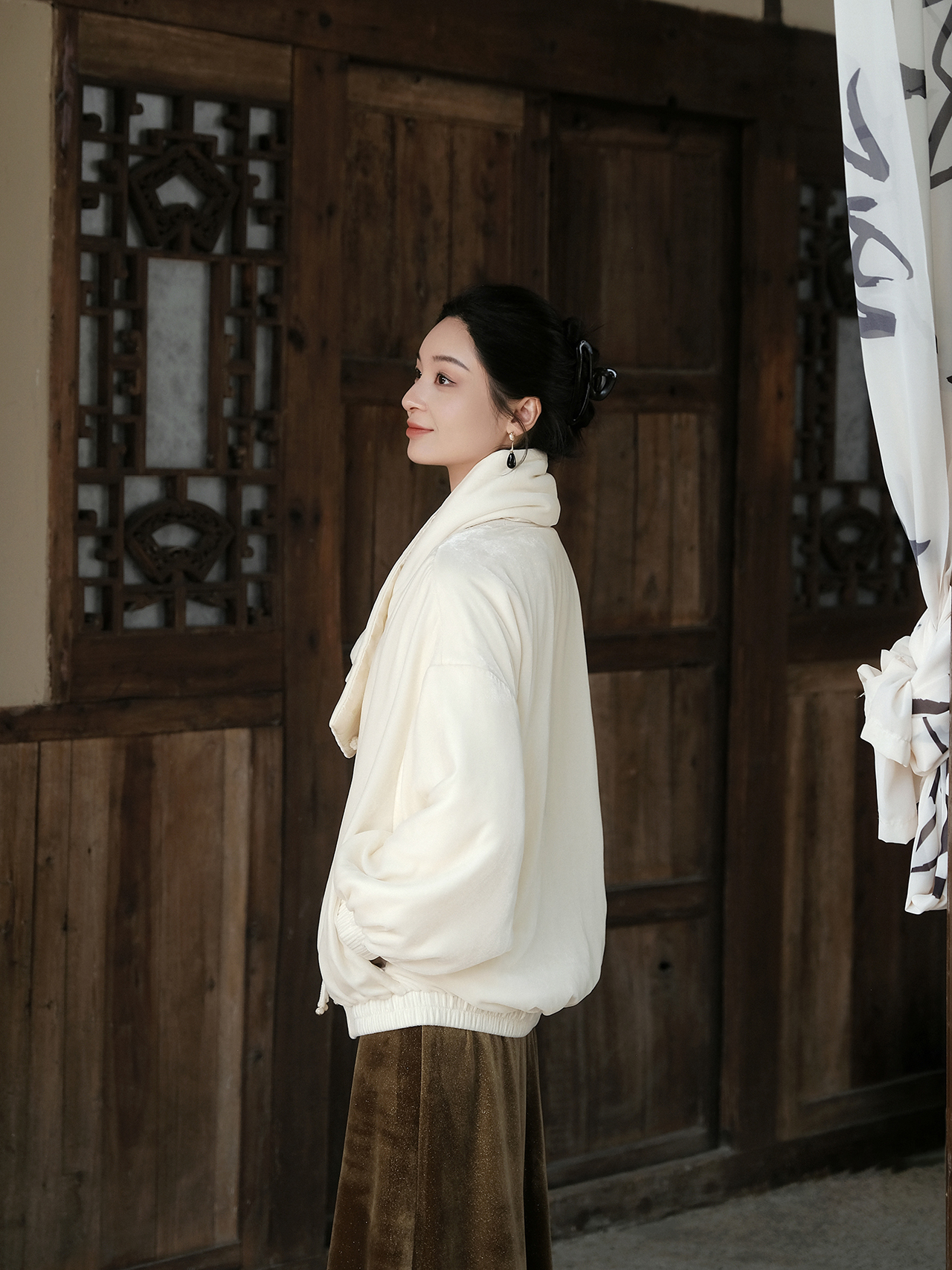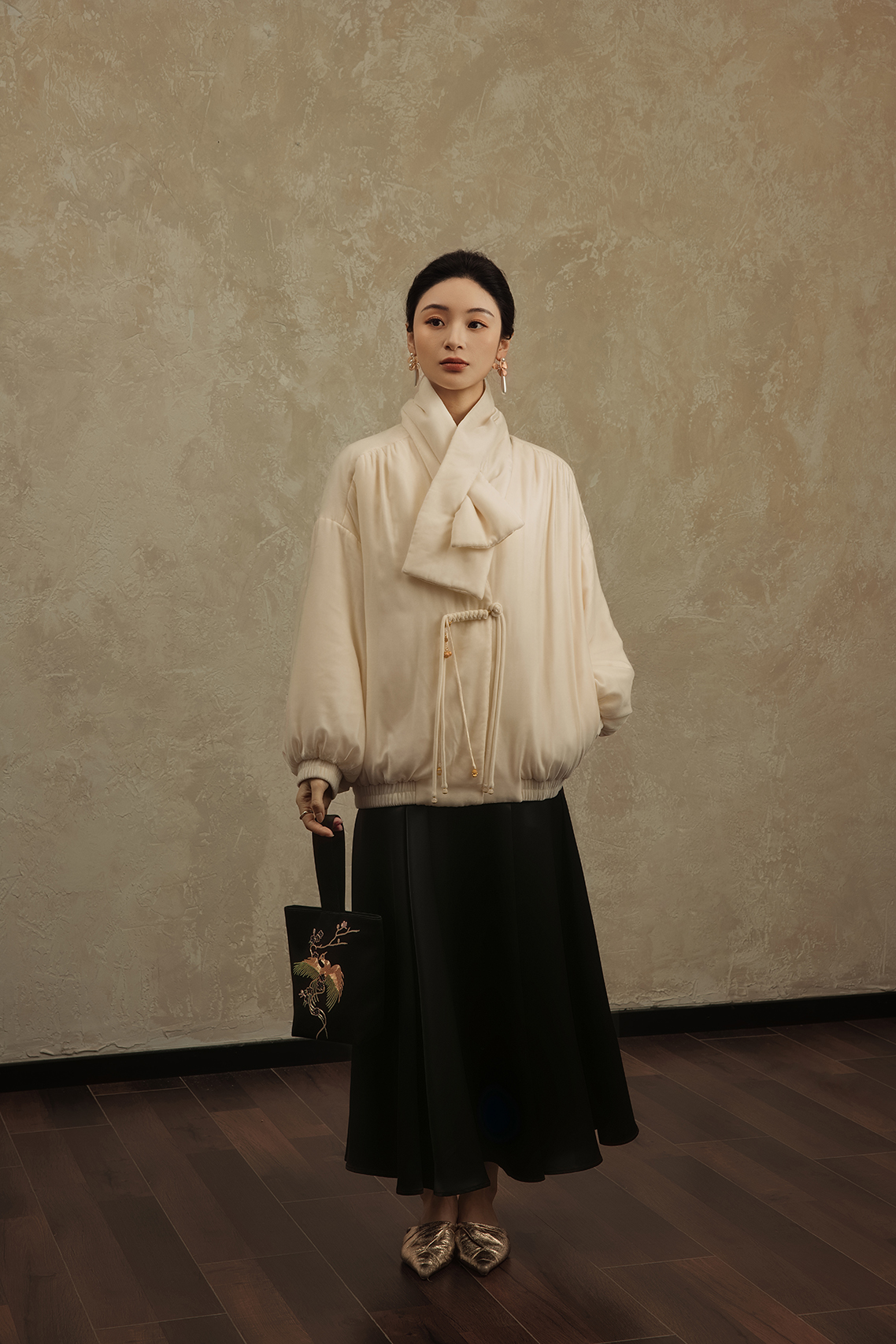 盛唐婧 | 白色丝绒流苏扣夹棉外套(带围巾)