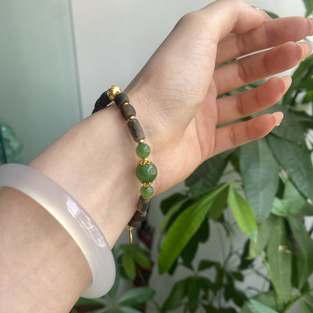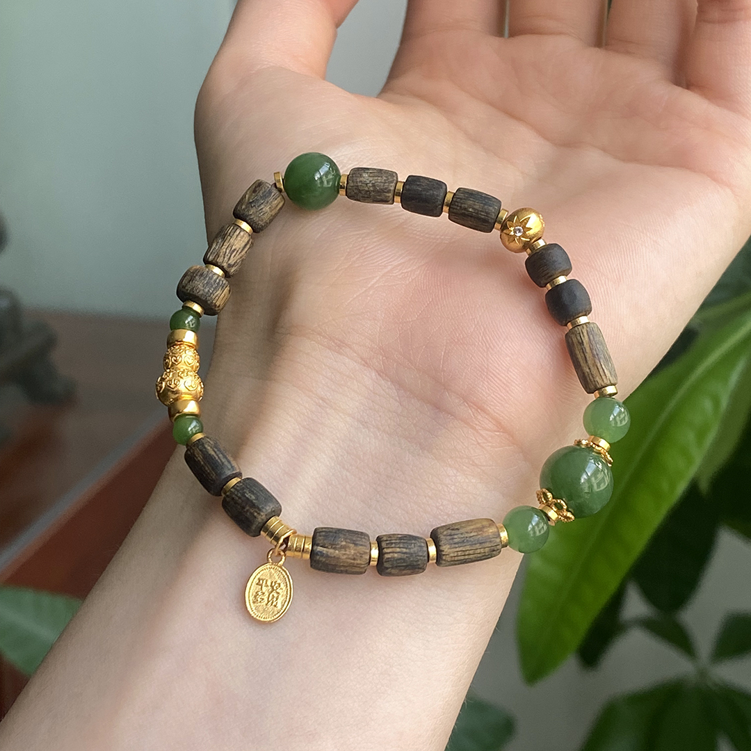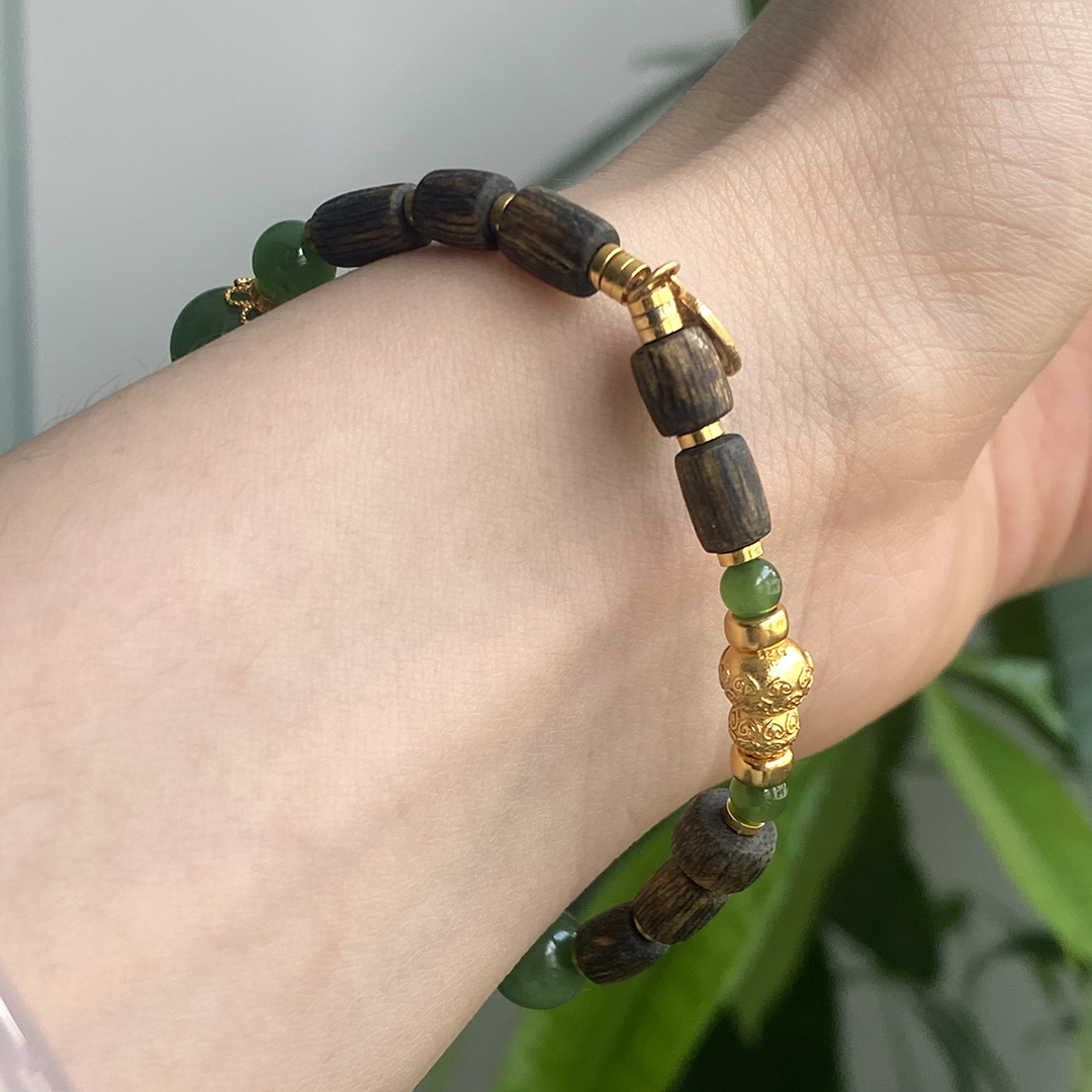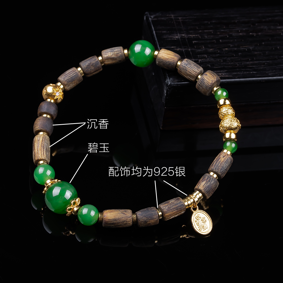 xy0354沉香+碧玉平安多财福禄相伴手串.银,天然沉香桶珠约5*6mm,原色原味,香味自然清甜,古色古香、温文尔雅的国风款式,一枚葫芦、一枚平安多财小提溜,上手非常好看。