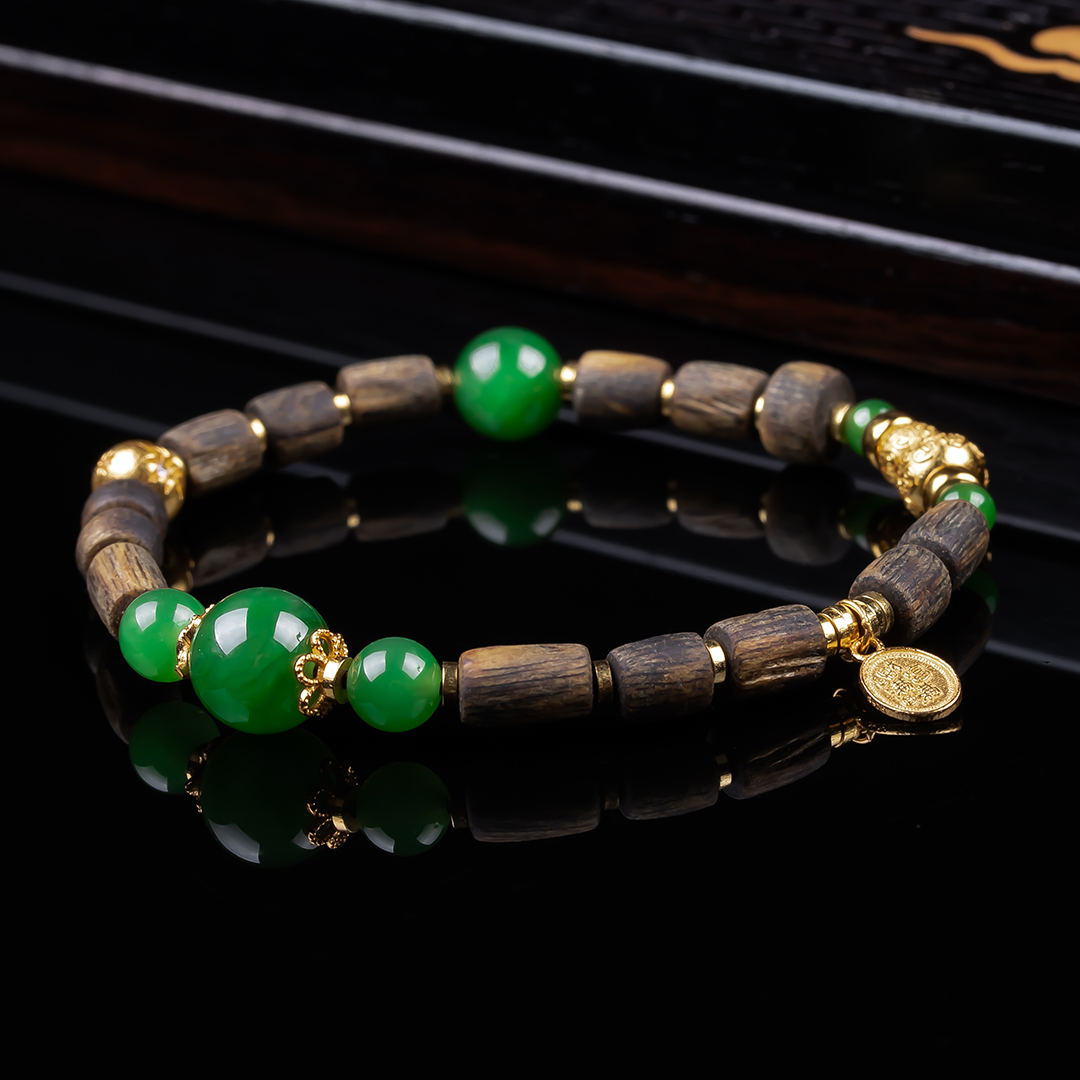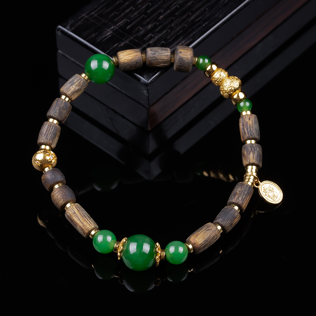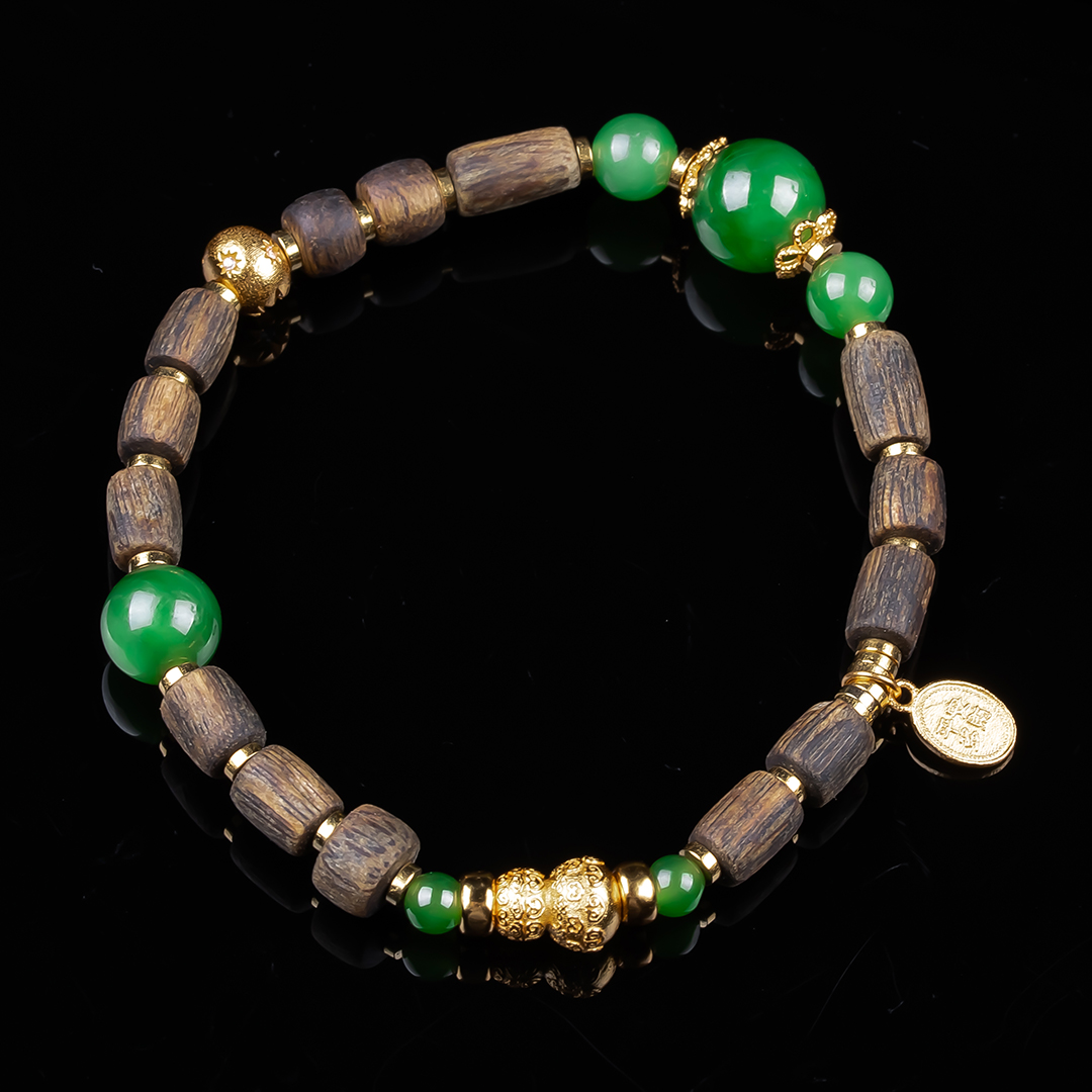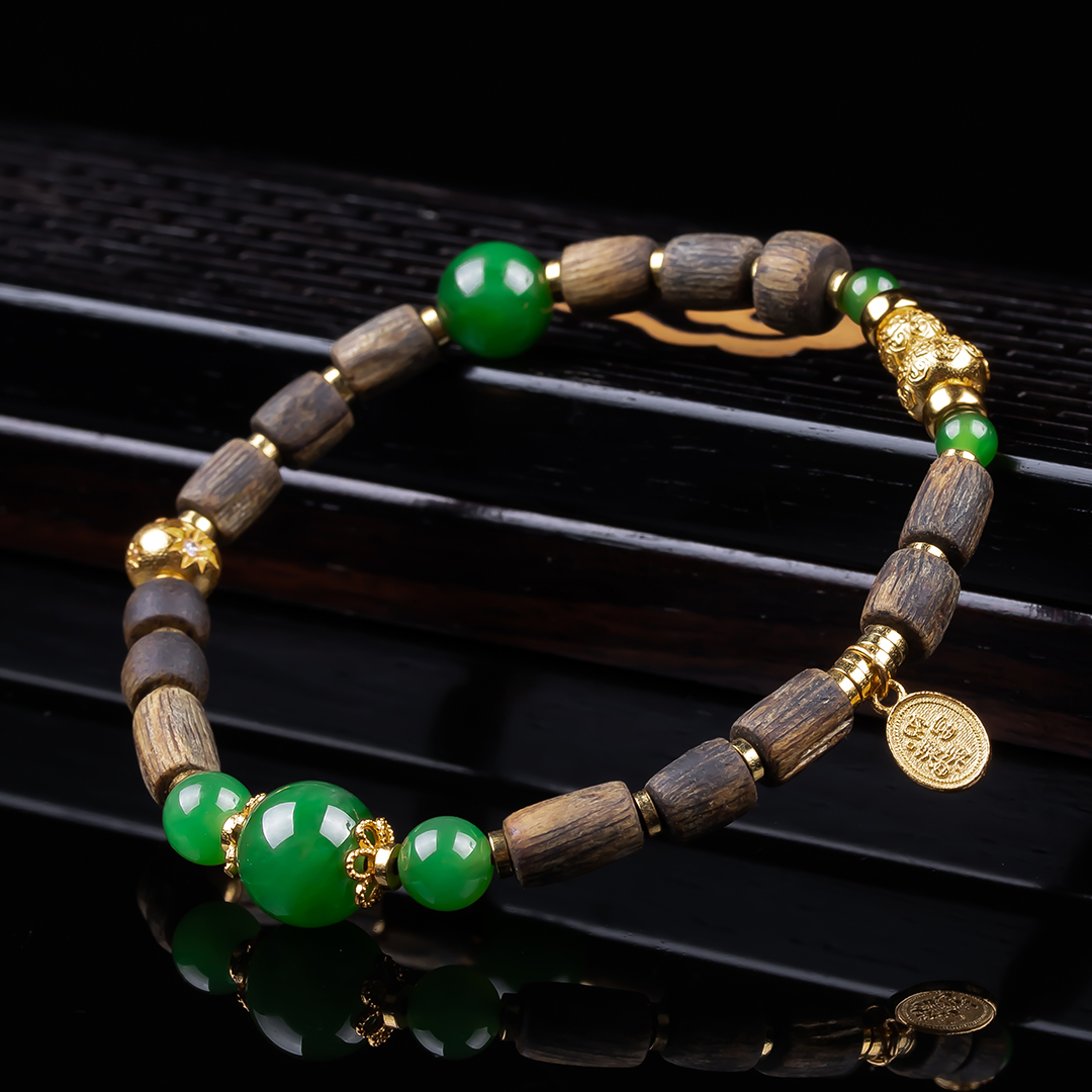 xy0354沉香+碧玉平安多财福禄相伴手串.银,天然沉香桶珠约5*6mm,原色原味,香味自然清甜,古色古香、温文尔雅的国风款式,一枚葫芦、一枚平安多财小提溜,上手非常好看。