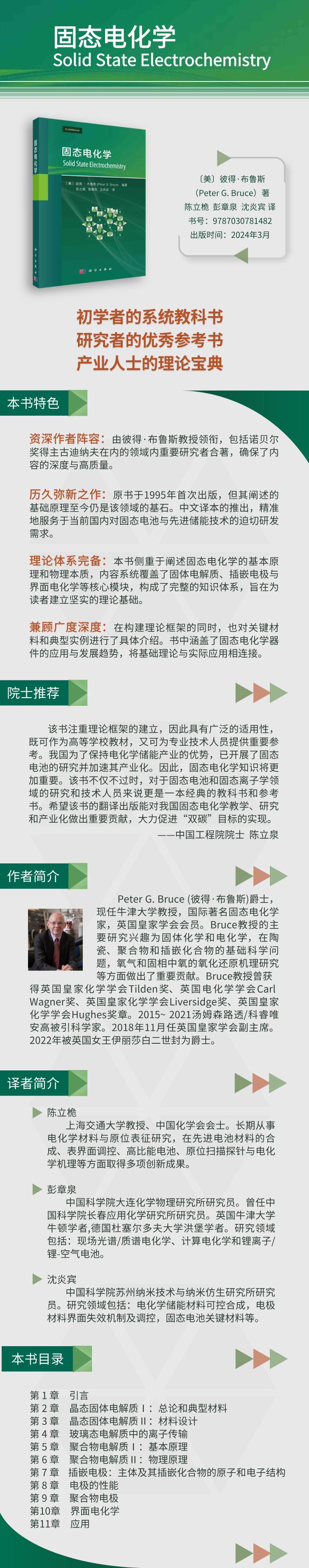 本书共11章,主要介绍固态电化学基础和原理。内容包括无机晶相、玻璃态和聚合物固体电解质结构,离子传输动力学基础理论和设计原则,插嵌电极材料的原子和电子结构,电子和离子在电极中的传输机理,聚合物电极的反应机理和动力学,界面电化学和固态电化学器件等。本书注重固态离子学和电化学基本原理的阐述,同时对一些关键材料和应用实例进行了介绍。
