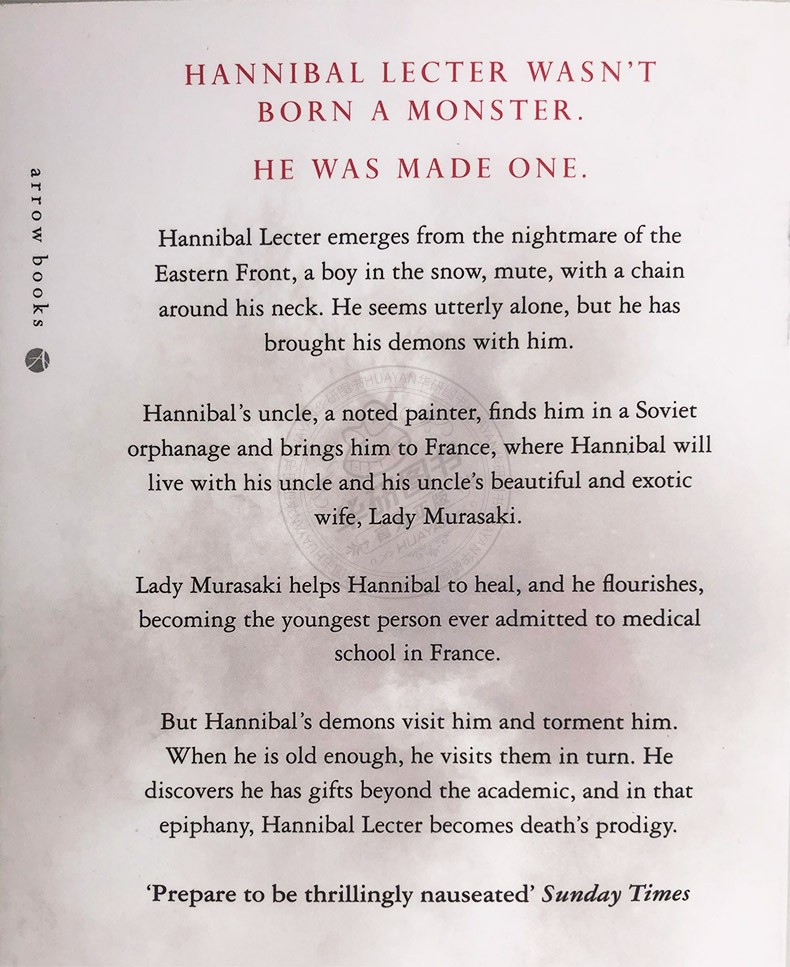 该书旨在发掘主人公汉尼拔的邪恶心理发展史,是汉尼拔故事当中很惊悚的一个。它讲述了一段莱克特童年所遭遇的不幸。战争中失去父母,随后目睹妹妹被人分食,这段回忆彻底改变了少年莱克特的性格。