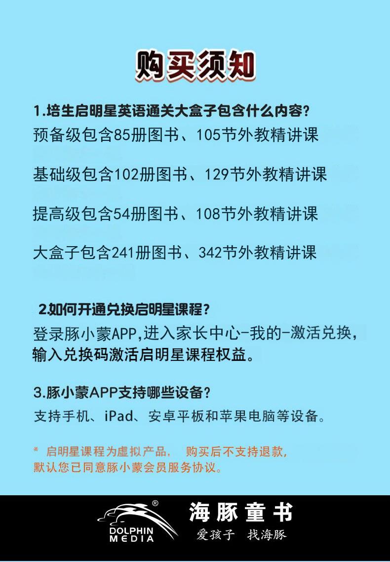 启明星课程为虚拟产品,兑换码发码时间为下单后24小时内发送至下单手机号上,需下载豚小蒙APP后,凭手机号收到的兑换码在APP中兑换,请注意查收短信并及时兑换。