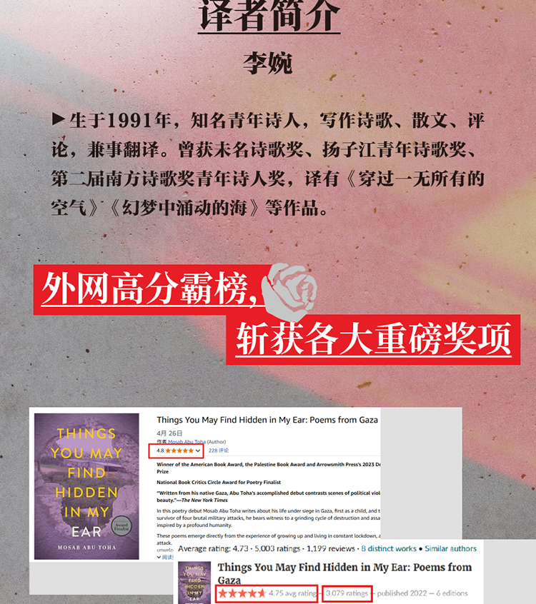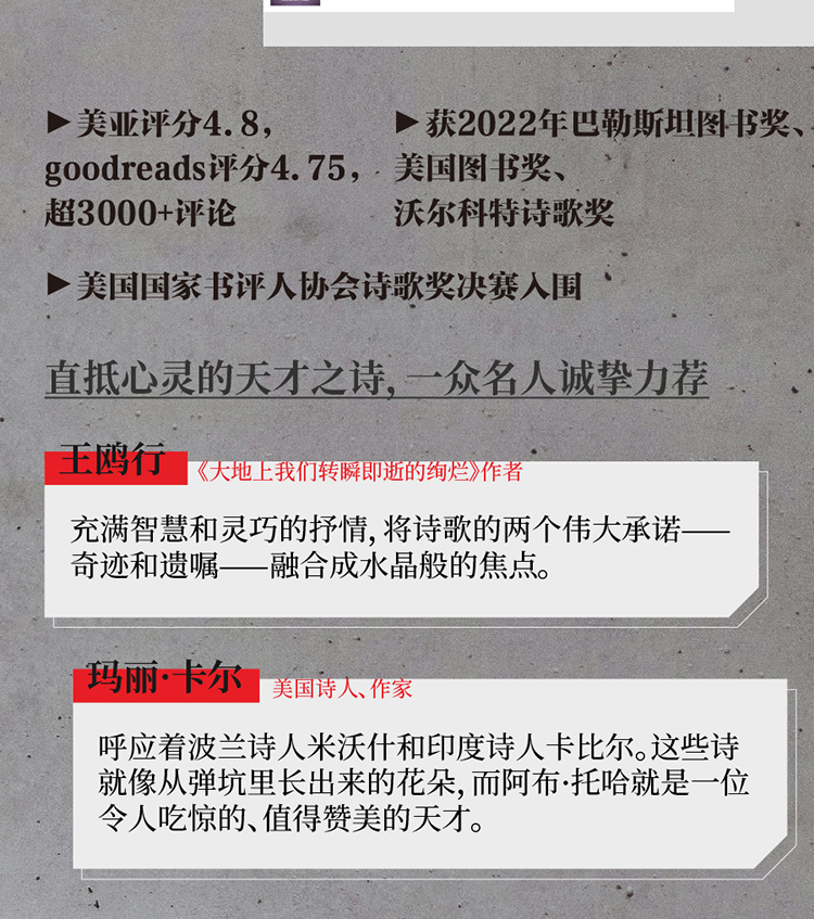 美亚评分4.8,Goodreads评分4.75,获巴勒斯坦图书奖、美国图书奖和沃尔科特诗歌奖,美国国家书评人协会诗歌奖决赛入围。众多名人推荐,媒体盛赞,读者好评如潮。