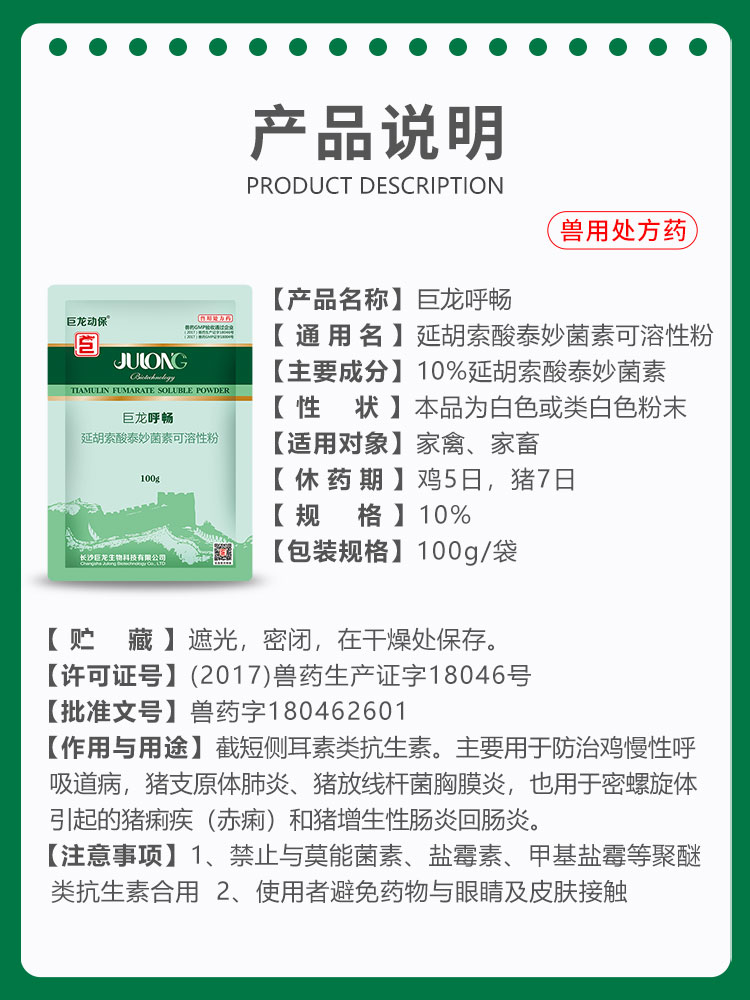 巨龙动保呼畅10%延胡索酸泰妙菌素可溶性粉100g